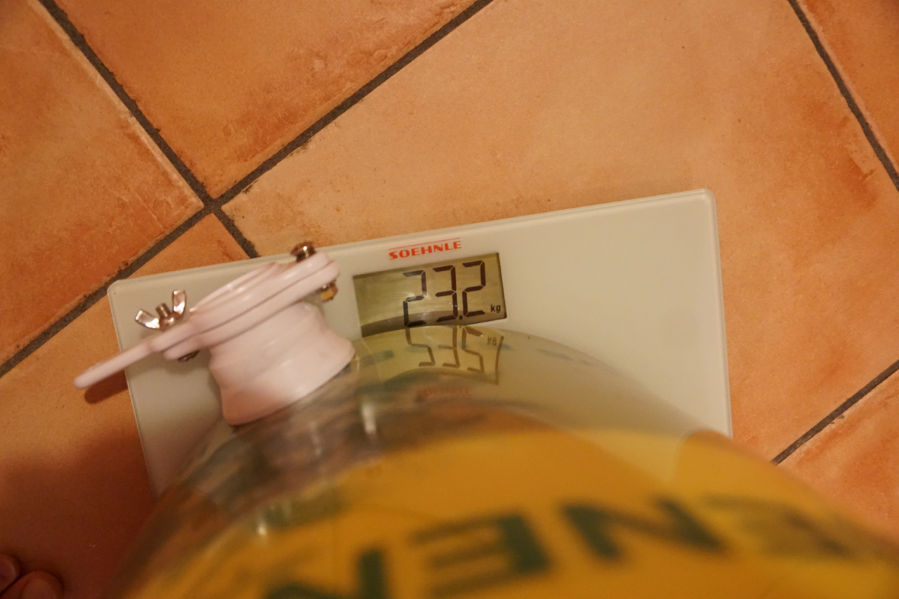 Der spannende Moment, als der Eimer auf die Waage gestellt wurde – abzüglich des Eimers waren es wunderbare 22 Kilo Honig – Yippieh!