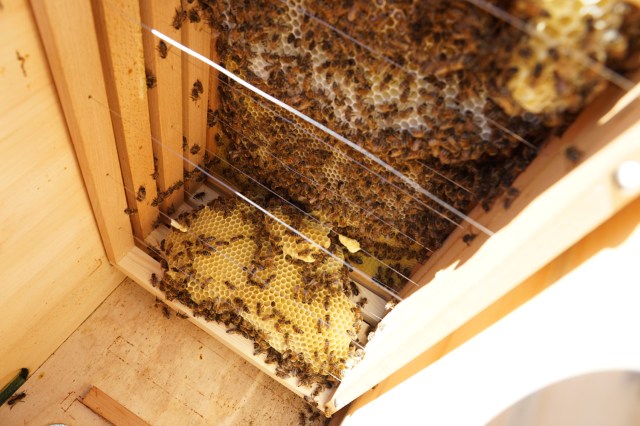 Während die Nachzügler noch einziehen durften, kontrollierte ich kurz das Nachbarvolk von Maria I.. Das ergab ein sehr erfreuliches Bild. Der Honigraum war schon wieder ganz gut gefüllt, das Brutnest sah sehr gut aus, und die Königin selbst zeigte sich auch sehr schön! Seit der ersten Sichtung am 9. Juni hatte sie sich prächtig entwickelt!