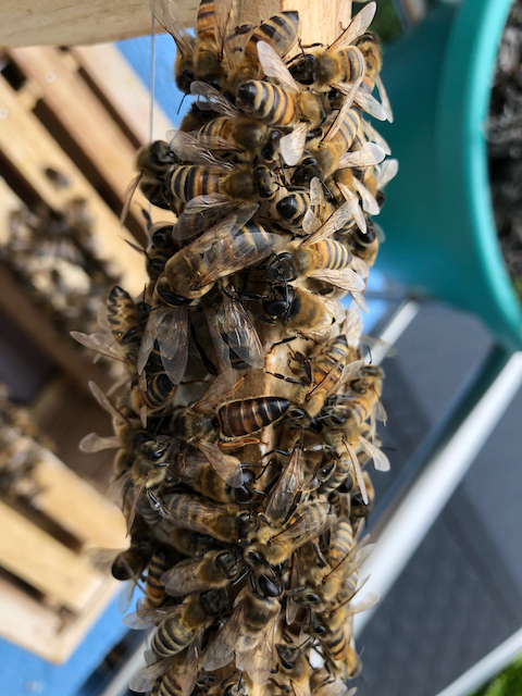 Wie im letzten Eintrag schon erwähnt, durfte der Schwarm vom Samstag gestern noch schnell in die freie Hälfte der großen ERB an der Montessorischule einziehen. Die ERB wurde dazu kurzfristig wieder zu ein ZRB (Zweiraumbeute ;)) umfunktioniert, indem ich zwei leere Futterwaben vom verbliebenen Volk herausnahm und stattdessen wieder ein bienendichtes Schied einsetzte, so dass die beiden Parteien keinen Kontakt innerhalb der Beute hatten. Die kurze Kontrolle der Brutwaben ergab immer noch das gleiche Bild mit Mehrfachbestiftung und unsauber gelegten Eiern. Und sehr wenigen Arbeiterinnen. Dank des Schwarms konnte ich aber nun die Entwicklung in aller Ruhe abwarten und gegebenenfalls das drohnenbrütige Volk in einiger Entfernung abfegen (in der Hoffnung, dass eventuell eierlegende Arbeiterinnen nicht wieder zurückfinden würden) und mit dem großen neuen Schwarm vereinen.