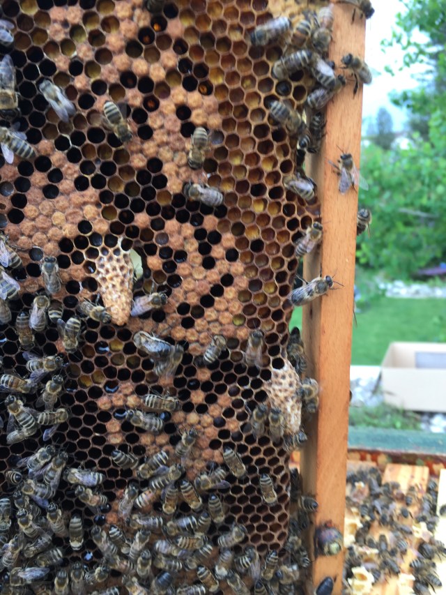 Die Bienen konnten heuer kaum ausfliegen und hatten dafür aber wohl im Kollektiv beschlossen, dass statt Honig nun halt neue Königinnen produziert werden sollten. Am 20. Mai erlaubte es mir die Witterung endlich einmal eine Durchsicht zu machen, und prompt schauten mir in vielen Beuten die Weiselzellen entgegen, beim grünen Volk auch schon gleich verdeckelt:
