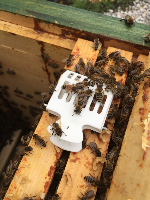 Am nächsten Tag habe ich dann zunächst die Schwarmzellen beim Pollenvolk bis auf eine schöne, große und gut umsorgte entfernt. (Eine ganze Weile später stellte sich dann heraus, dass das so nicht ganz stimmte, die kleinen Schlawiner hatten nämlich (zum allerersten Mal überhaupt) noch zwei Stück oben in den Honigraum hineinversteckt. Notiz an mich selbst – in Zukunft Honigraum immer mitkontrollieren!).