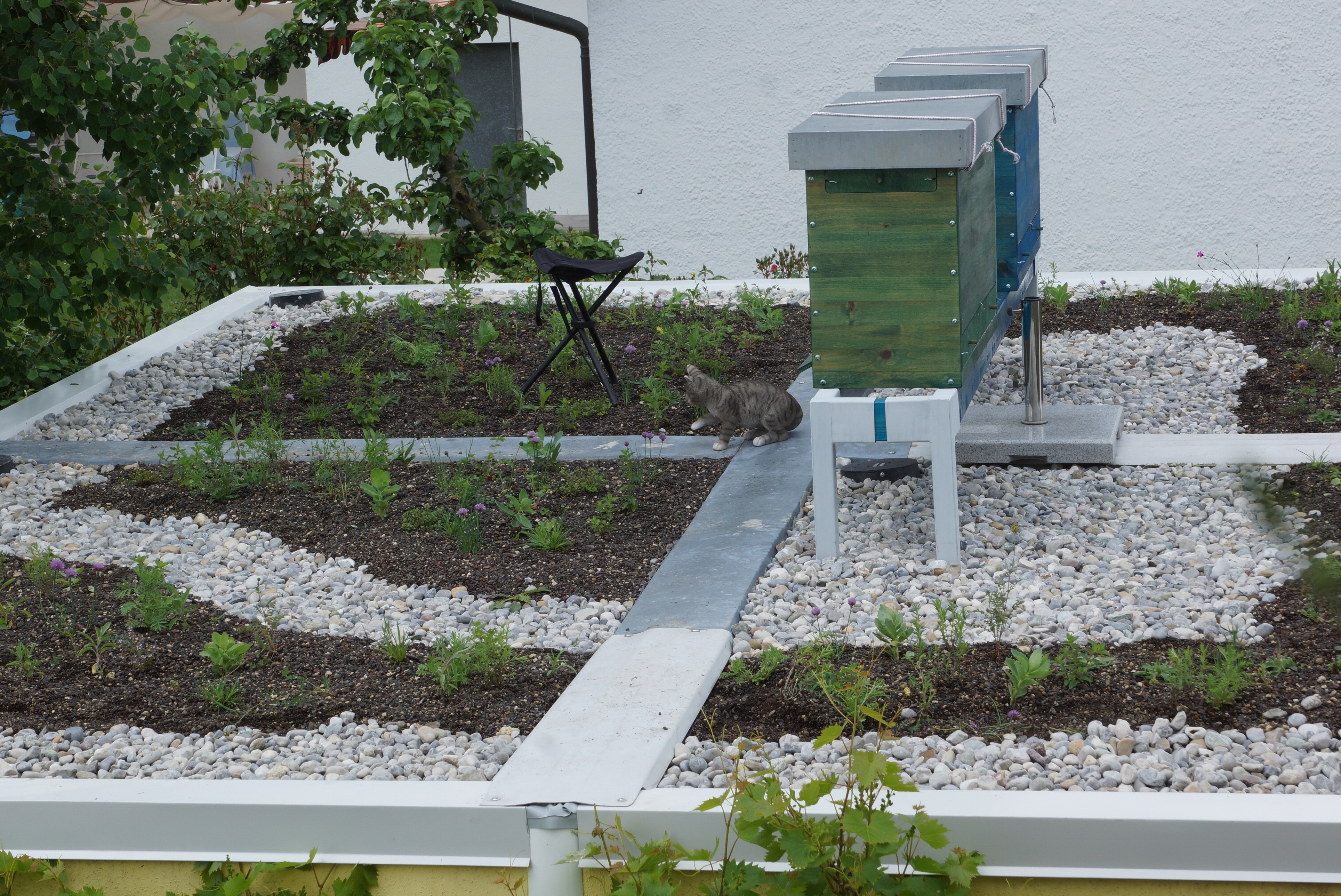 Wie man hier sehen kann, fängt die Dachbegrünung auch ganz langsam an, ihrem Namen gerecht zu werden – und sogar ein paar erste Blüten zeigen sich. Gestern wurde auch endlich die Blechumrandung geliefert und montiert. Ich war doch erstaunt, dass die Bienen so friedlich waren, immerhin haben die beiden Monteure trotz meines dezenten Hinweises keine zwei Meter vor dem Flugloch die Bleche lautstark zurecht geflext.