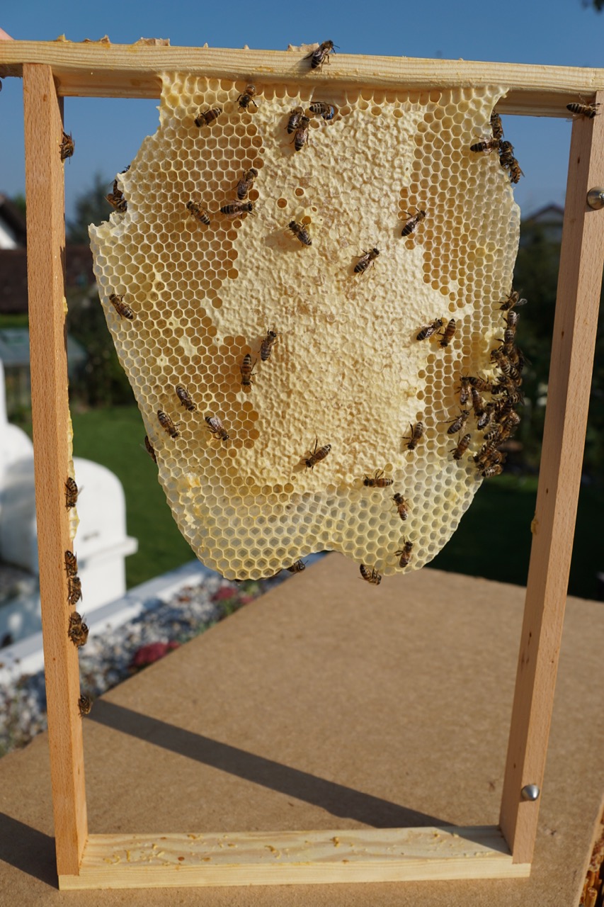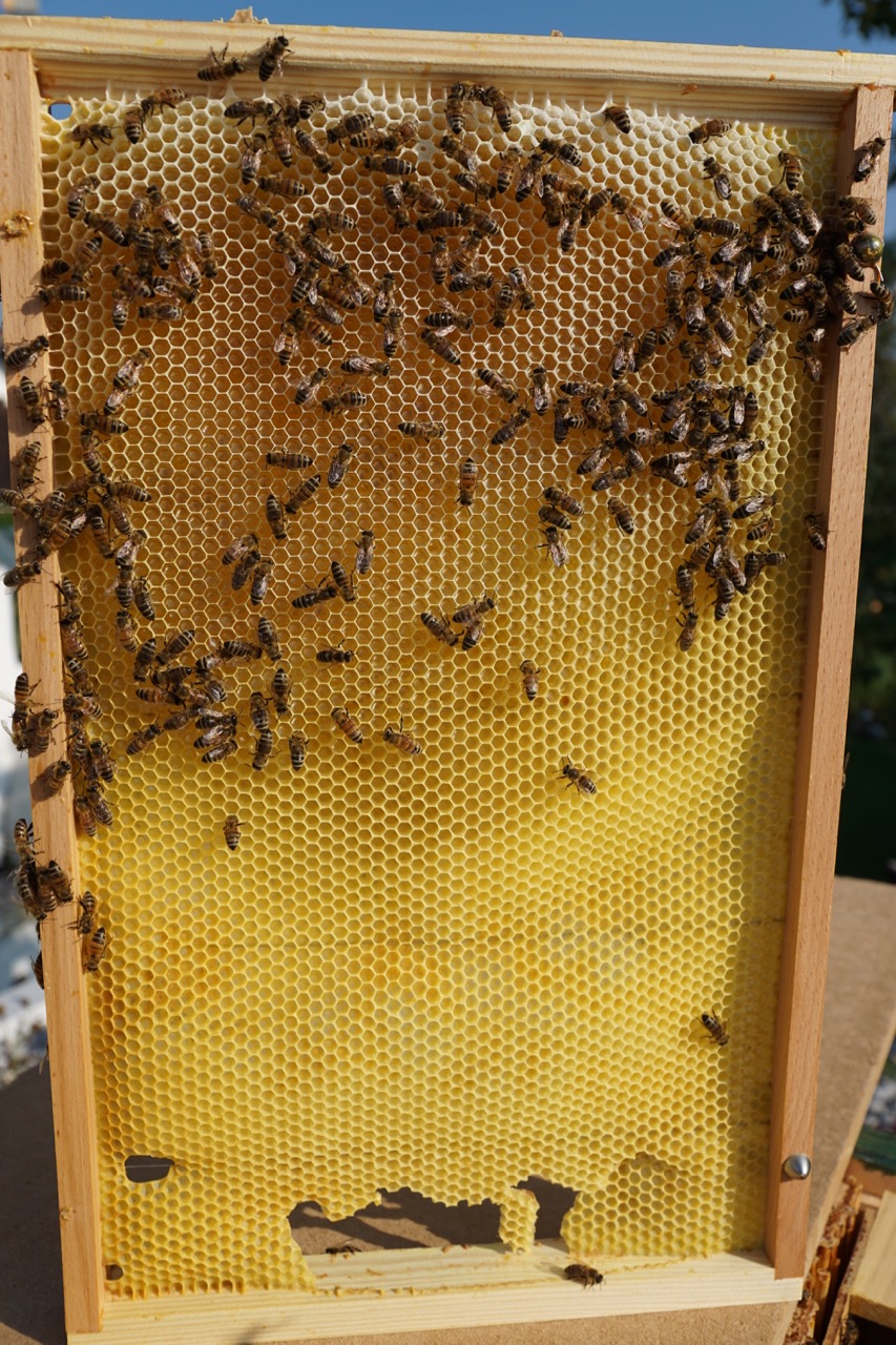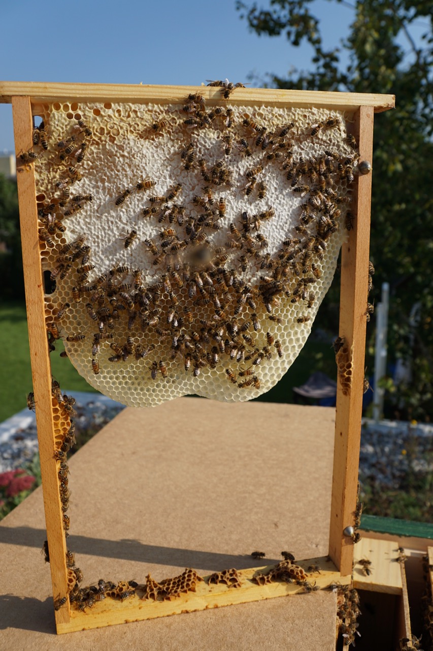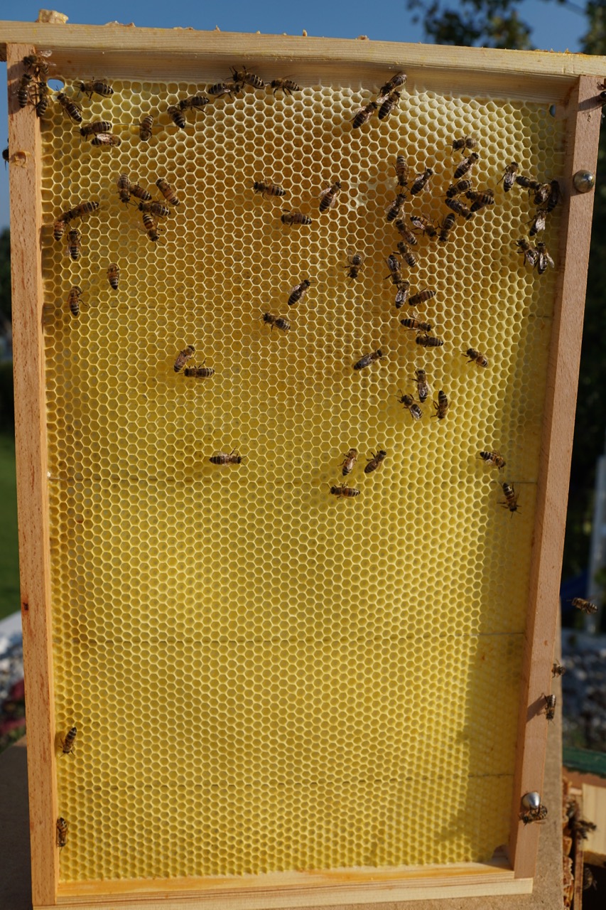 Wir haben den Bienen ein ausgebautes Rähmchen an Position 2 ans Brutnest gehängt, und ein leeres Rähmchen (mit einem bereits angefangenen Streifen oben) hinter das Brutnest in Richtung Schied, das sie jetzt ausbauen können.
