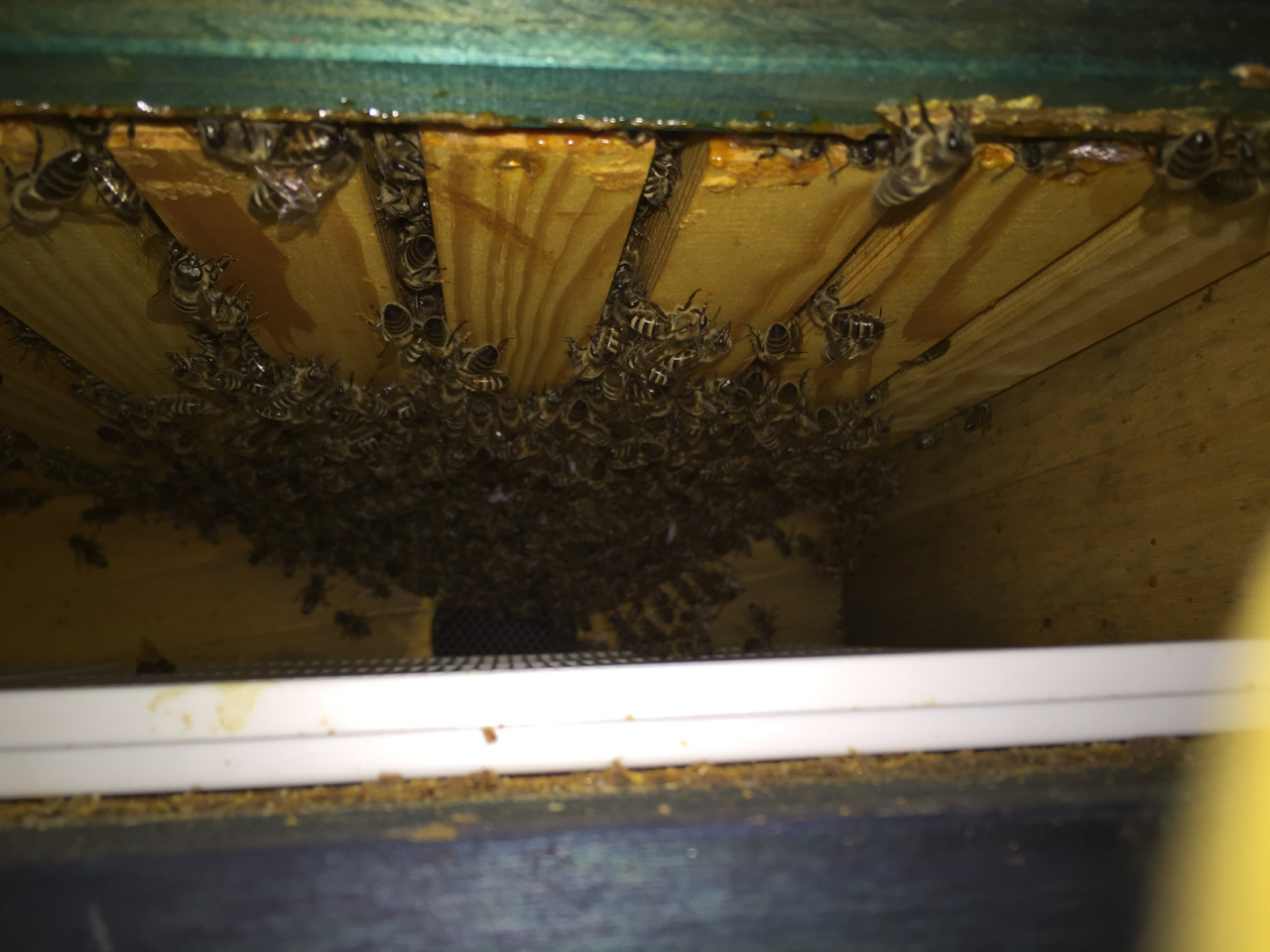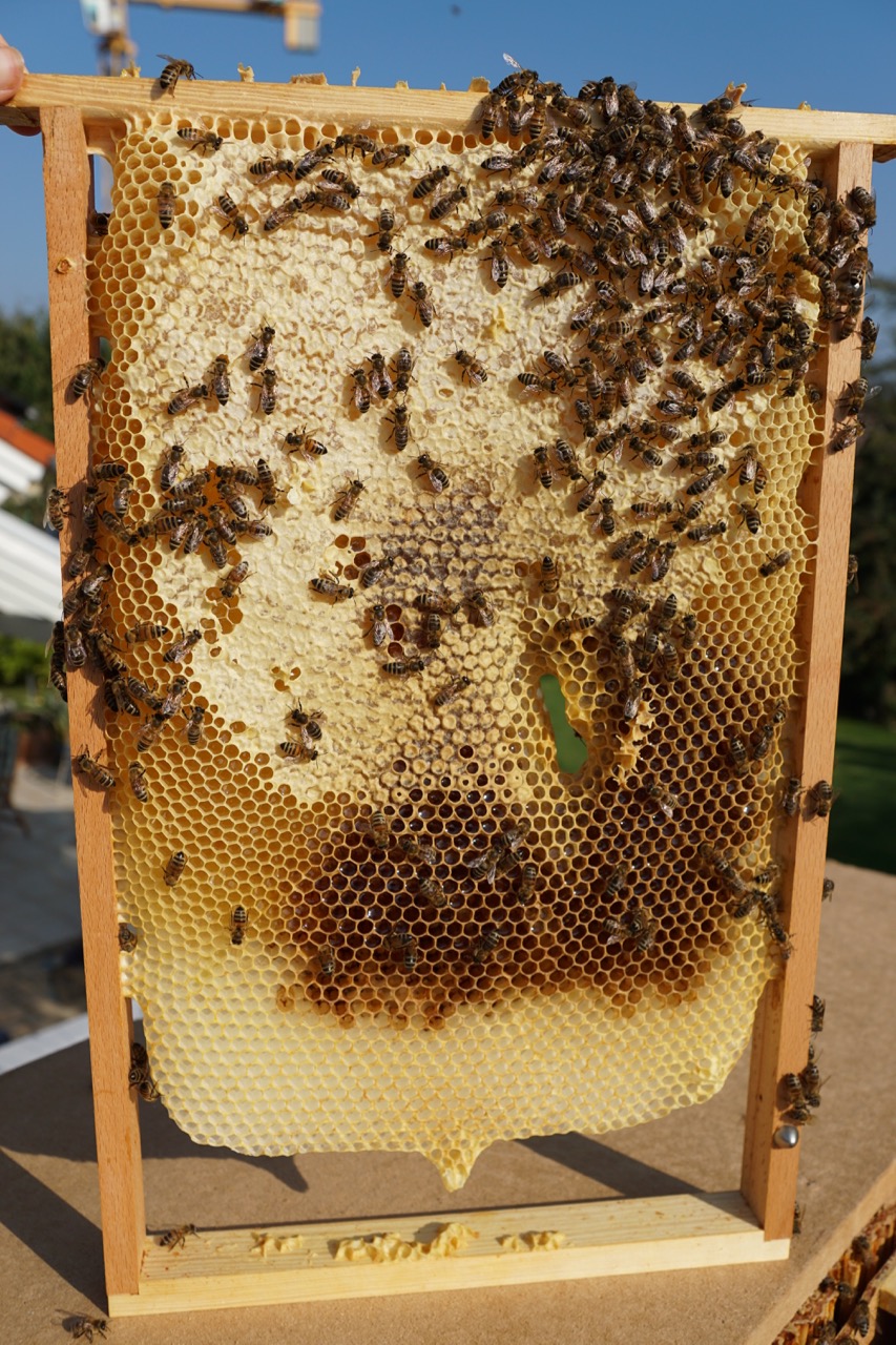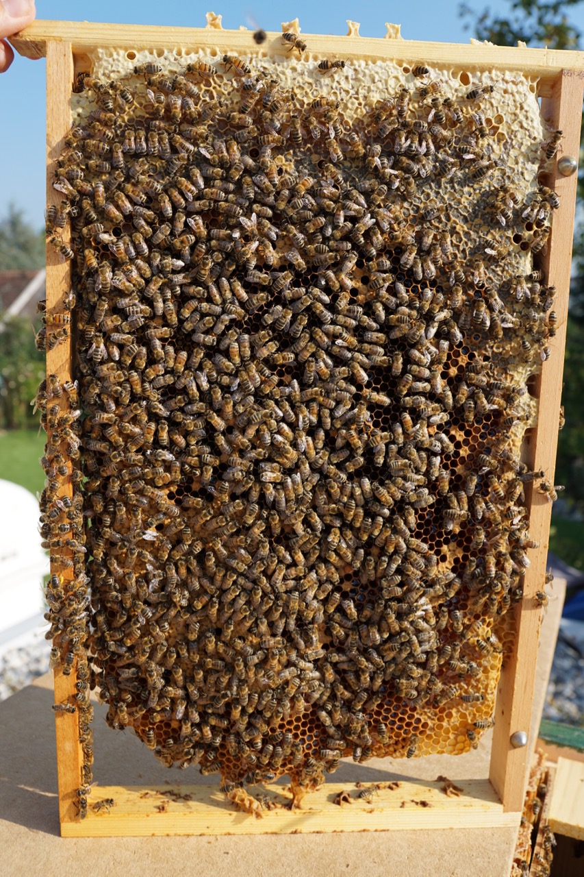 Wir haben den Bienen ein ausgebautes Rähmchen an Position 2 ans Brutnest gehängt, und ein leeres Rähmchen (mit einem bereits angefangenen Streifen oben) hinter das Brutnest in Richtung Schied, das sie jetzt ausbauen können.