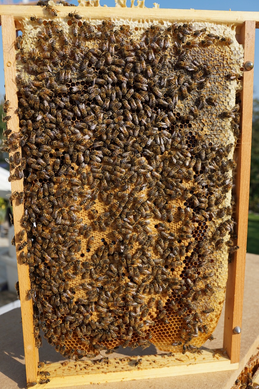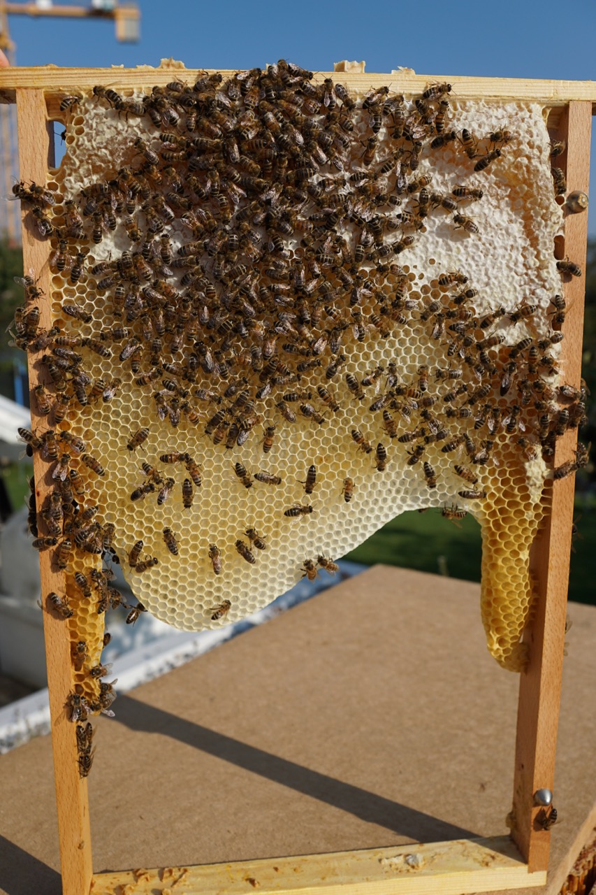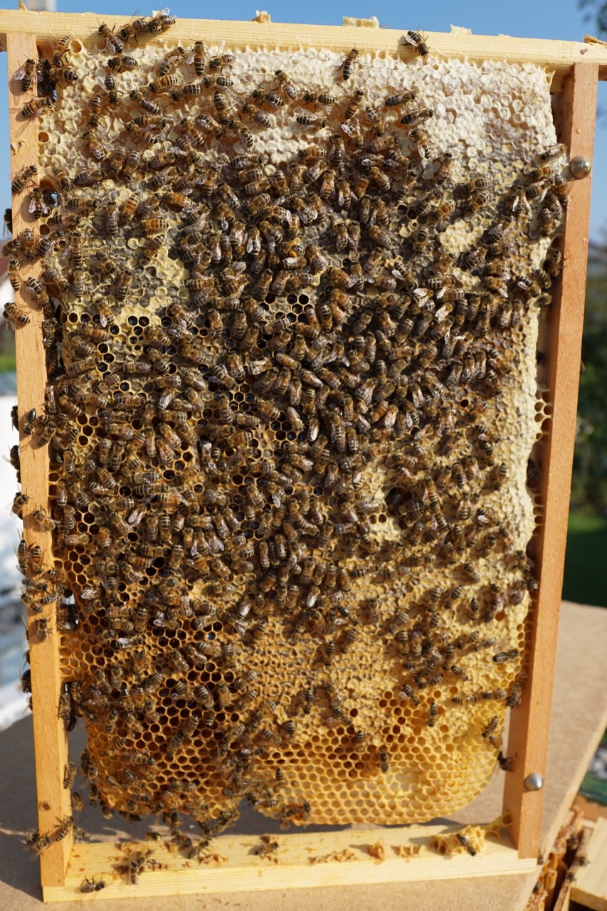 Sie haben ihr Brutnest schön vergrößert und angefangen, Nektar einzulagern (am linken Wabenrand sieht man es schön glitzern in den Zellen).