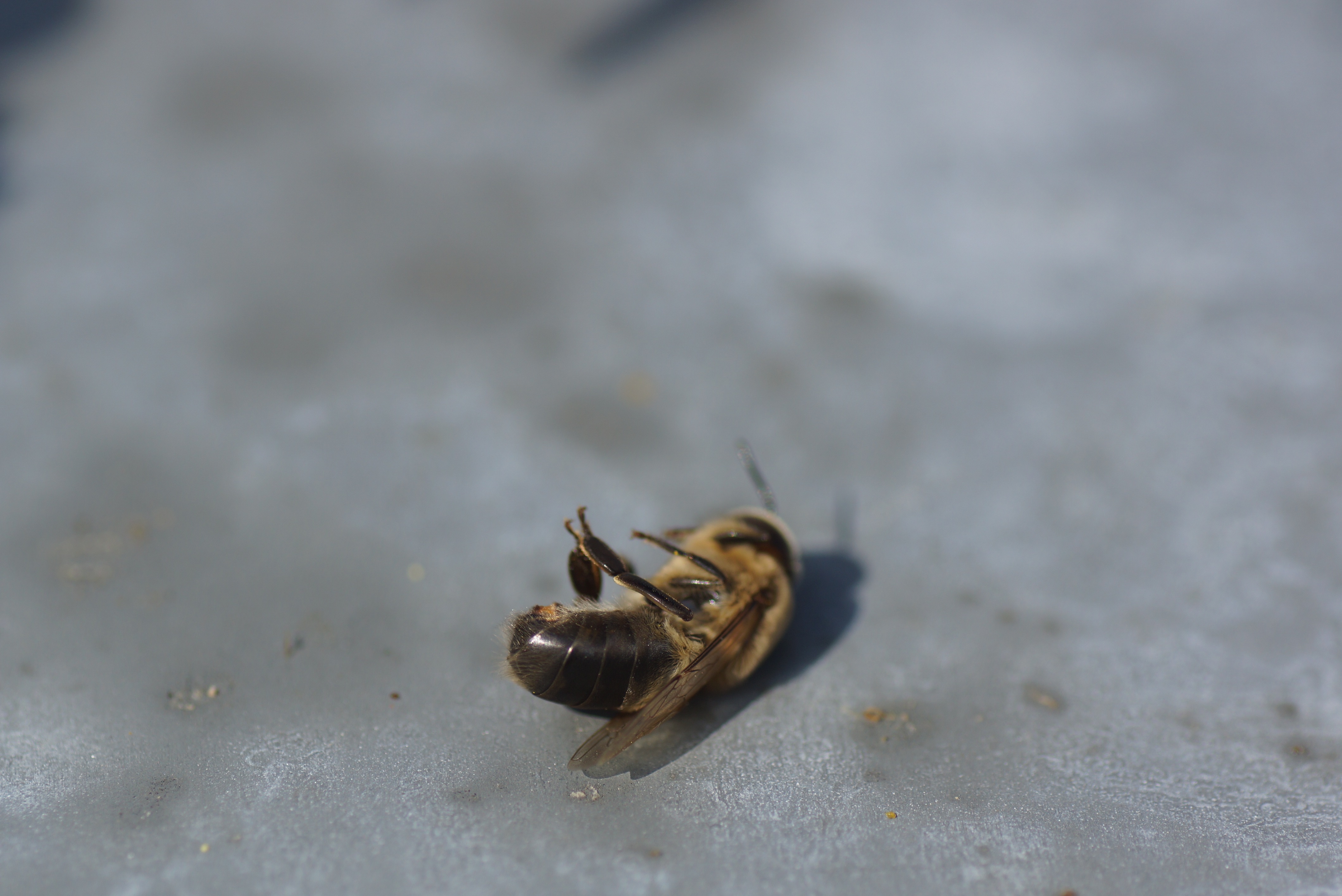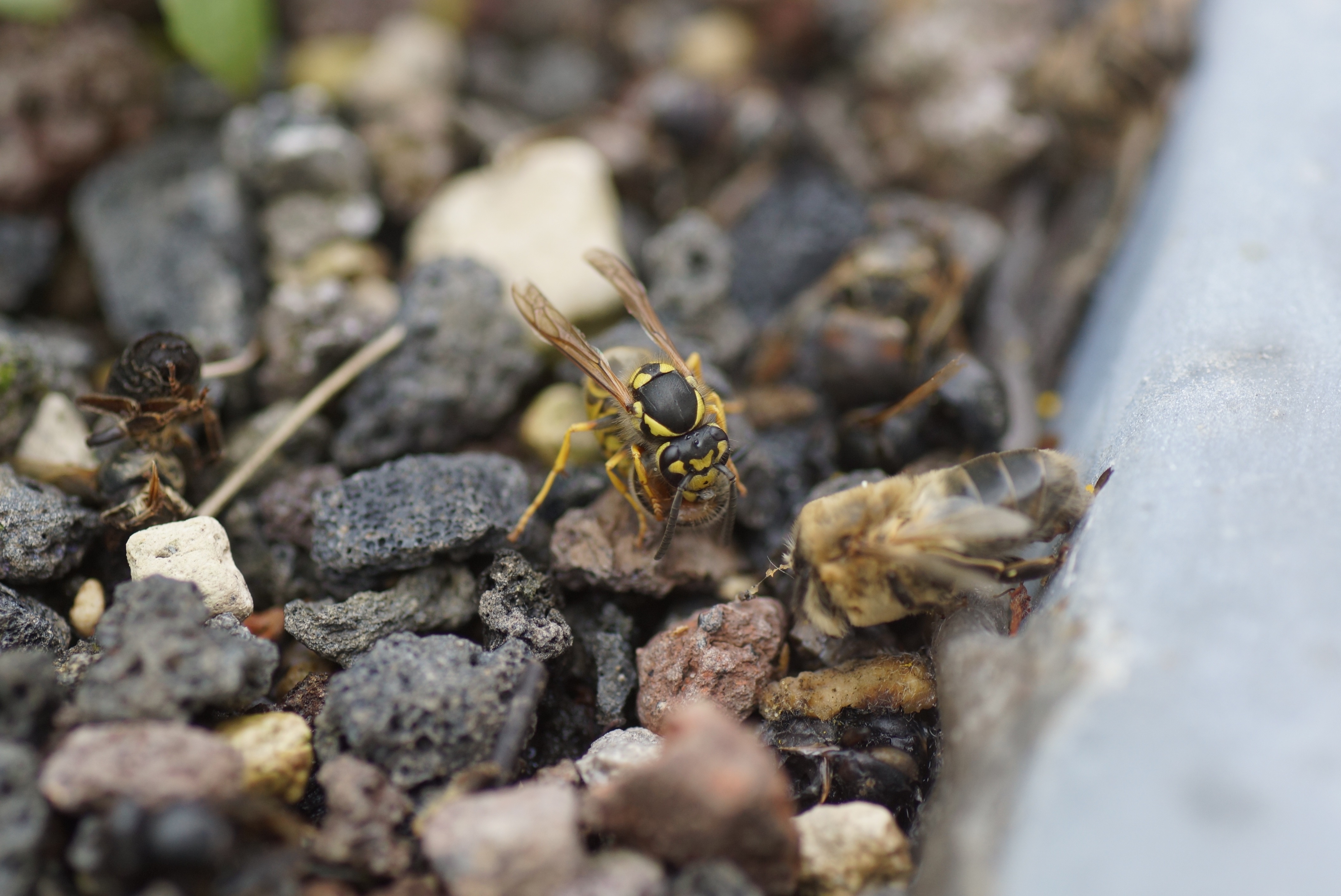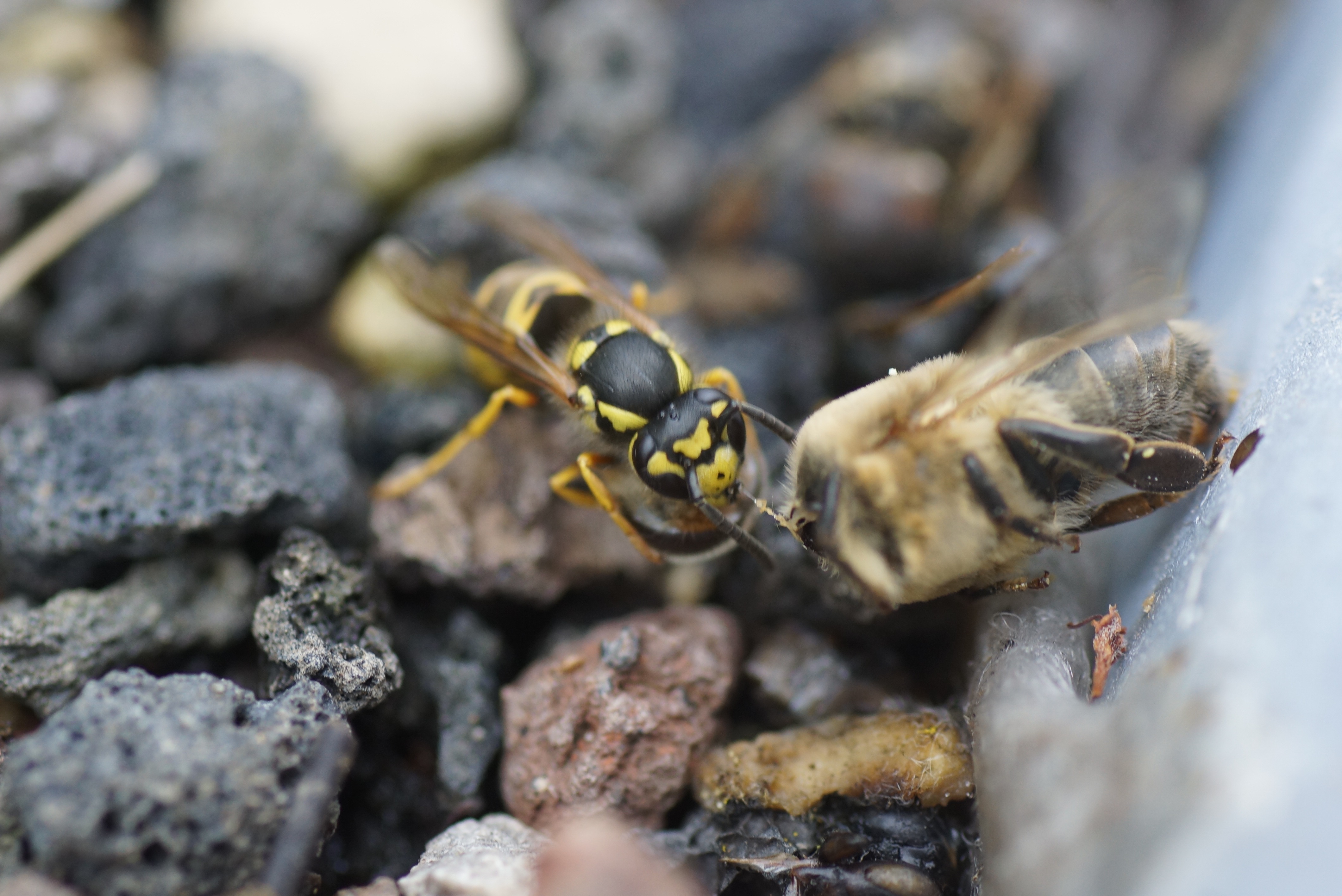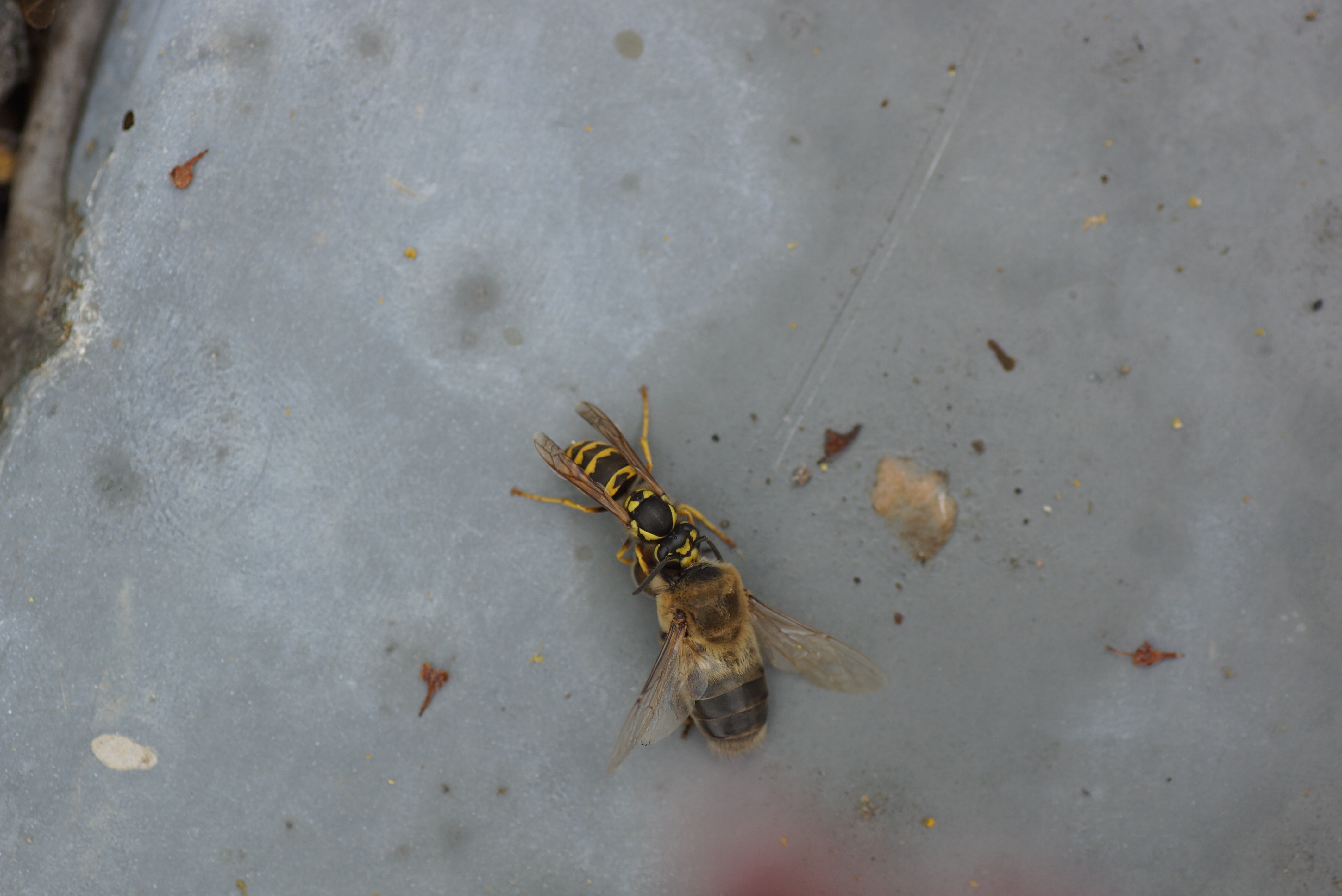 Doch wie es in der Regel so ist, lässt die Natur nichts verkommen. Der Drohn hatte noch nicht einmal seinen letzten Atemzug gehaucht, schon begann sein Recycling. Eine Wespe, die nun wegen der verkleinerten Fluglöcher nicht mehr billig an unseren Honig rankam, hat umgehend begonnen, ihn zu zerlegen. Es war schon ein wenig erschreckend, wie ein so kleines Insekt dem Drohn innerhalb von geschätzt knapp zwei Minuten den Kopf abgetrennt hat!