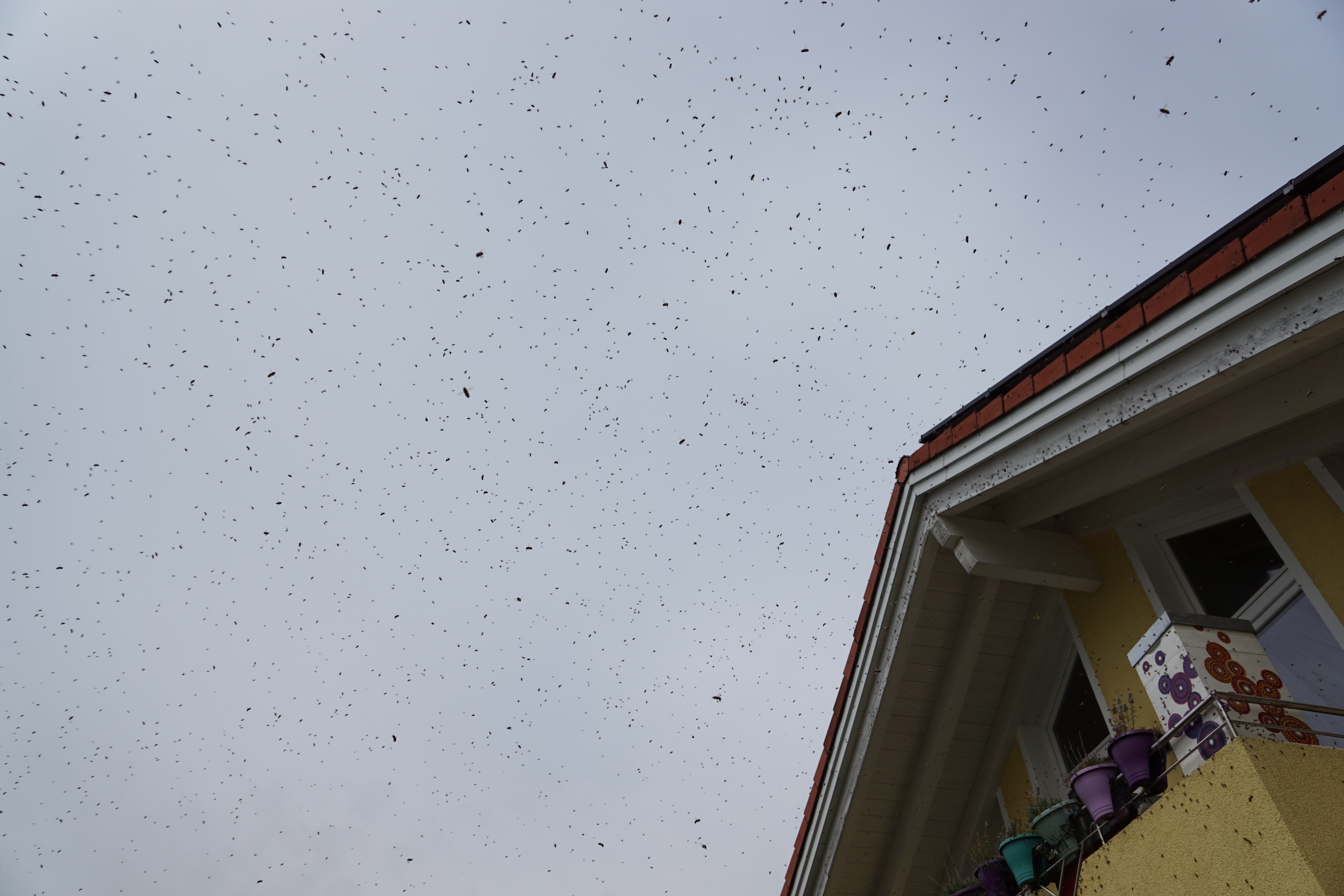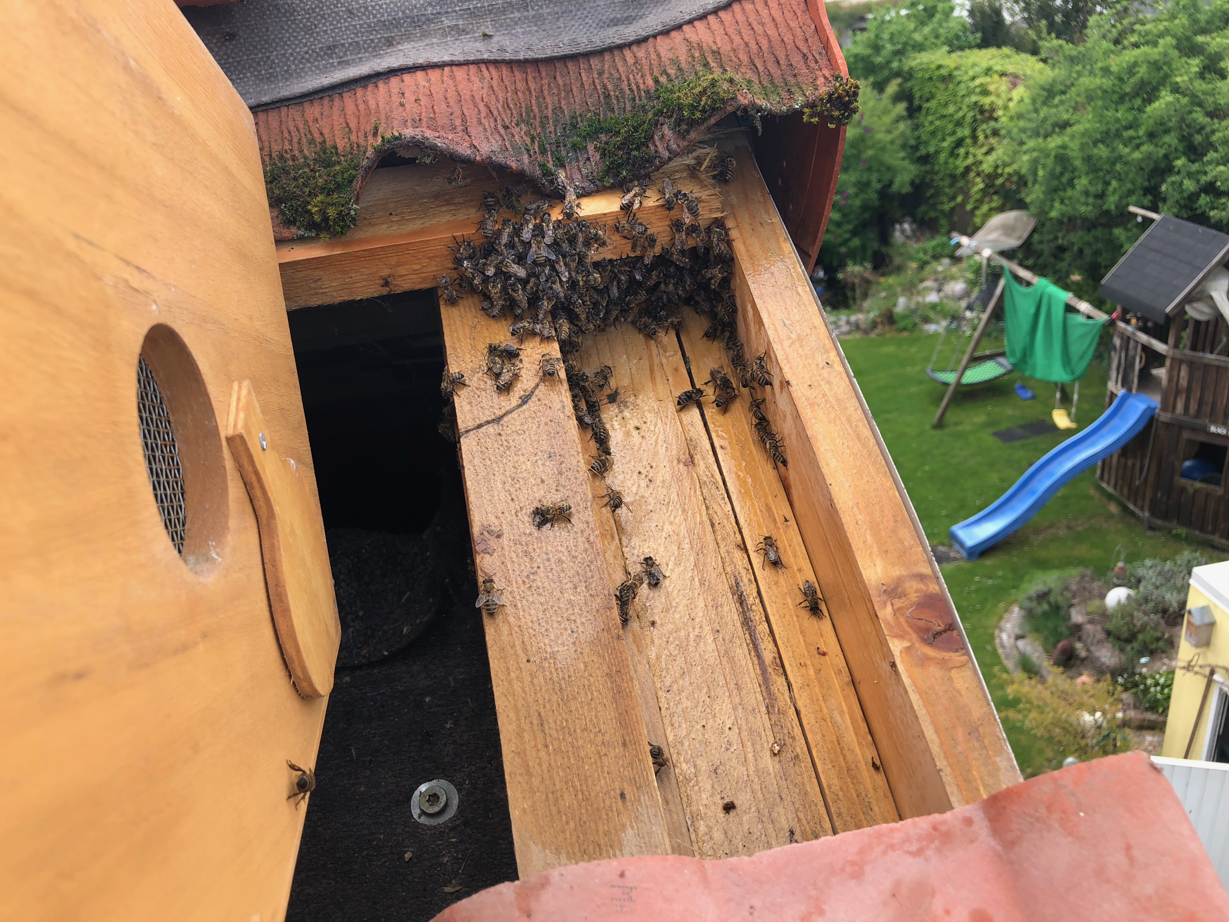 Ich hatte noch von keinem der angeschriebenen Königinnenzüchter eine positive Rückmeldung bekommen, und so war es ein kleines Wunder, dass ich diesen riesigen Schwarm fangen durfte. Er darf nun in die königinnenlose Beute einziehen und dann mit dem höchstwahrscheinlich weisellosen Volk vereint werden. Rettung in der Not und keine enttäuschten Kinder, dass eines der Völker aufgelöst werden muss! Yippie!