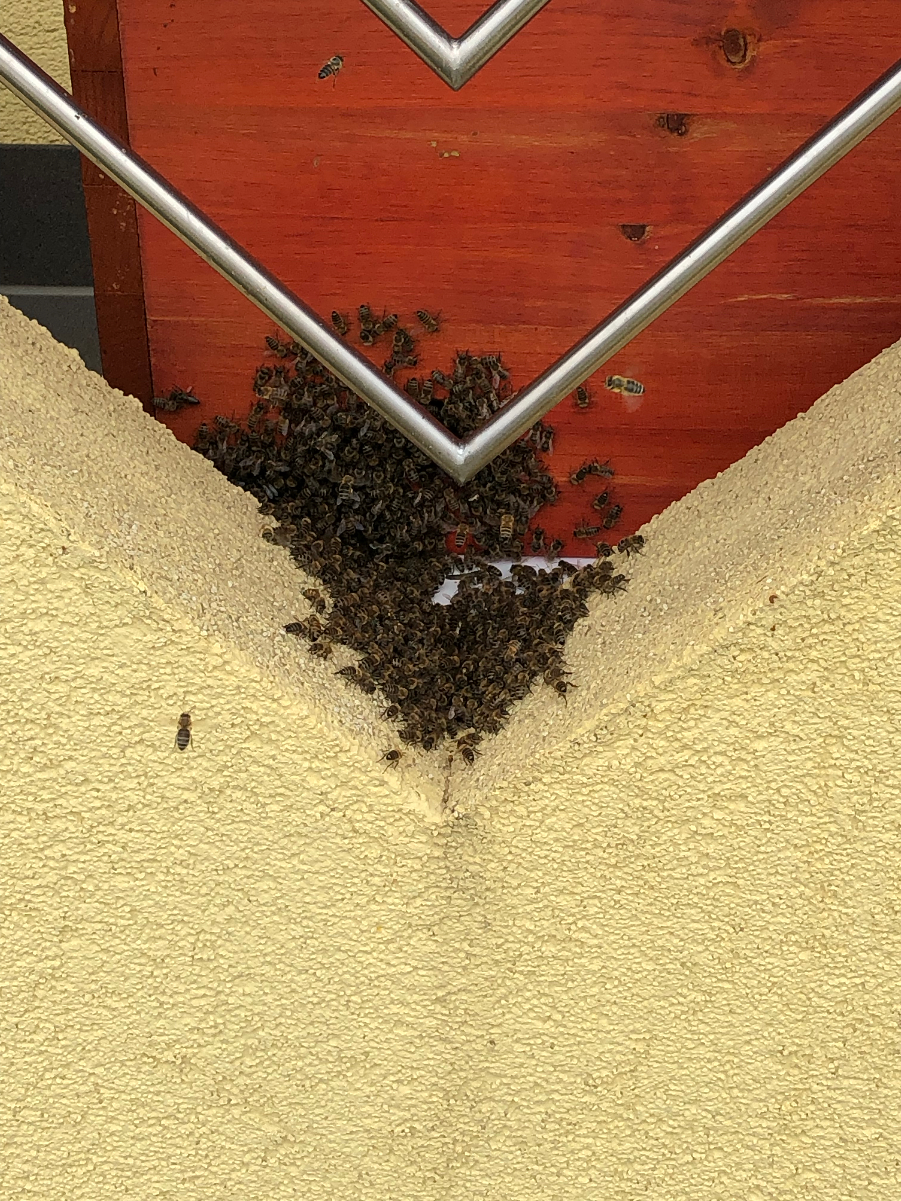 Gestern wurde ich über die lokale Facebookgruppe über einen Bienenschwarm im Ort informiert – gar nicht mal so weit weg vom Schulbienenstand.(Erster Gedanke – oh Gott, bitte nicht noch ein Nachschwarm von uns! Zweiter Gedanke – nicht schon wieder, wenn abends Freunde zum Pizzabacken kommen! Gottseidank hatte ich den Teig schon gleich in der Früh fertig gemacht). Vor Ort bei einer sehr netten Familie war aber schnell klar, das dieser große „Klopper“ von einem Schwarm nie im Leben ein Nachschwarm von einem der Montevölker sein konnte!