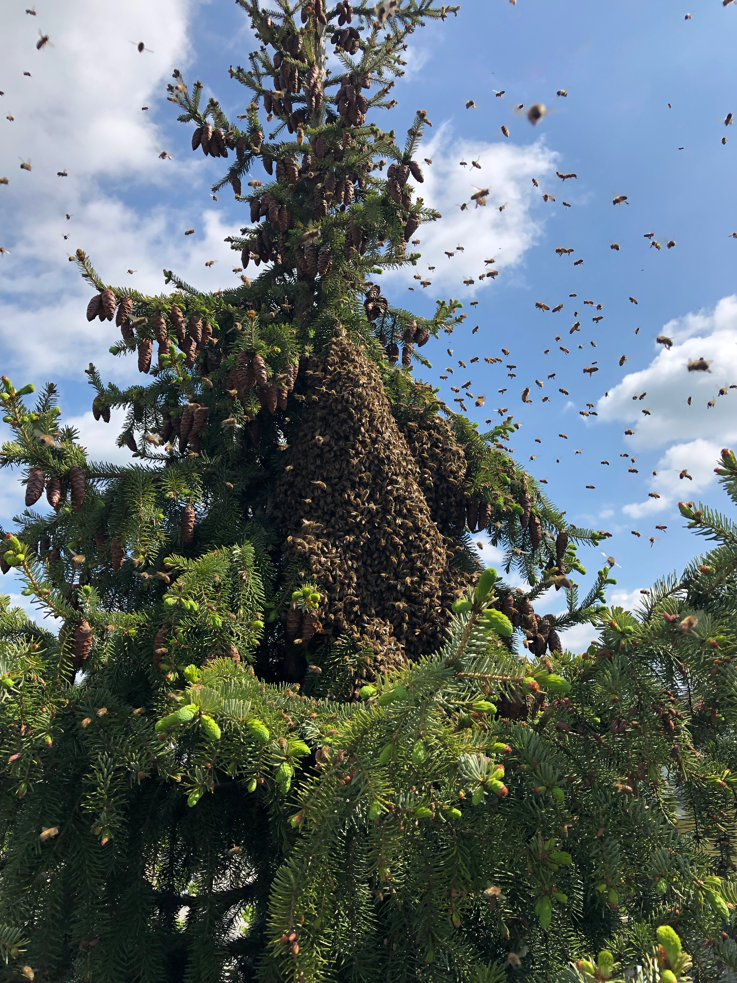 Unser Nachbar kam uns auf halbem Weg in seinen Garten schon entgegen, weil er das laute Brausen auch gehört hatte (und netterweise auch immer in der Schwarmsaison ein Auge auf unsere Beuten hat). Innerhalb kürzester Zeit konnten wir in der hohen Hecke oben im Holunder eine Stelle erkennen, an der sich die Bienen zu sammeln begannen. Und Ruckzuck hatten sie zwei schöne dicke Trauben ganz nah beieinander gebildet – hier ein paar Momentaufnahmen:
