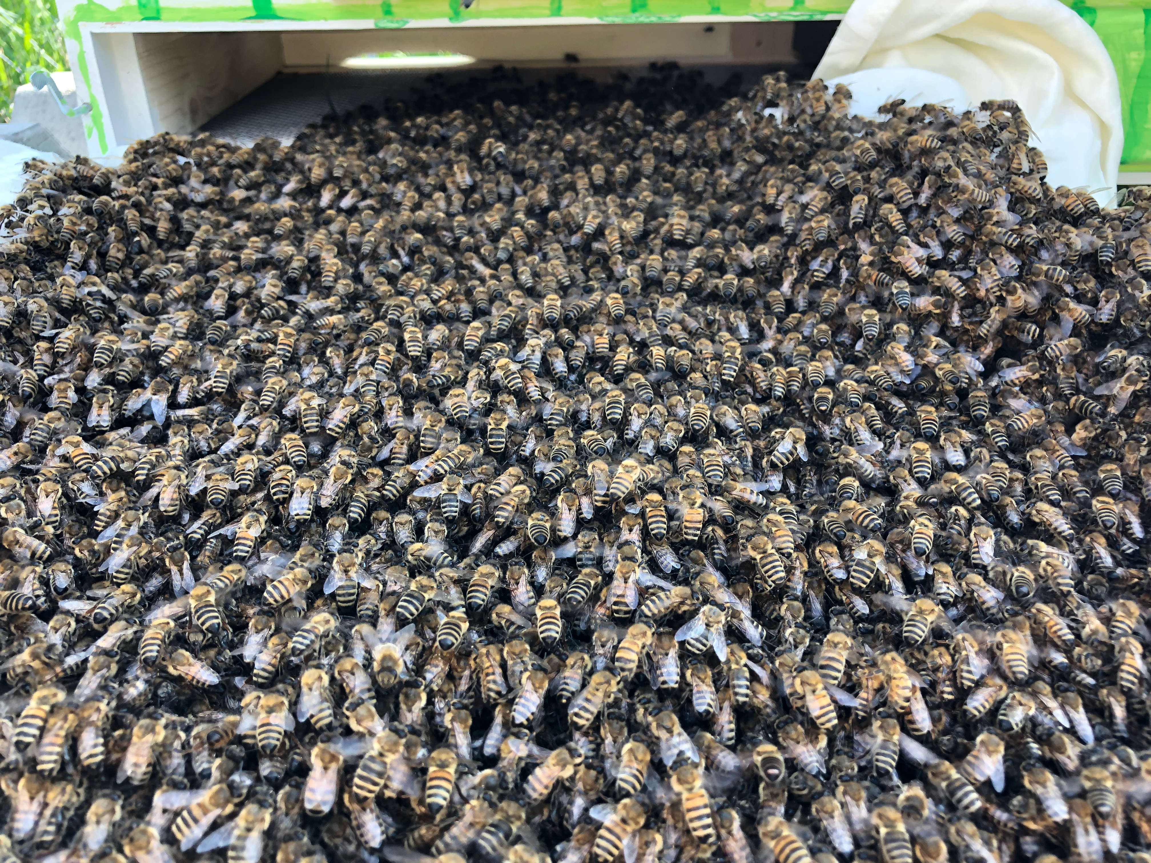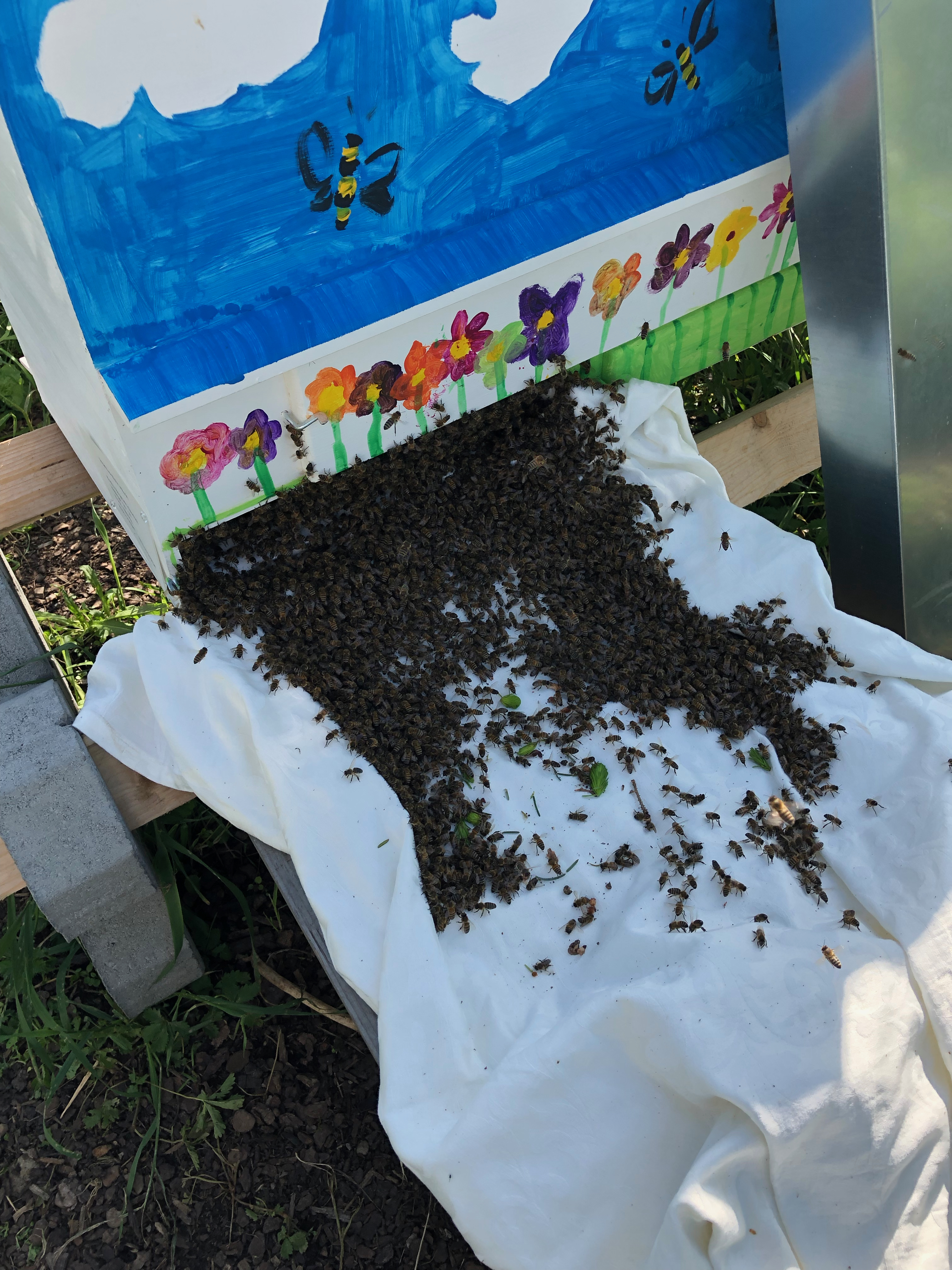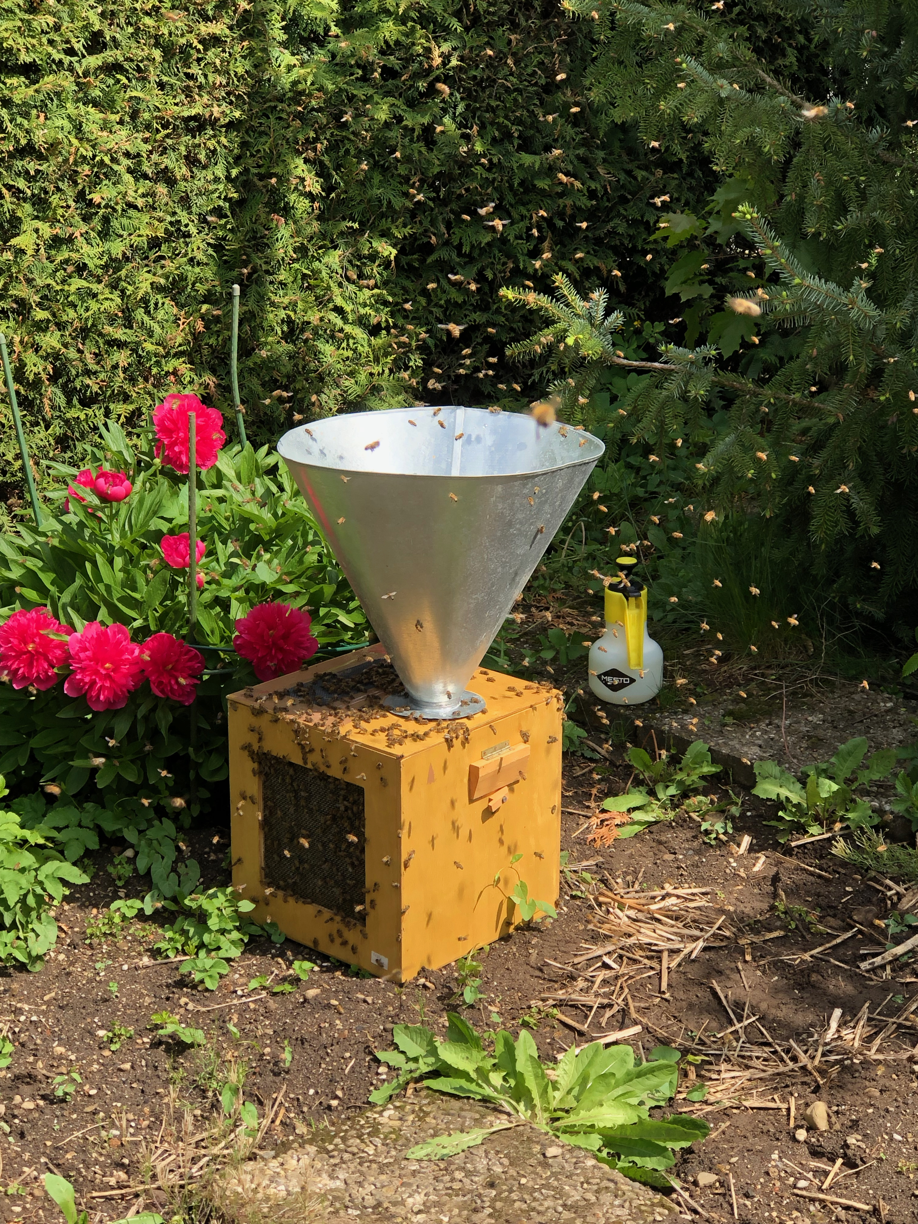 Damit der Nachbar dann in Ruhe seinen Rasen mähen konnte, habe ich die Kiste dann recht bald ganz langsam zu uns in den Garten rüber getragen (umkreist von einer kleinen Bienenwolke) und auf der anderen Seite der Hecke im Schatten geparkt, wo dann die restlichen Bienen noch in aller Ruhe einziehen konnten. Sie bildeten auch schnell eine Traube an der Decke der Kiste. Ich wollte sie gleich heute Abend noch einlaufen lassen.