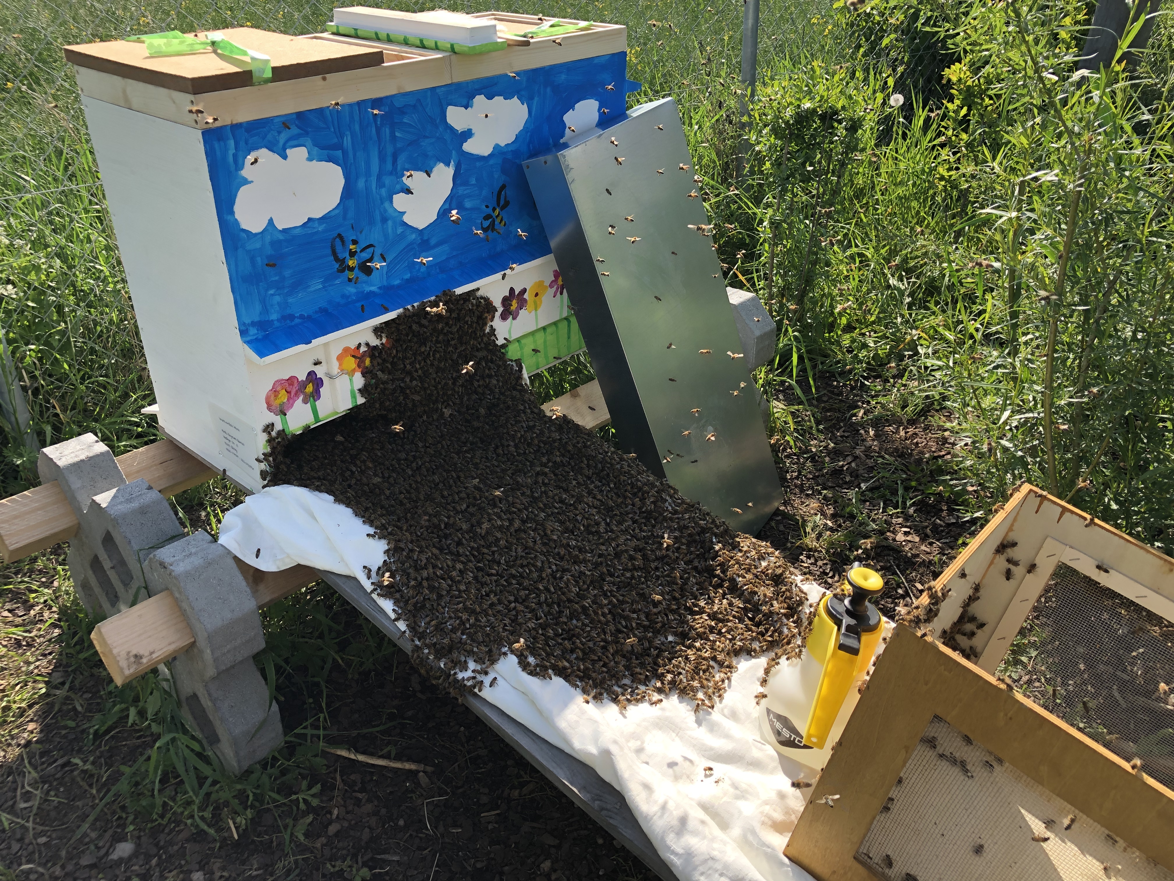 Sie waren laut und hektisch, im Flugloch hing schon eine dicke Traube, es waren viele Bienen in der Luft – und nichts geschah! Eine ganze Weile lang ging das so, und dann wurde es plötzlich superlaut. Hurra – das Warten auf den Schwarm hatte endlich ein Ende! Allerdings ein anderes als erwartet, denn es schwärmten die Bienen aus der bunten Balkonbeute!