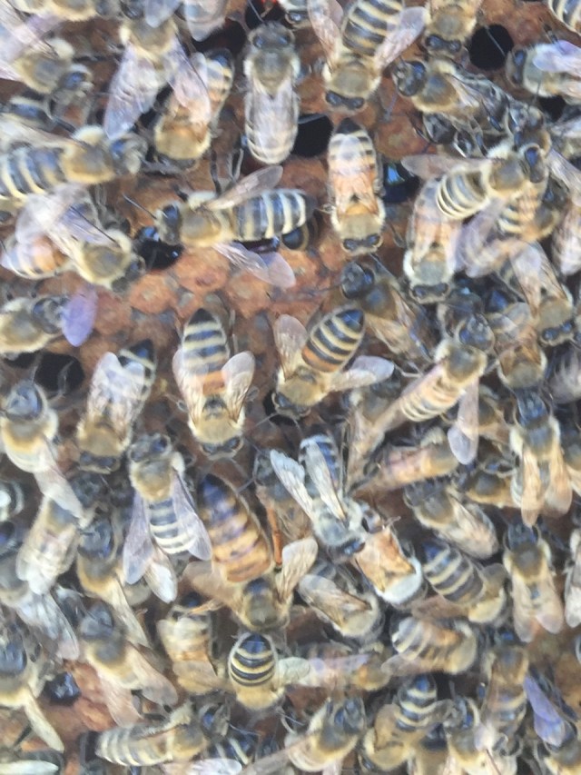 Das i-Tüpfelchen waren dann bei der letzten Durchsicht ein paar sich seltsam benehmende Arbeiterinnen, die von den anderen ständig berührt wurden und mit dem Hinterleib in die Zellen abtauchten… (leider habe ich davon kein gutes Video, als ich das Handy endlich im Videomodus hatte, konnte ich dieses Verhalten nicht mehr beobachten)