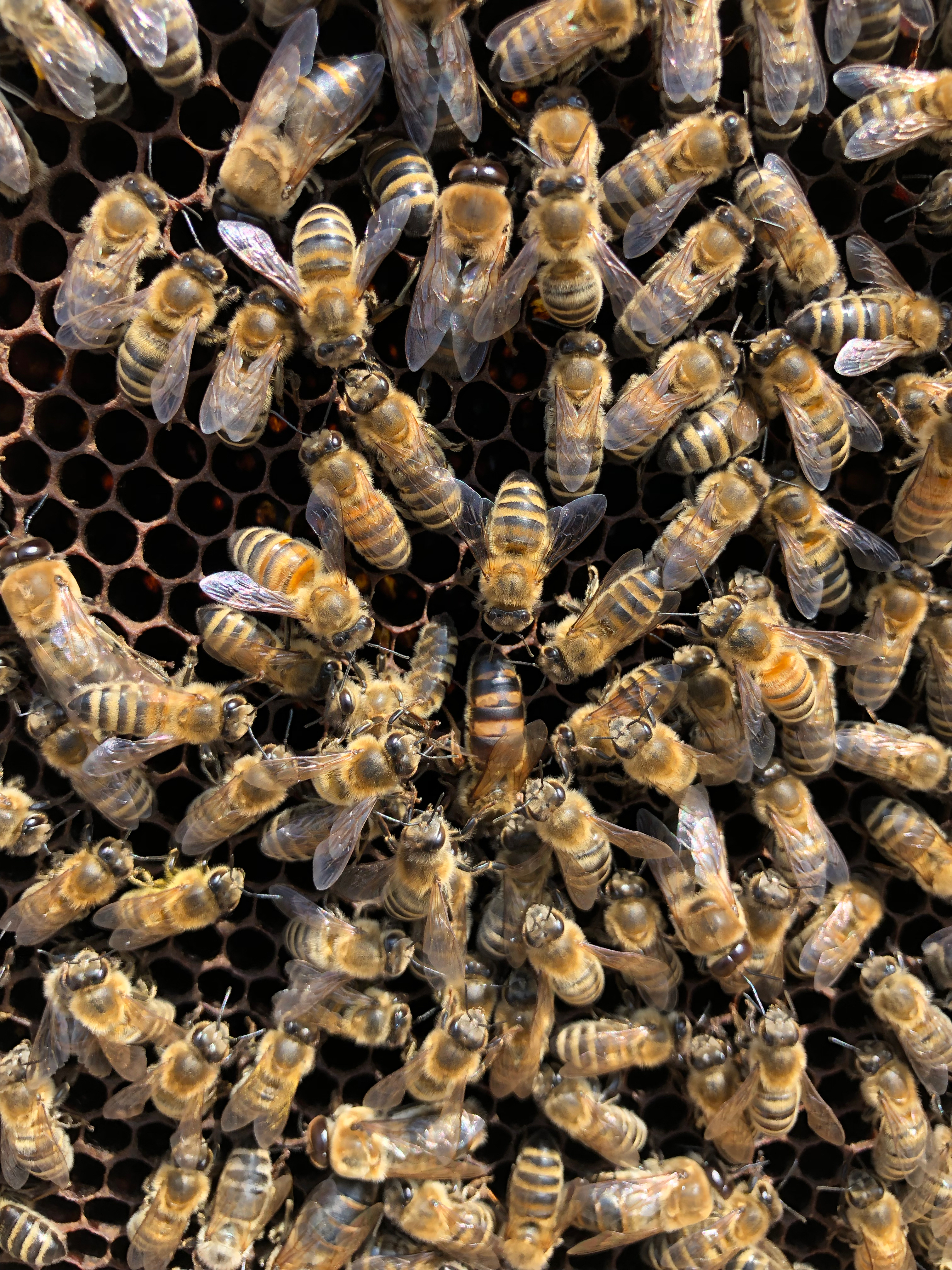 In der bunten Kiste durften wir ja schon bald nach dem Schwärmen aufatmen – das Volk war ruhig, es wurde wieder gestiftet und zwar nach allen Regeln der Kunst – 1 Ei pro Zelle, mittig auf dem Zellboden. Letzten Mittwoch habe ich zum letzten Mal kontrolliert, und da ist mir die neue Königin vor die Handylinse spaziert! Wie schon fast vermutet ist sie ziemlich hell! Voilá, wir präsentieren die neue Königin aus dem bunten Hause – Aurea I.!