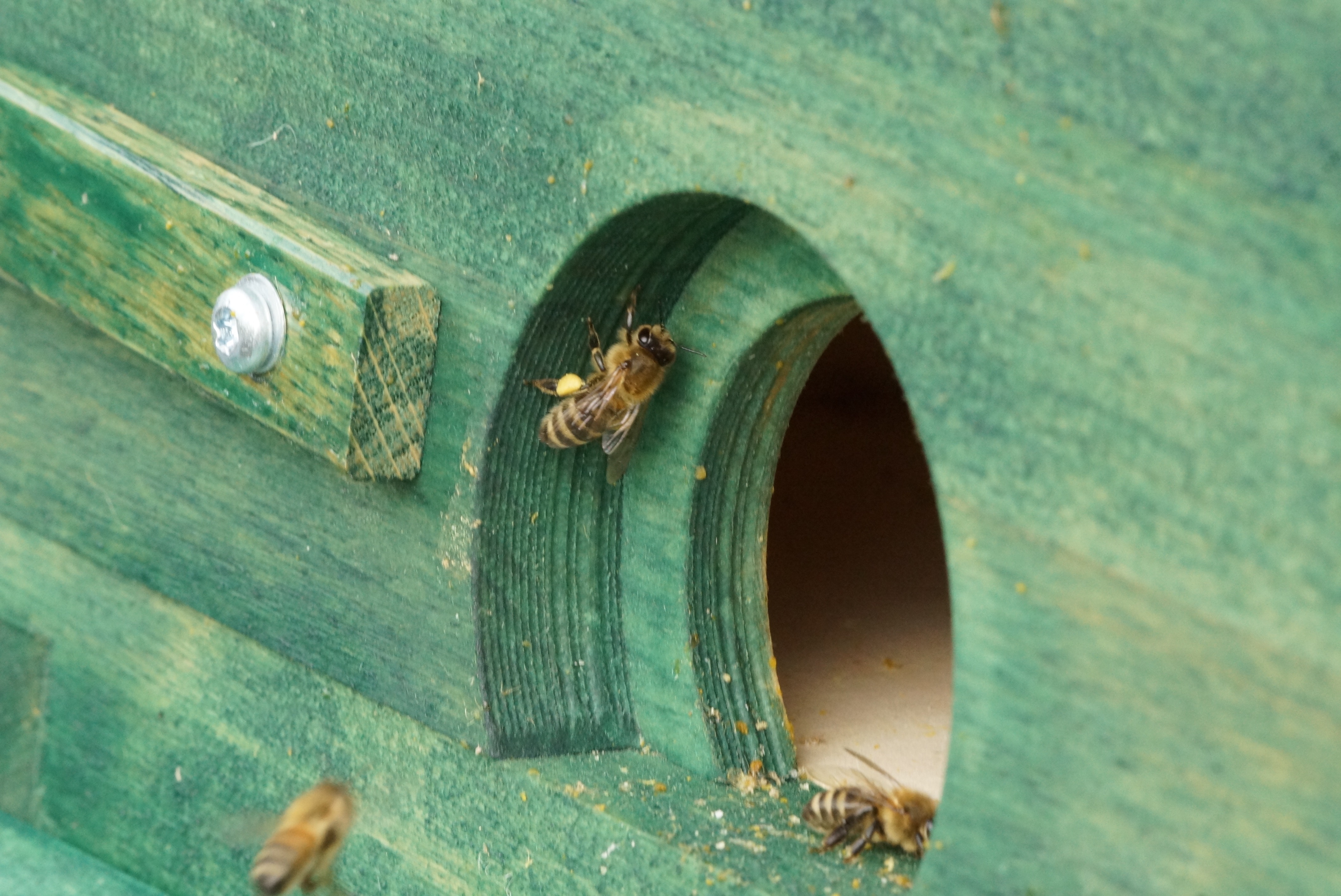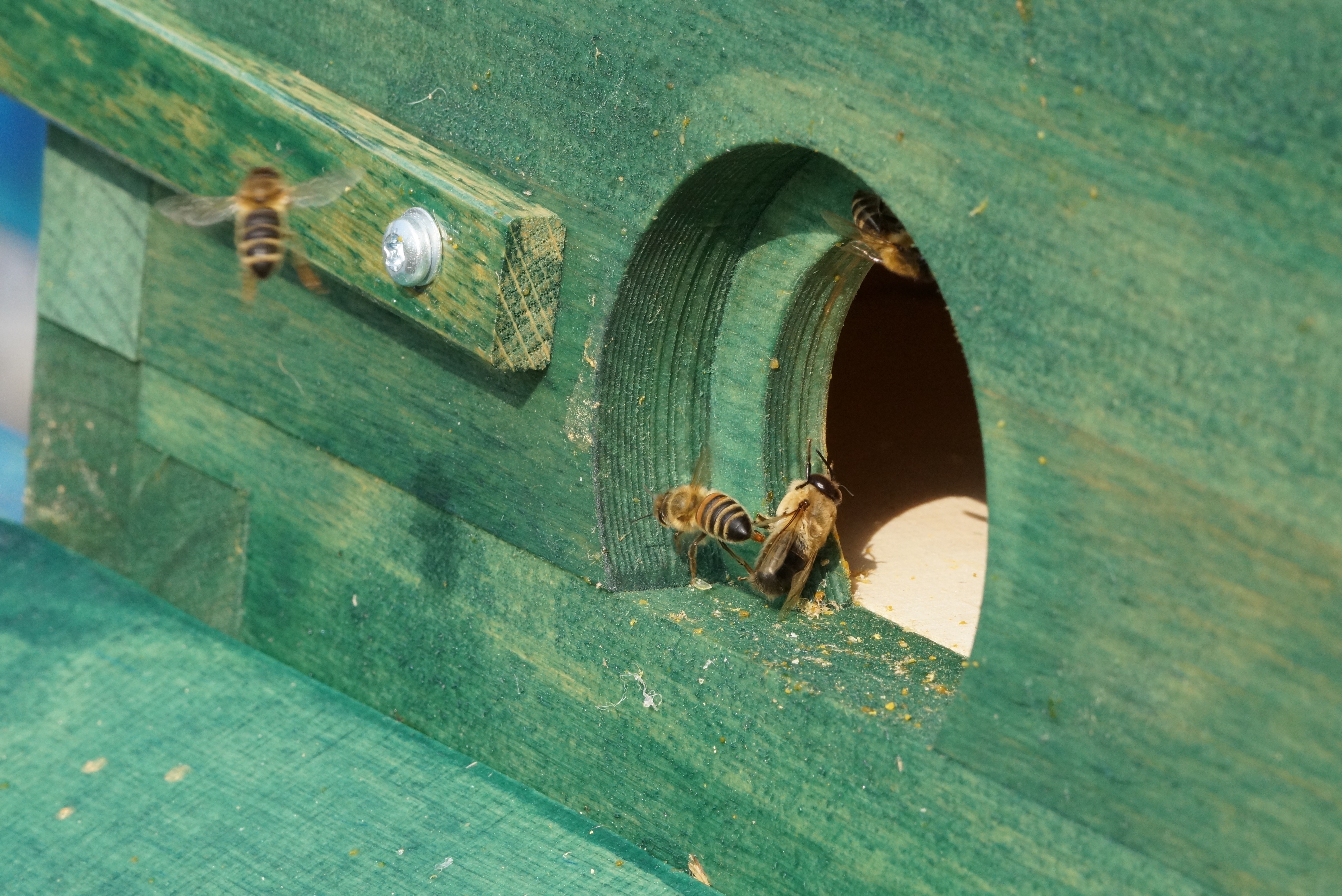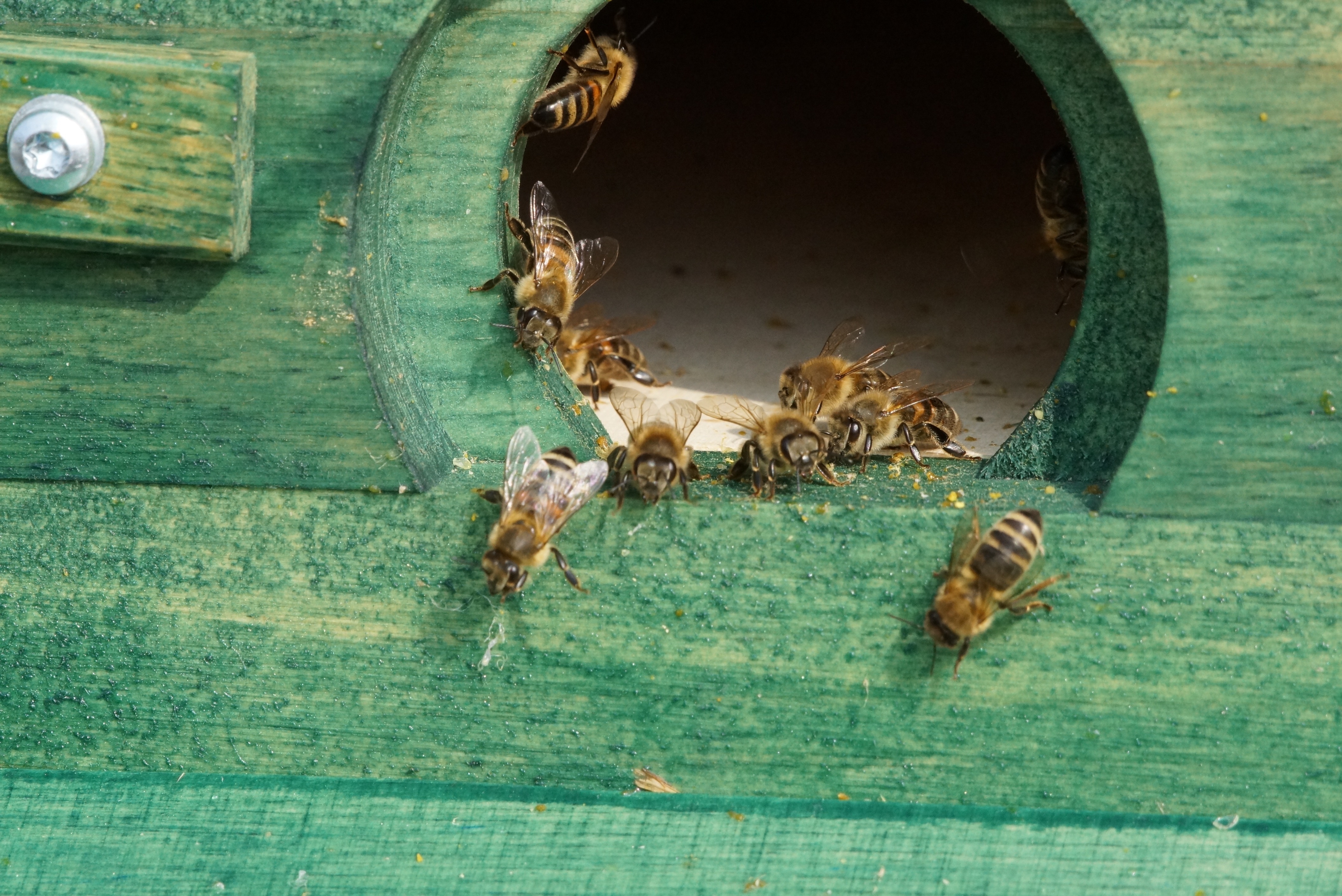 Sie sind gleich zügig losmarschiert und haben auch prompt das Flugloch verstopft und schwappten nach unten über den Pflasterstein: