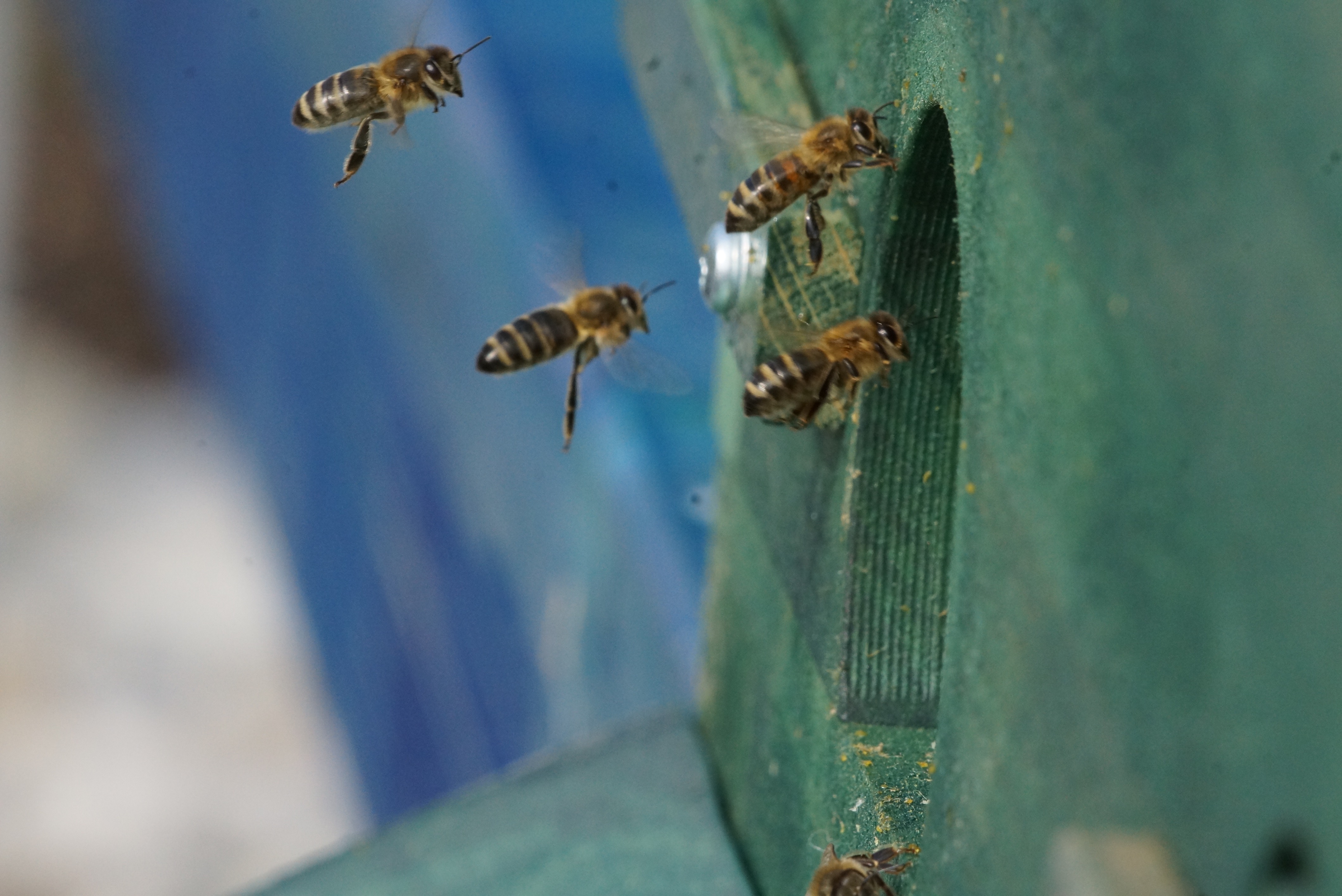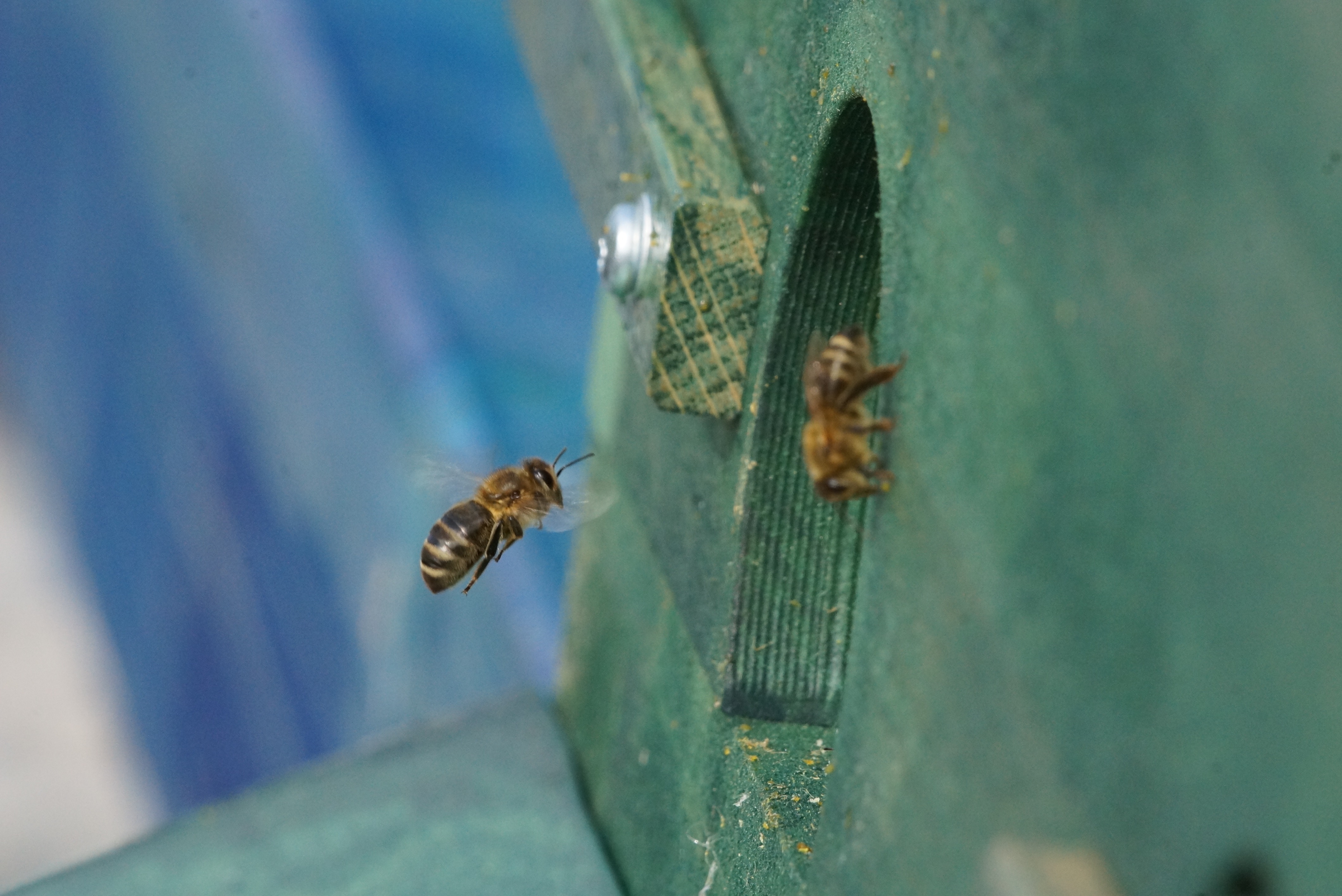 Sie hingen am nächsten Morgen immer noch so da, ein leichtes Anschieben brachte jedoch Schwung in die Truppe, und nach kurzer Zeit konnte ich das Brett dann entfernen. Ein schneller Blick auf das Wachstuch und in den leeren Raum ergab, dass die Traube schön in den Rähmchen hing und der Temperatur nach auch schon mit dem Bauen begonnen hatte. Kurze Zeit später waren die ersten Bienen beim Einfliegen zu beobachten: