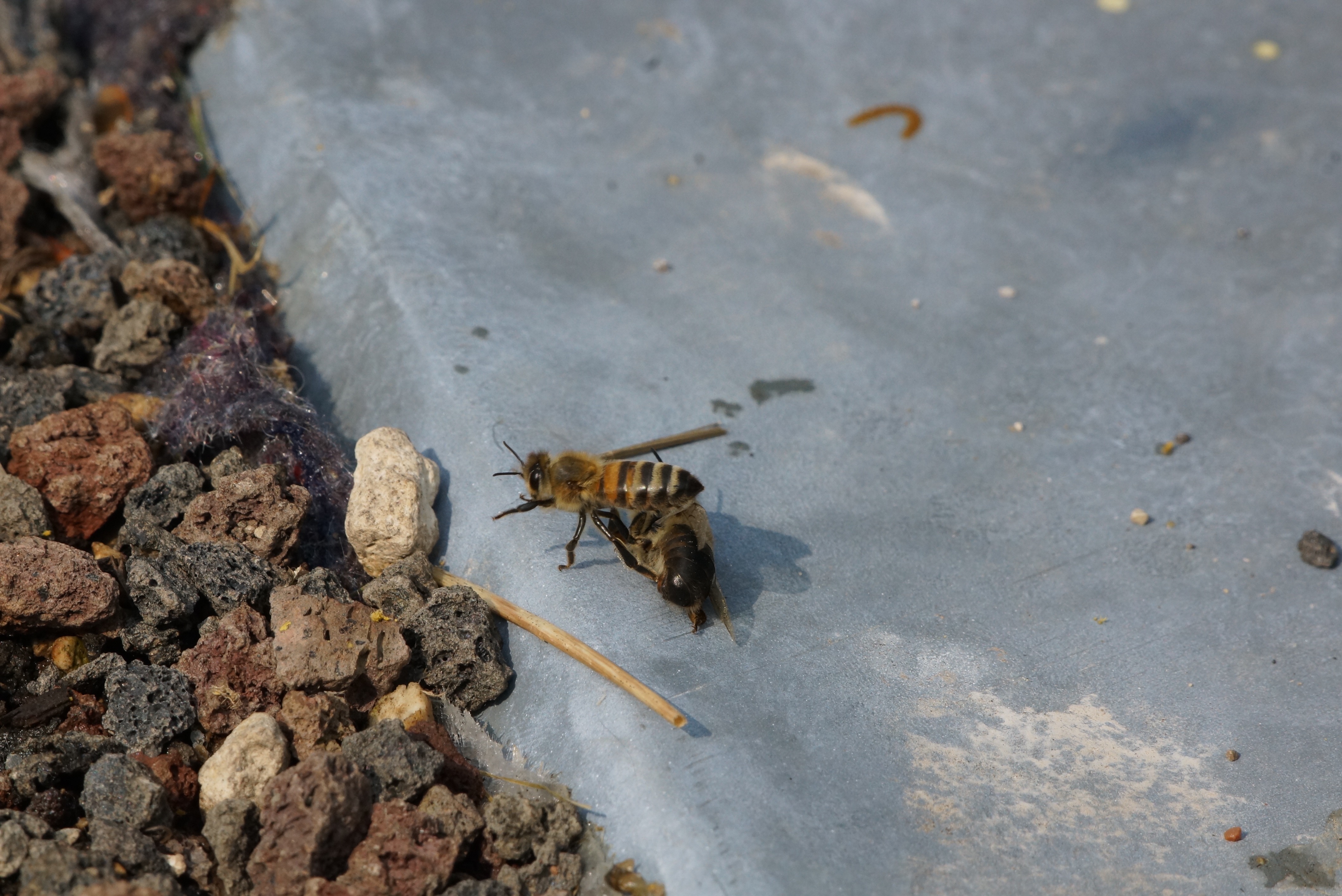 Der Pflasterstein (eigentlich zur Fixierung des Leintuchs) entpuppte sich als schier unüberwindbares Hindernis, erst als ich ihn gedreht hatte und die Bienen etwas angeschoben hatte, machten sich auch diese Nachzügler auf den Weg nach oben.