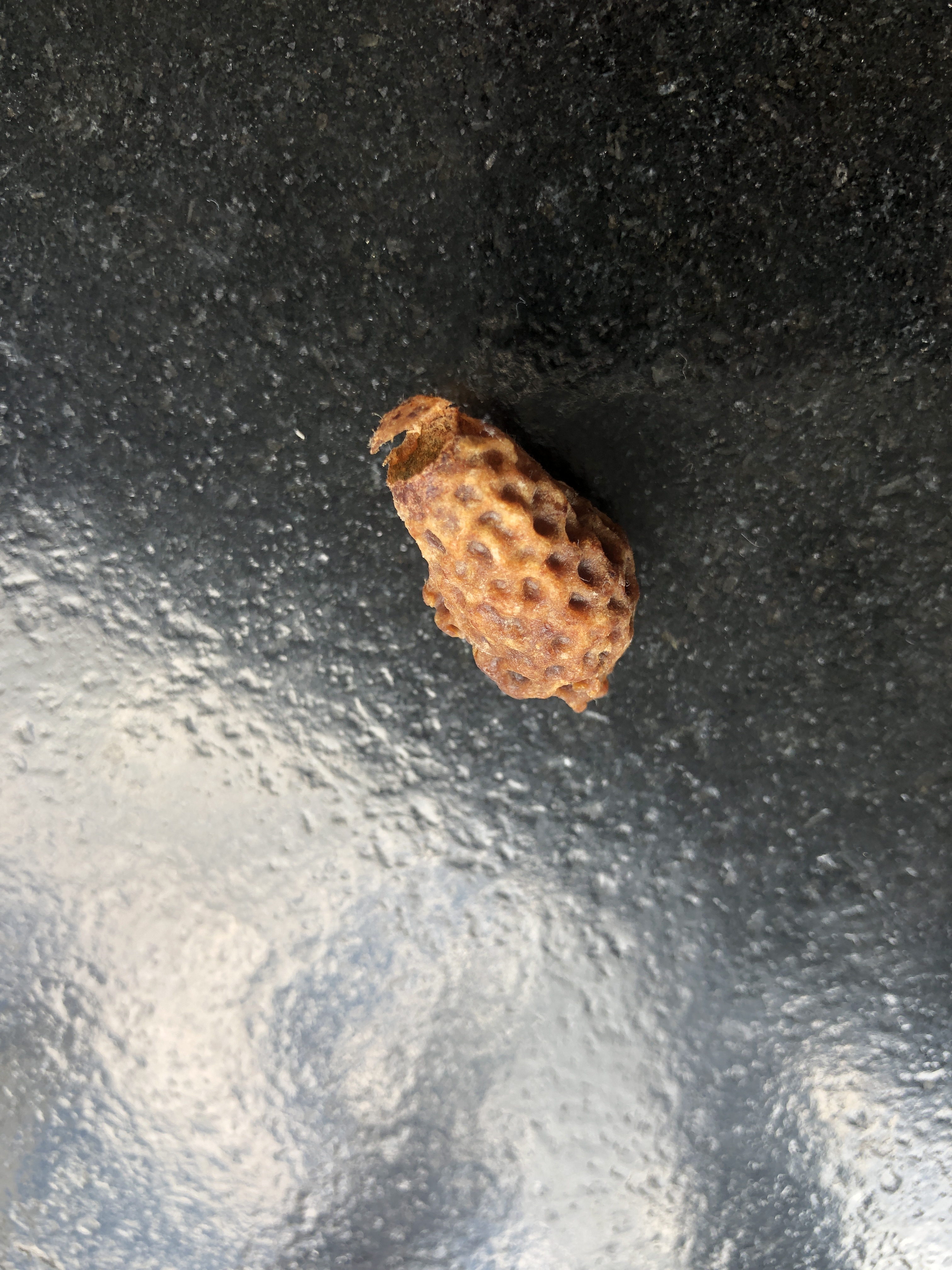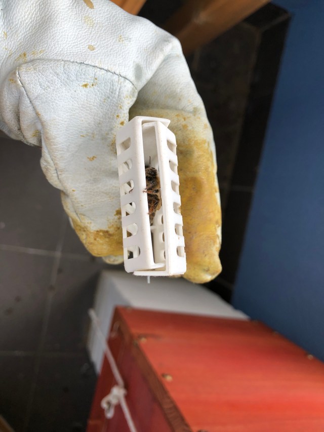 Vorher kontrollierte ich noch ihre Ursprungsbeute und entfernte bis auf eine besonders schöne und große alle anderen Weiselzellen, damit nicht noch ein Nachschwarm abgehen würde. Das mache ich immer echt ungern. Bei einer der letzten Schwarmzellen konnte ich dann erkennen, dass die darin enthaltene Prinzessin kurz vor dem Schlupf stand – sie war schon etwas farbig und bewegte sich. Alle anderen waren noch eher am Anfang ihres Puppenstadiums. Jetzt hatte ich noch mehr schlechtes Gewissen und hängte die Zelle kurzer Hand an einem Draht in die leer stehende Mini-Plus-Beute, gab einen Schwung Arbeiterinnen dazu und Flüssigfutter in den Futteraufsatz. Danach stellte ich die Beute in die kühle Garage. Ich wollte ihr eine Chance geben und sie als Ersatzkönigin in der kleinen Beute halten. So könnte ich im Notfall schnell auf eine Königin zurückgreifen, falls ein Volk seine verlieren würde. Ich weiß allerdings nicht, ob sie sich überhaupt fertig entwickeln würde, da die Zelle beim Abtrennen von der Wabe etwas aufgerissen war:
