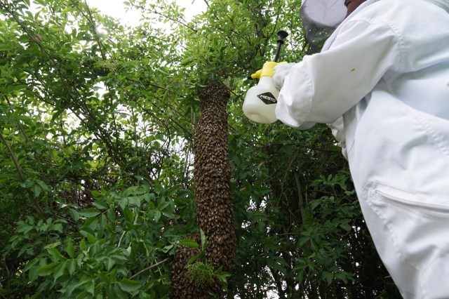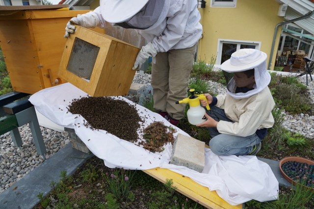 Zuerst einsprühen, damit nicht so viele Bienen auffliegen: