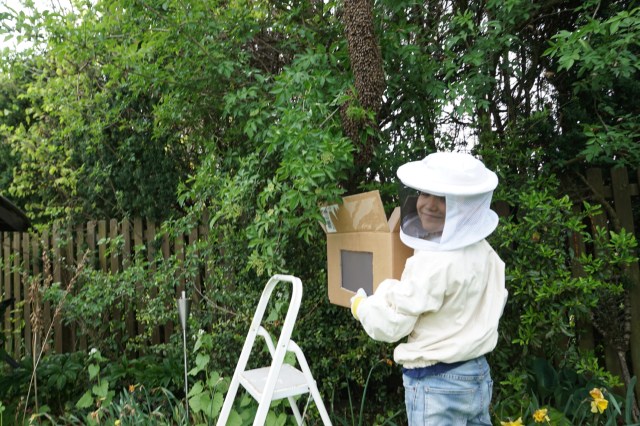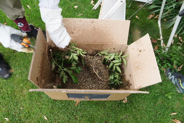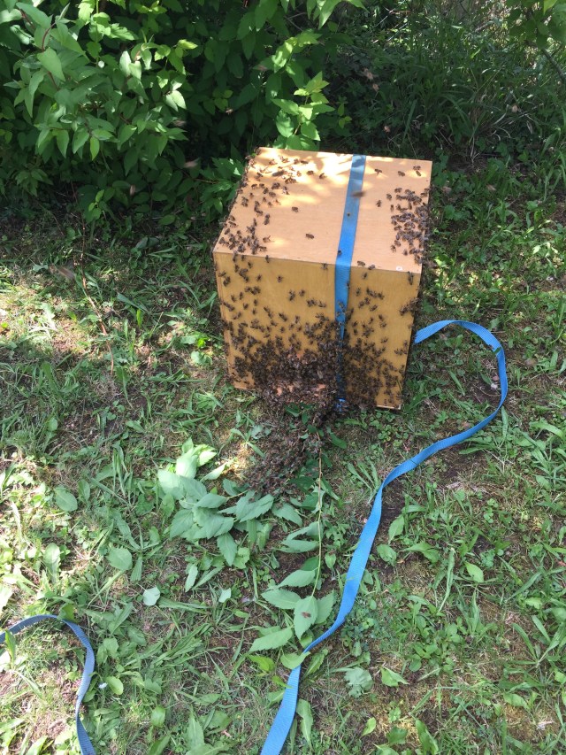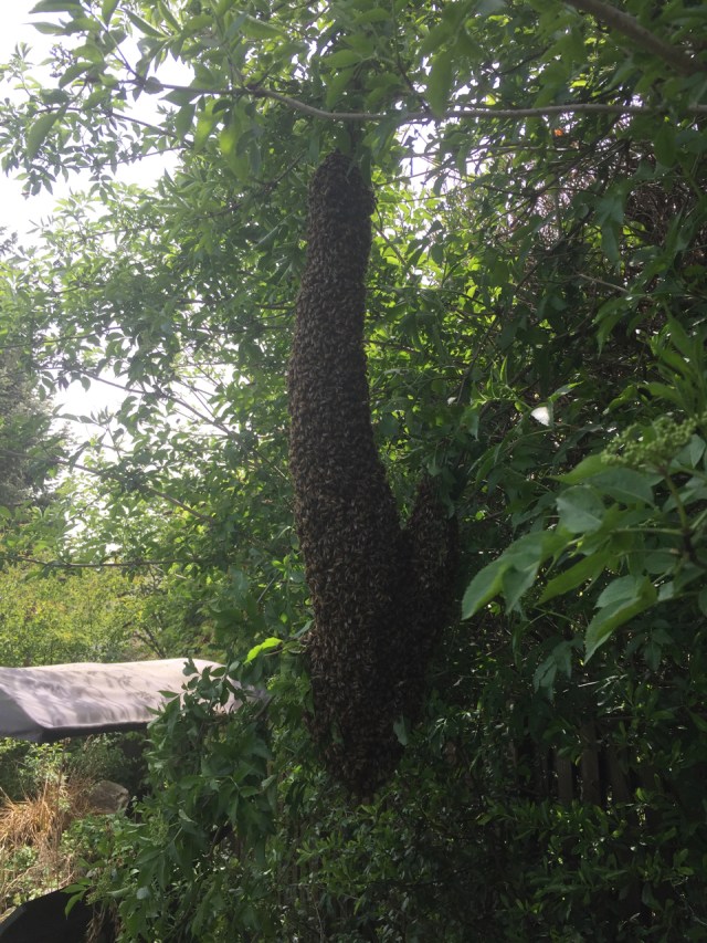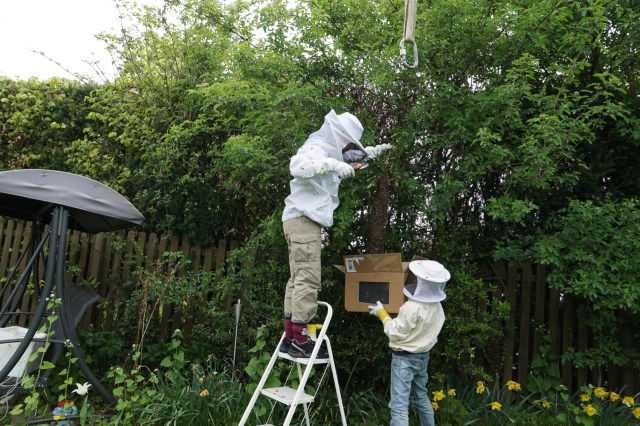 Das war aber auch nicht tragisch, denn ich hatte ein paar sehr, sehr nette Gespräche mit den Gartenbesitzern, und sogar eine erfrischende Wasserpistolenschlacht mit den Enkeln, als wir darauf warteten, dass die Ladies sich in die Kiste begeben würden. Nach dem Einsatz von Wasser mit Nelkenöl zur Überdeckung des Königinnengeruchs oben im Baum bildeten sie einfach ein bisschen weiter neue Träubchen. Wir ließen sie etwas sammeln, dann pflückte ich sie kurzer Hand mitsamt dem Zweiglein herunter:
