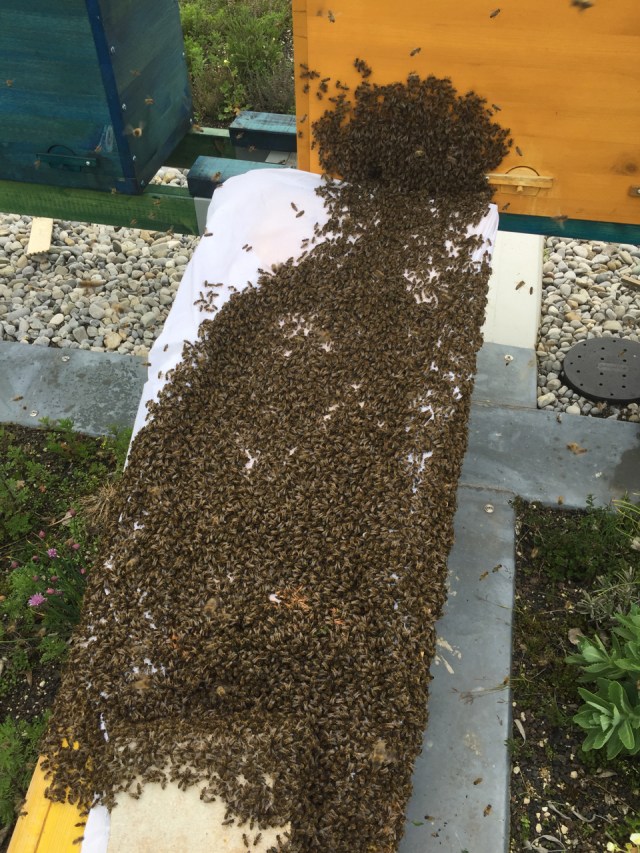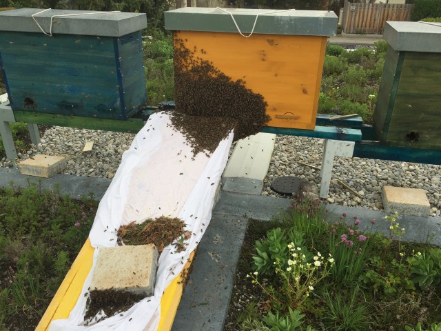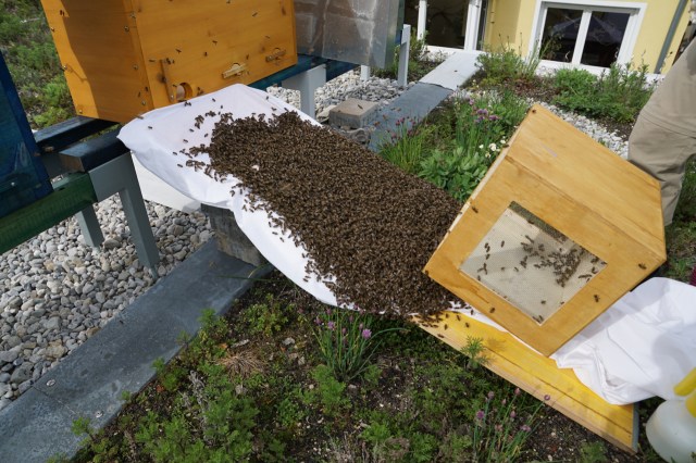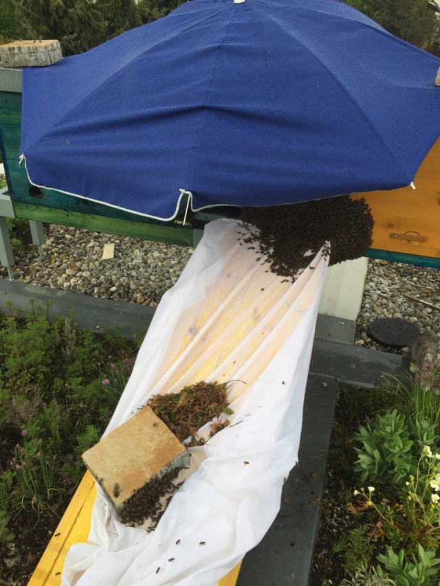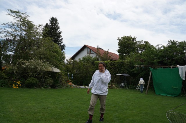 Es pressierte den Damen überhaupt gar nicht! (Und es waren wirklich nur Damen, ihr ehemaliger Imker scheint das Volk drohnenfrei gemacht zu haben – ich hatte noch nie einen so drohnenfreien Schwarm erlebt. Schade, das ist immer nett, wenn man den zuschauenden Kindern einen Drohn auf die Hand zur näheren Betrachtung setzen kann…)
