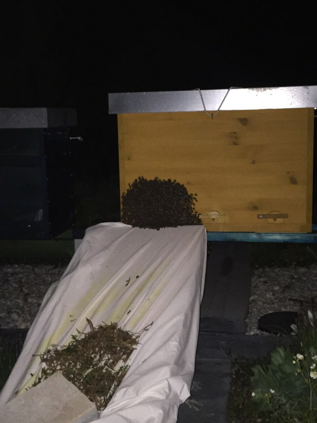 Ich hatte noch von keinem der angeschriebenen Königinnenzüchter eine positive Rückmeldung bekommen, und so war es ein kleines Wunder, dass ich diesen riesigen Schwarm fangen durfte. Er darf nun in die königinnenlose Beute einziehen und dann mit dem höchstwahrscheinlich weisellosen Volk vereint werden. Rettung in der Not und keine enttäuschten Kinder, dass eines der Völker aufgelöst werden muss! Yippie!