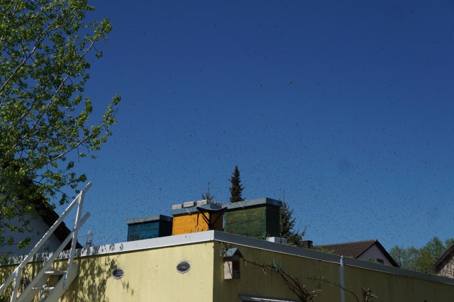 Es war ein irres Spektakel, als die Bienen wie ein Wasserfall aus dem Flugloch rauschten und eine riesige Wolke über der Garage hin und her schwirrte: (und nein, man fängt Schwärme nicht neuerdings mit dem Heli ein!) 😉