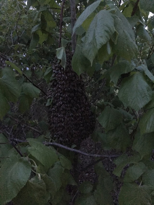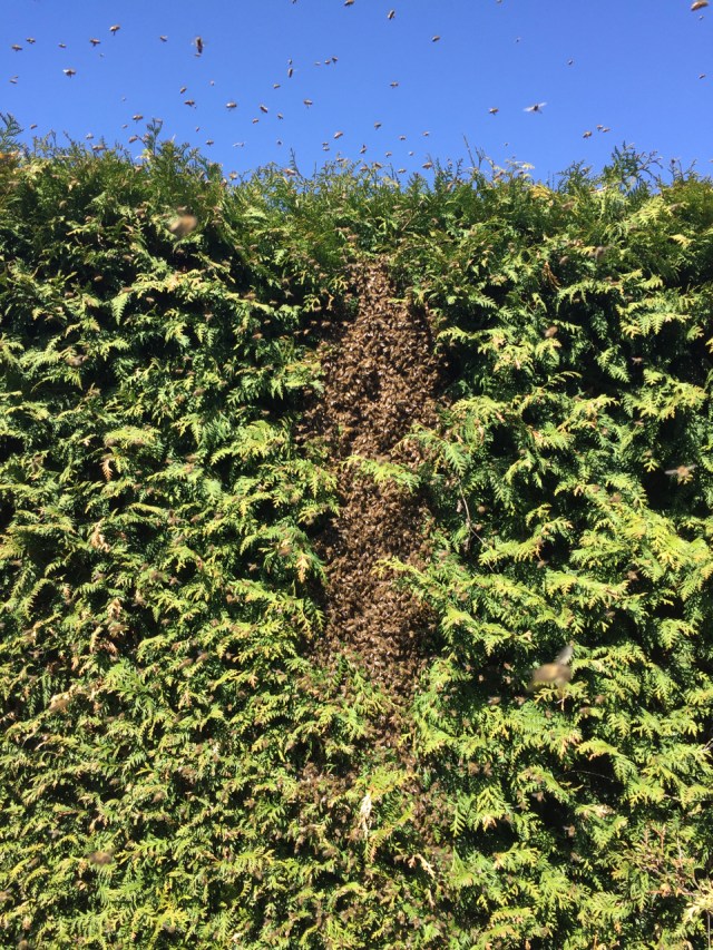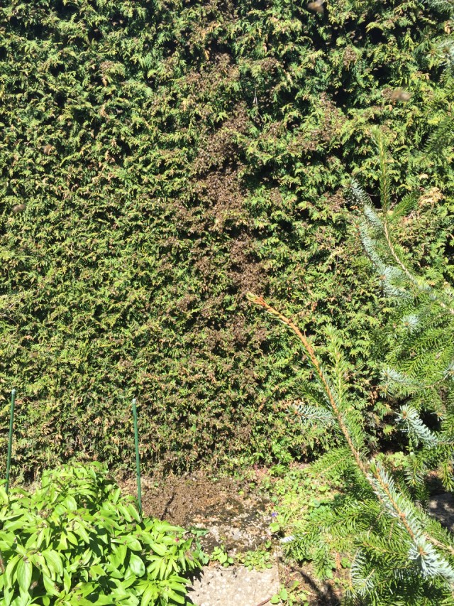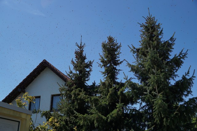 Die Wolke verschob sich dann ganz gemächlich erst zu den 5m entfernten Fichten unseres Nachbarn („bitte nicht so hoch, bitte nicht so hoch!“ und es dauerte eine ganze Weile, bis sich erste Bienengrüppchen in der danebenliegenden Thujenhecke und am Boden davor sammelten:
