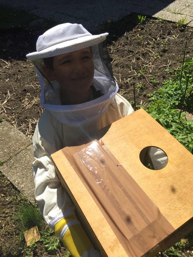 Während ich auf der kleinen Leiter stand, um an der Hecke zu rütteln, hielt mein kleiner Mann die Kiste mitsamt dem Trichter oben drauf über Kopf – starke Leistung! Gemeinsam schafften wir es eine recht große Portion der angefeuchteten Schwarmtraube in die Box zu bekommen. Danach war natürlich erst mal der Teufel los, trotz eher großzügigem Einsatz des Wassersprühers! Die Box wurde nah an der Hecke aufgestellt, und wir konnten auch gleich erste Bienen an der Box sterzeln sehen. Und dann kam der große Nachteil dieser Schwarmkiste ans Tageslicht: die großen Gitterflächen! Denn die Arbeiterinnen können ihre Königin auch durch das Gitter riechen, und sammeln sich entsprechend lieber vor den Gittern, als durch das (von mir auch vermutlich etwas zu klein angebrachte) Flugloch in die Box zu krabbeln.