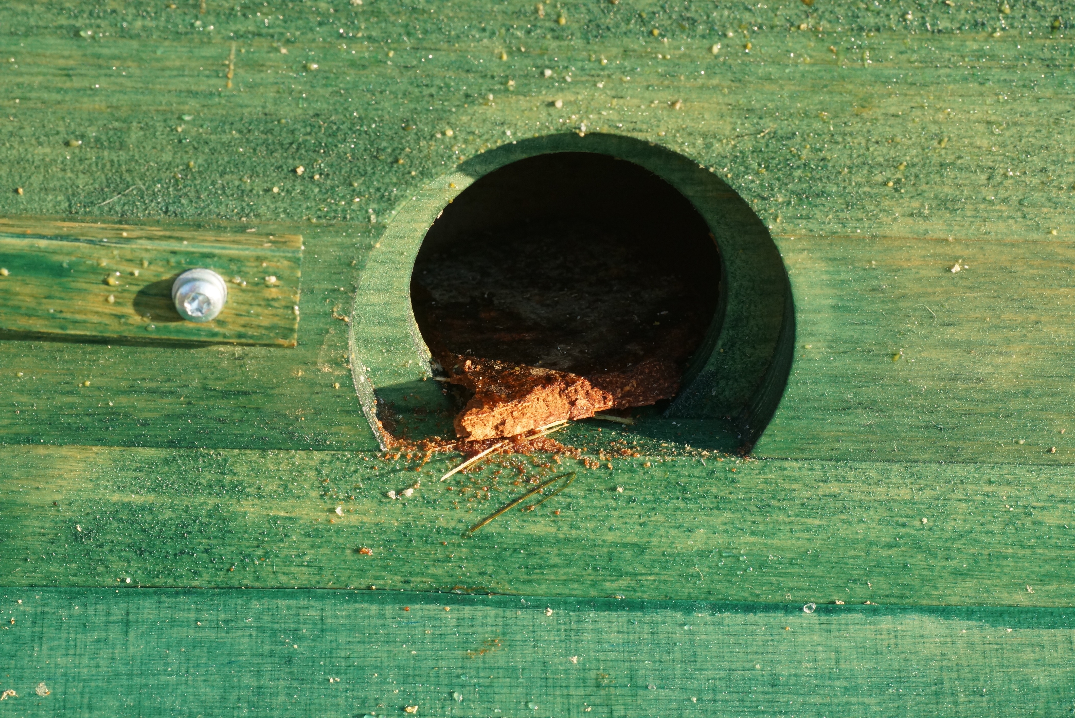 Ich gehe davon aus, dass es mehrere zeitlich voneinander getrennte Abrisse gegeben haben muss, da an diesem hier schon deutlich neues Wabenwerk zu erkennen ist, wohingegen an der anderen Stelle kein Neubau zu sehen war. Gut möglich, dass der zweite Abriss genau passierte, als wir am Dienstag im Garten saßen, und deshalb soviel Flugverkehr um die grüne Beute zu sehen war…