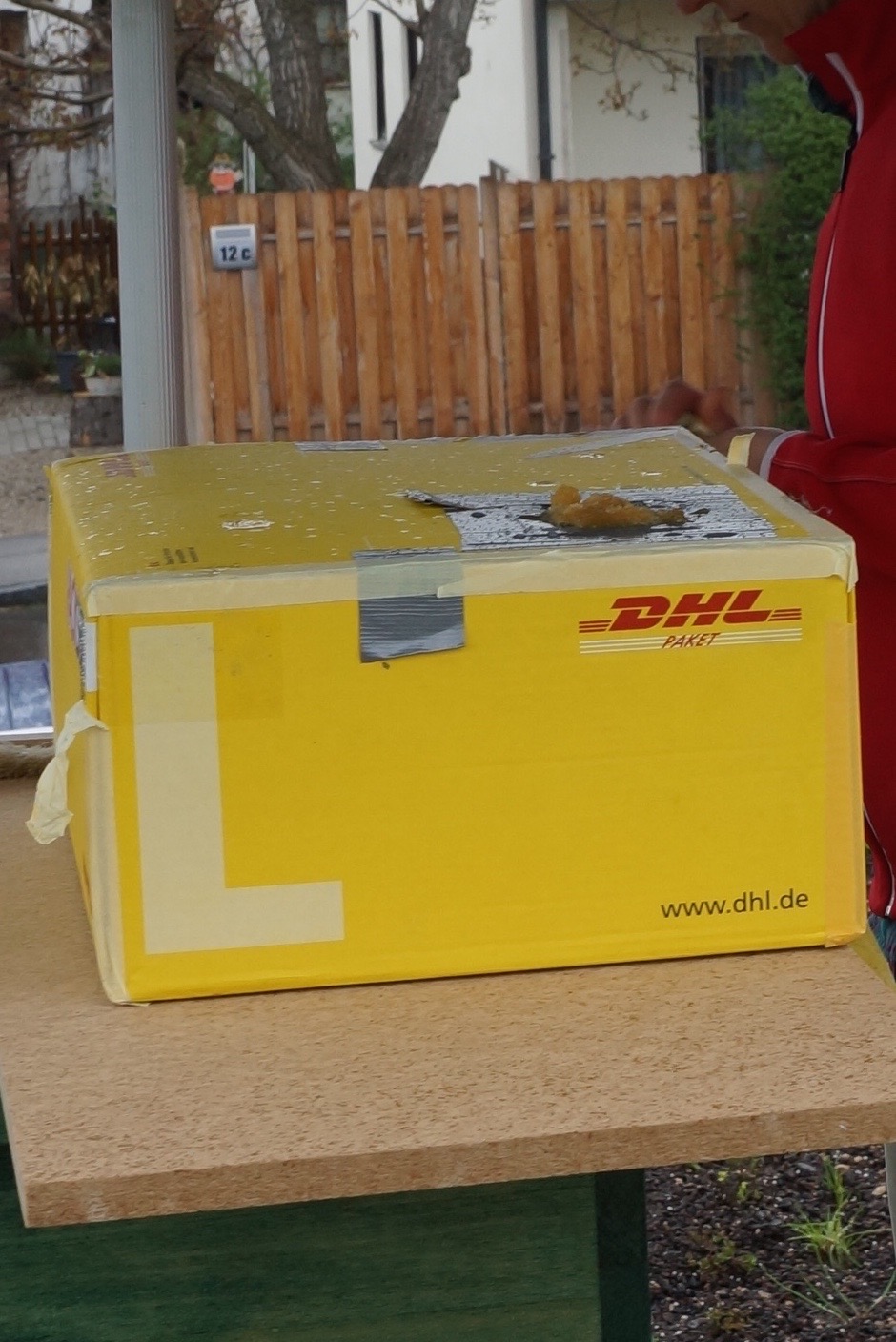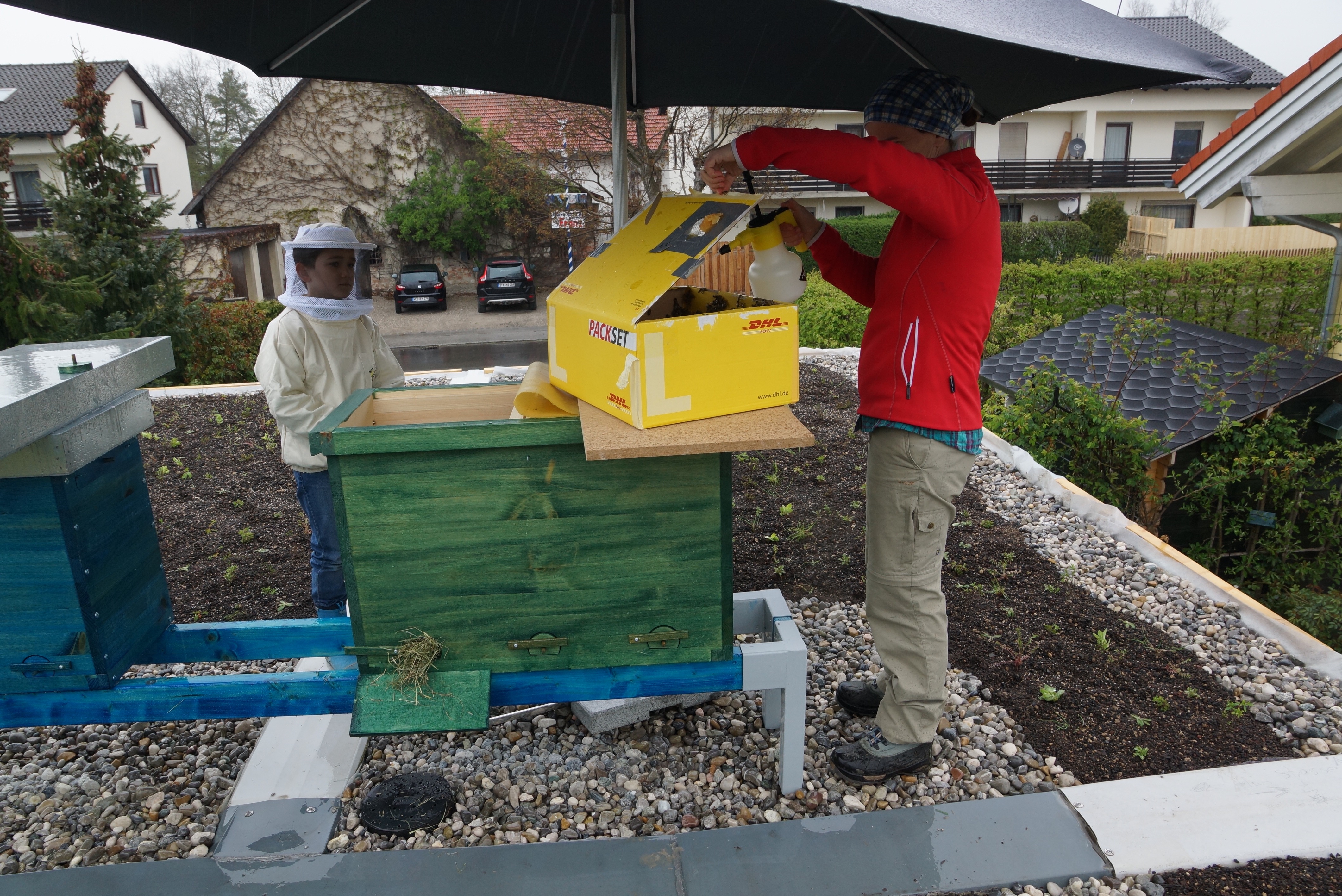Beim Verschieben des Strohschiedes war zu erkennen, dass das Wabenwerk an das Strohschied gebaut wurde. Das ist natürlich eher ungut, daher habe ich die zunächst Schied und Wabe getrennt, und danach die Wachsreste vom Strohschied vorsichtig entfernt. Das war ein wenig kniffelig, weil das frische Wabenwerk ja noch sehr zart und relativ wenig am Oberträger befestigt ist. Ich versuche es in Zukunft mal mit etwas mehr Abstand zwischen Schied und dem letzten Rähmchen. Falls das auch nichts nützt, kommt über den Sommer und Herbst erst mal das glatte Standard-Trennschied rein.