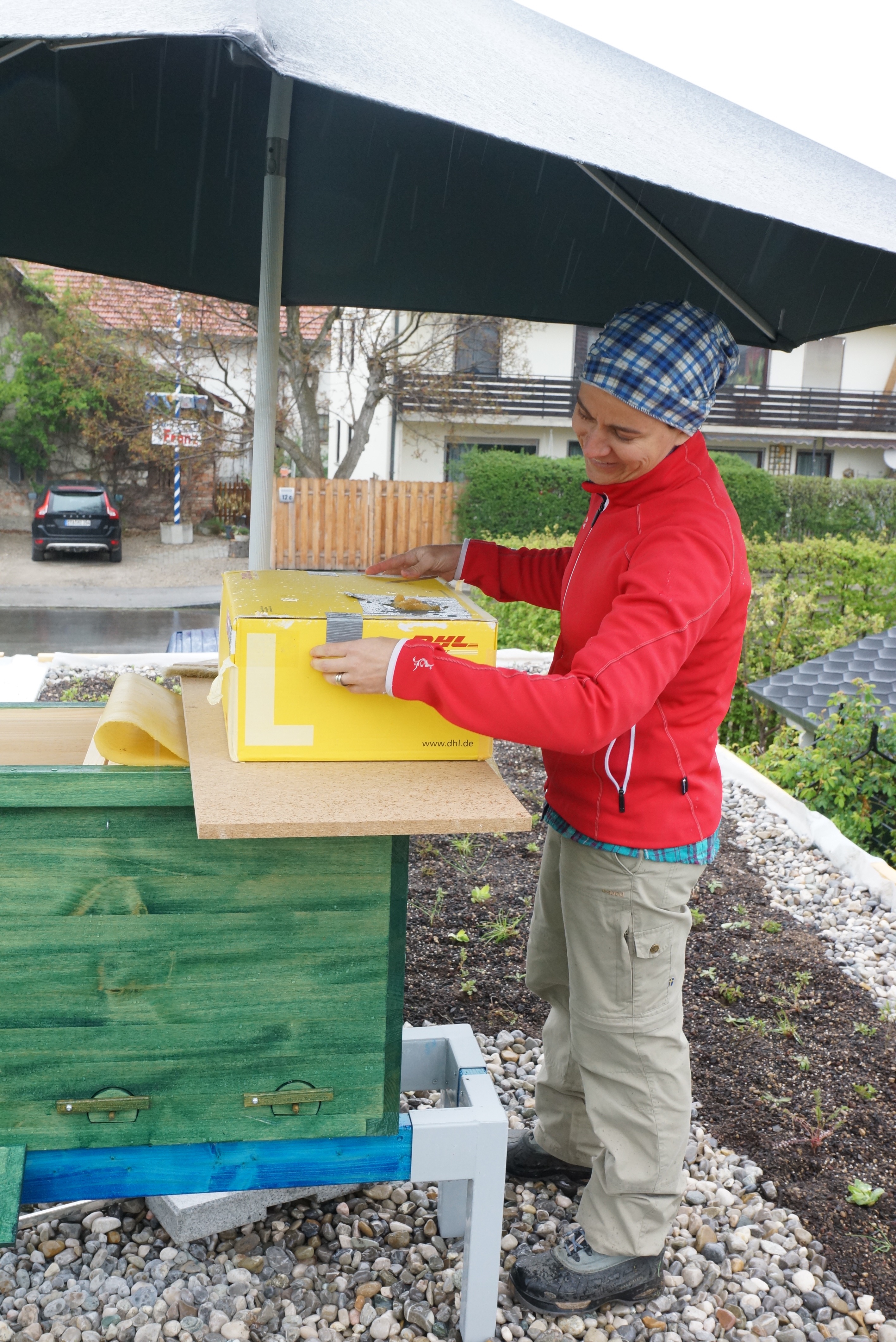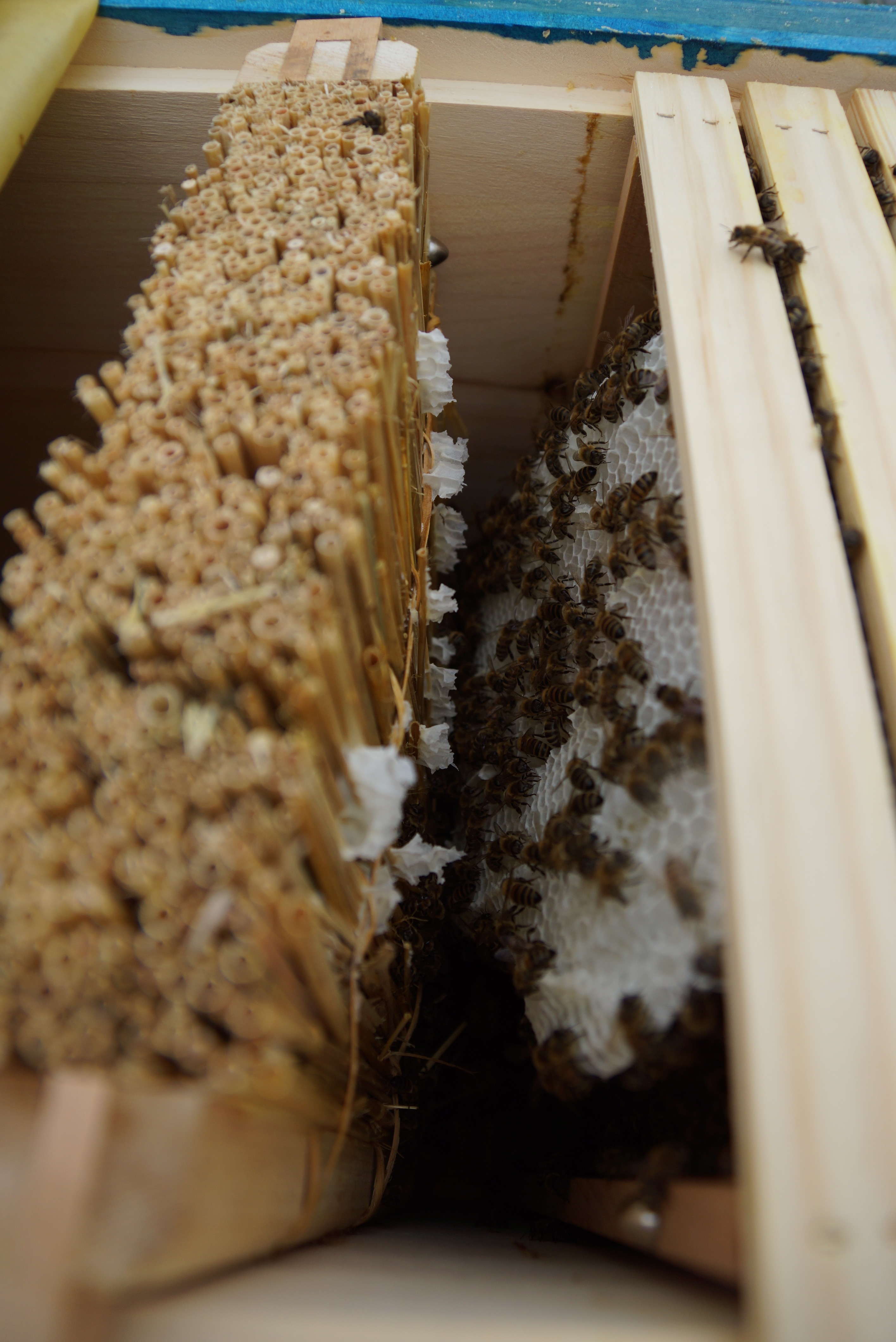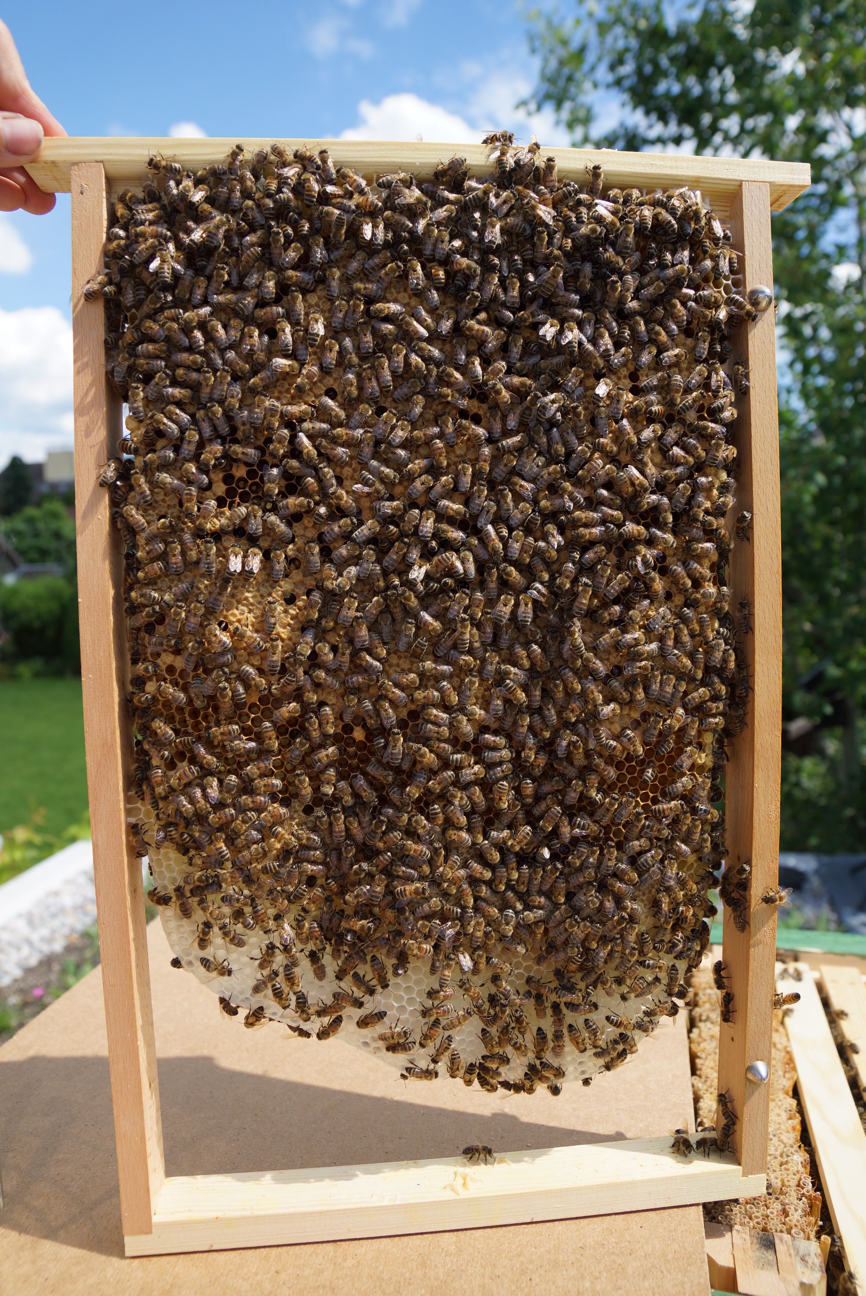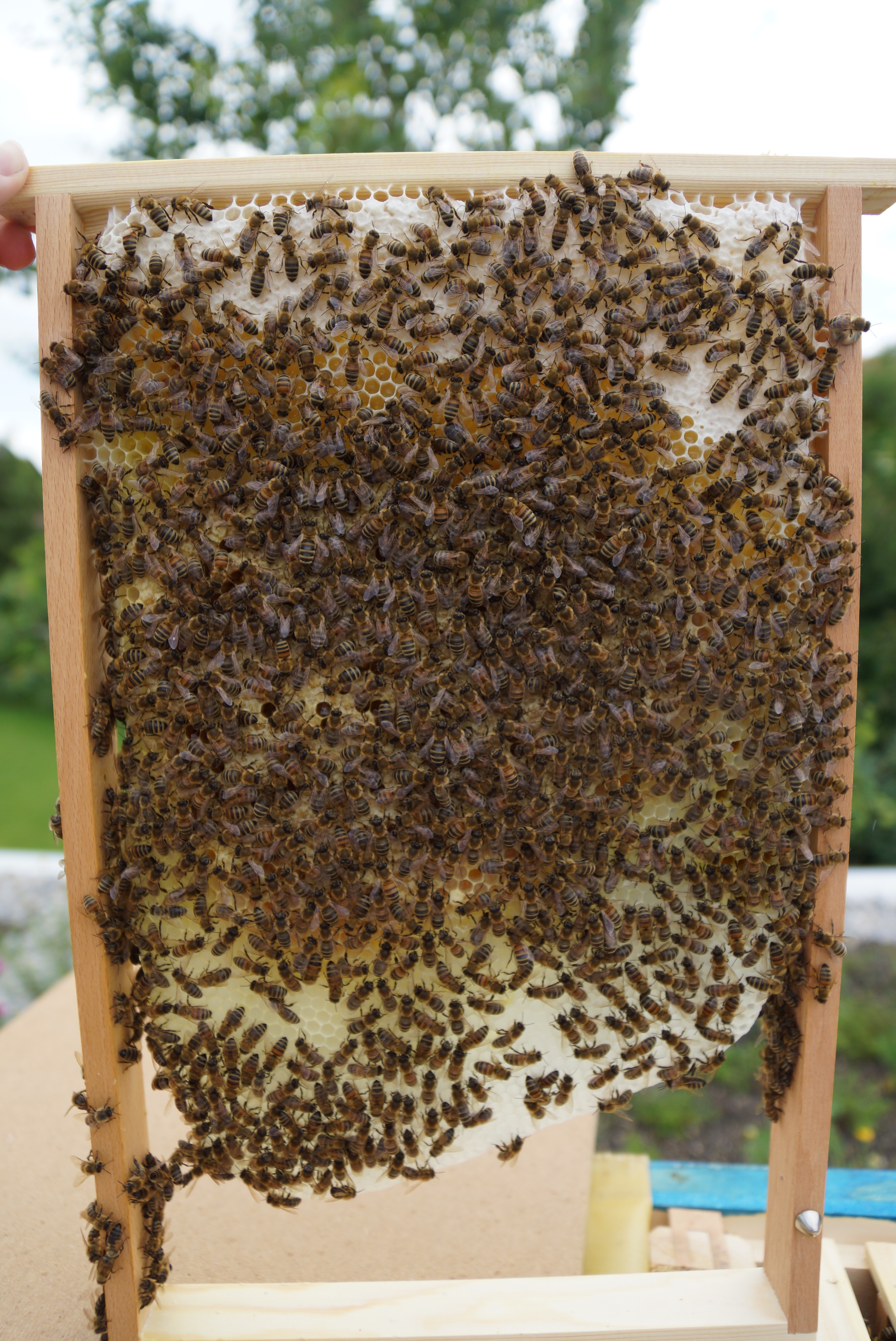 Ich finde den Wabenbau in dieser Beute deutlich geordneter als bei den Kolleginnen aus Grün – sie bauen interessanter Weise auch seitlich viel mehr an, wodurch die ganze Geschichte stabiler und einfacher zu handeln ist.