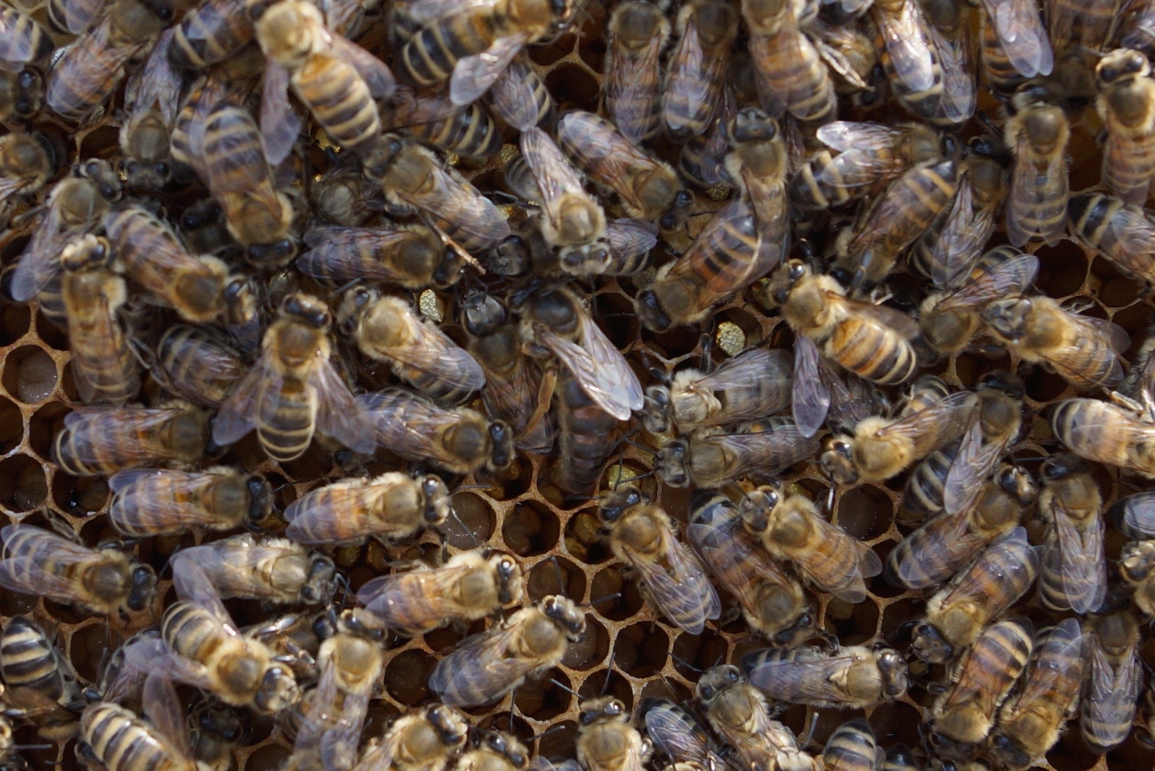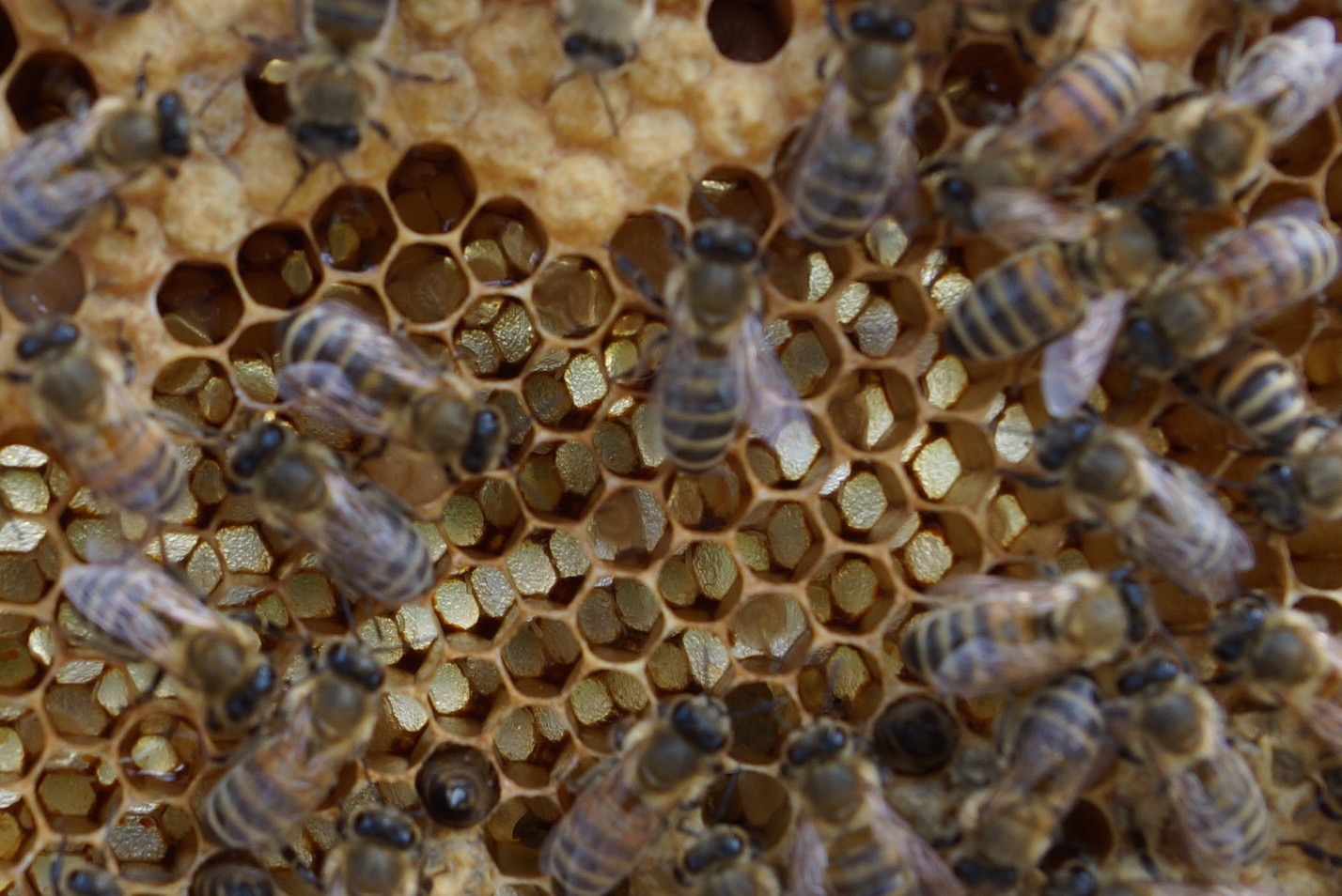 Dort, wo die Brut bereits geschlüpft war, waren Eier (=Stifte) zu erkennen. Das sind diese winzig kleinen weißen Gebilde mittig am Grund der Zellen: