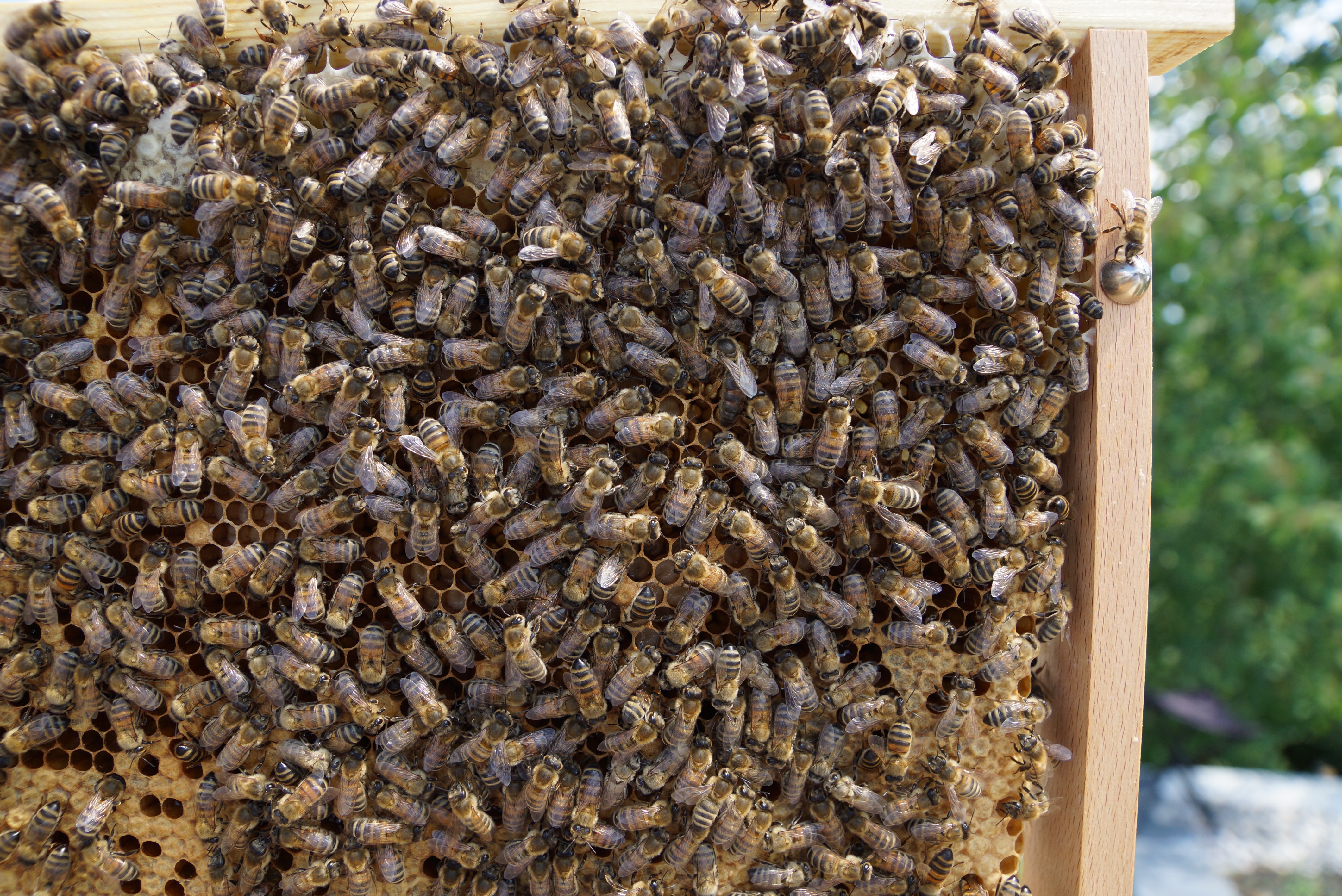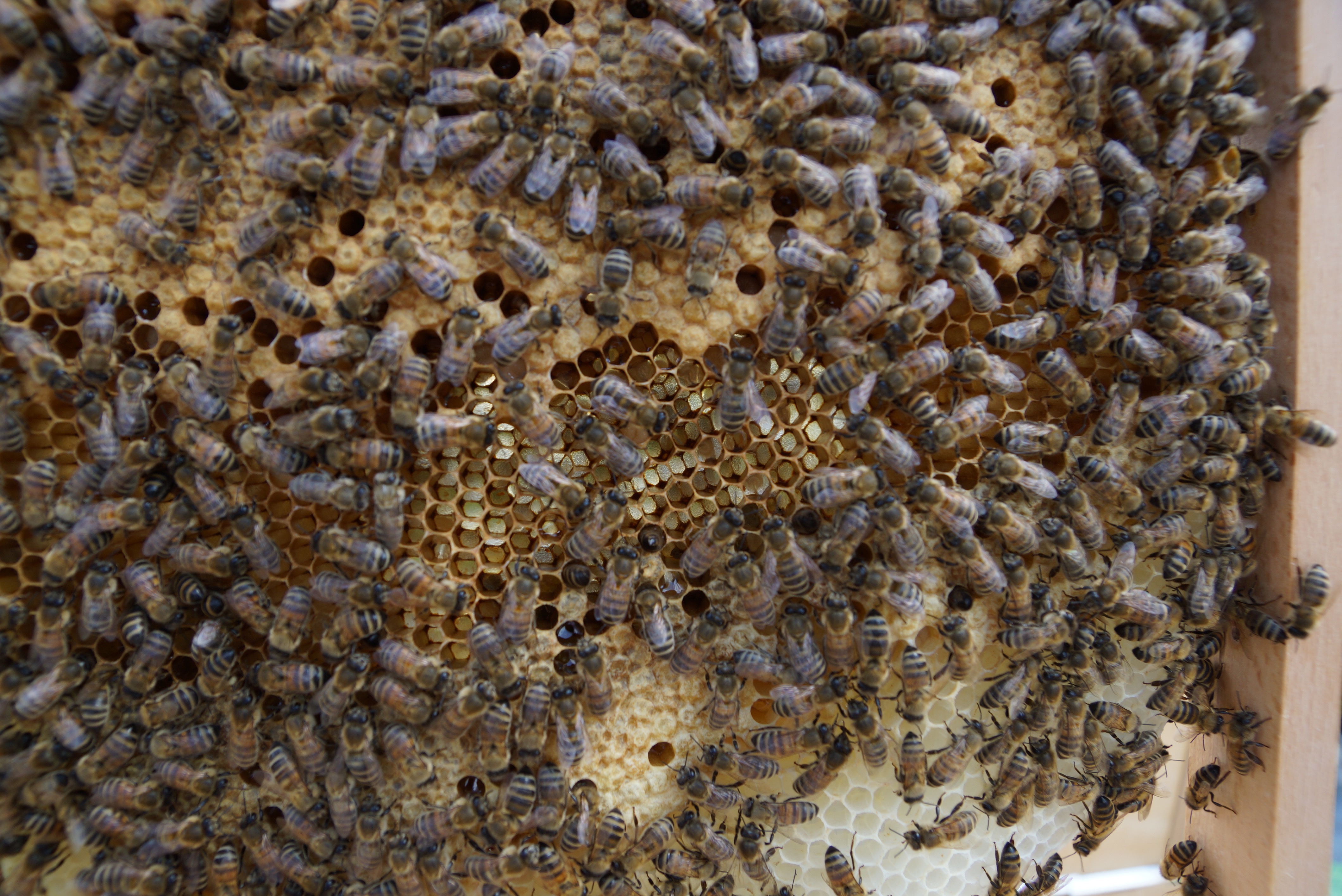 Ansonsten bin ich mit der Entwicklung recht zufrieden. Sie haben sehr fleissig gebaut, sehr viel Honig eingetragen (oben ist er auch schon verdeckelt) und inzwischen auch ein Brutnest angelegt. Die erste Brut ist auch schon verdeckelt (in der Mitte der Wabe zu sehen).