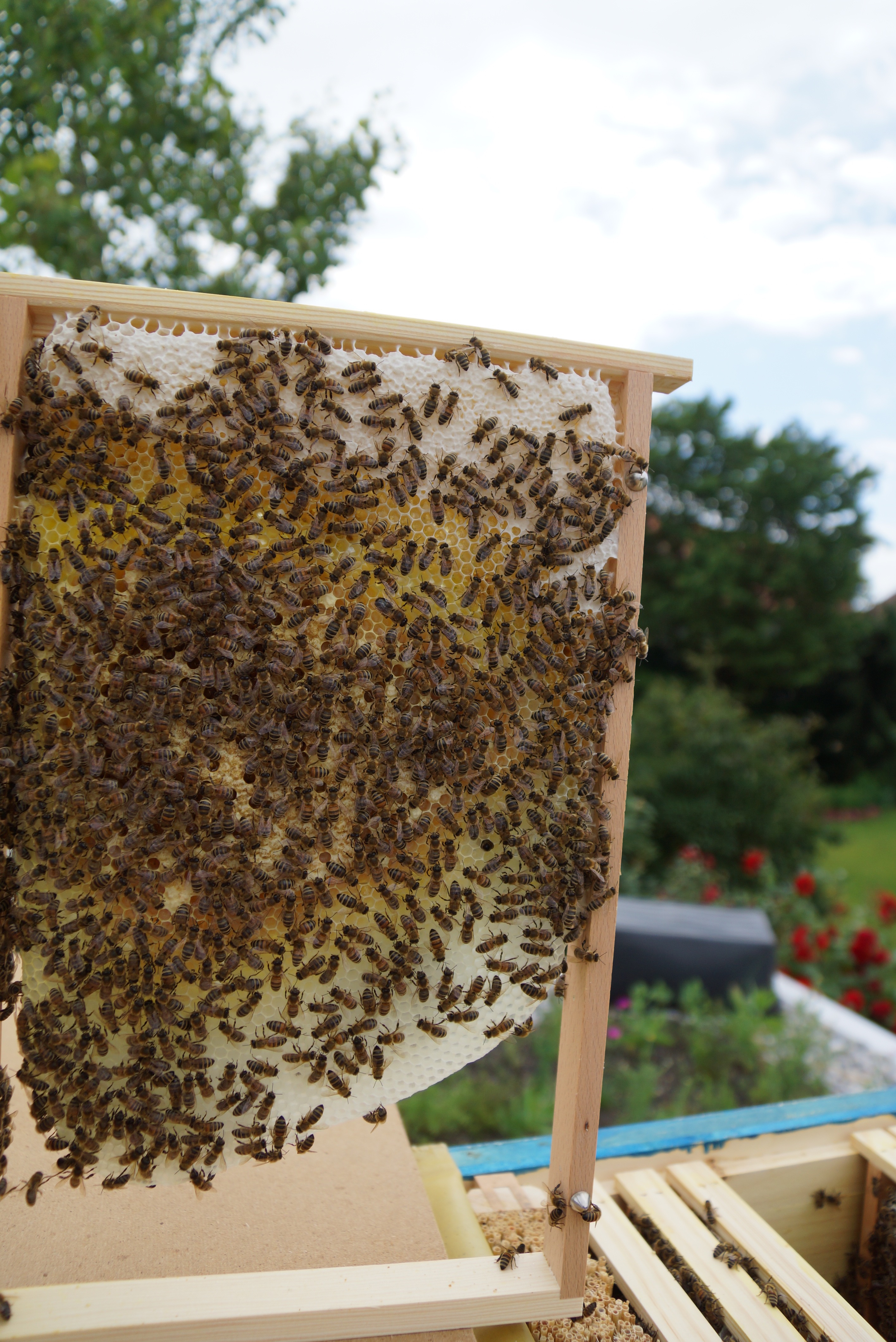 Der Wabenbau geht in dieser Beute weiter etwas schleppend voran, so dass die Waben relativ voll mit Bienen sind. Inzwischen sitzt auch dieses Volk auf 9 Rähmchen, davon eines ganz frisch hinzugefügt. Ich hoffe sie geben noch einmal ein wenig mehr Gas beim Bauen, sonst wird es bald (wieder) zu eng…