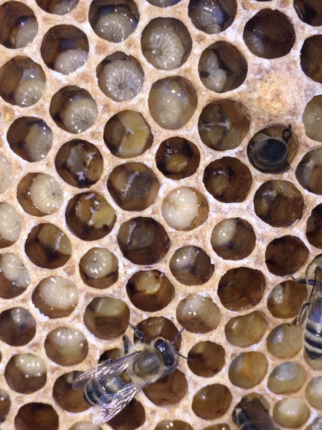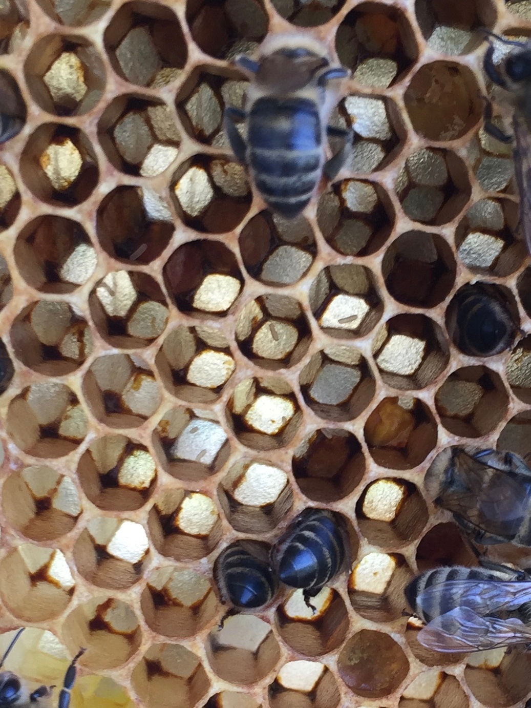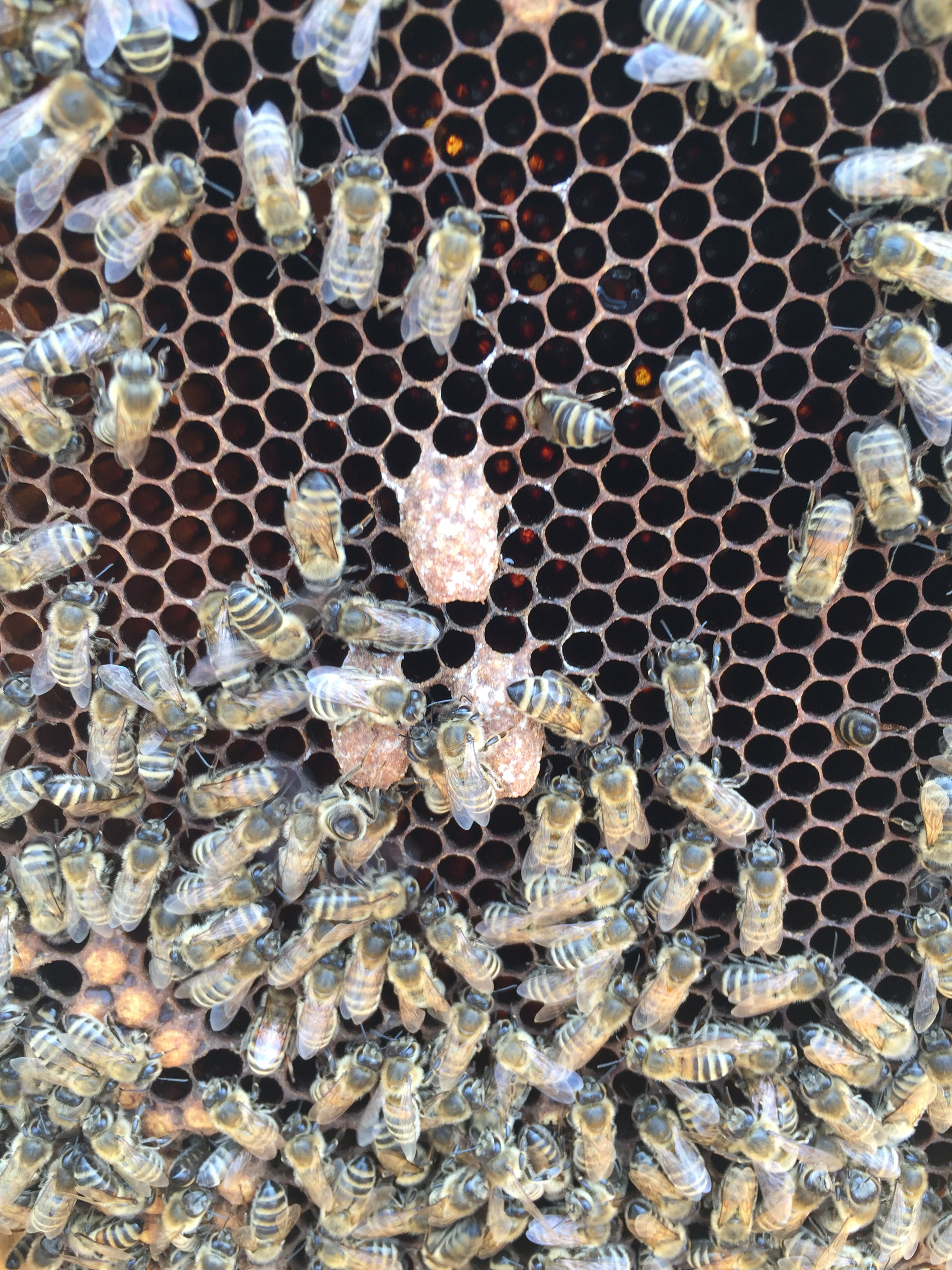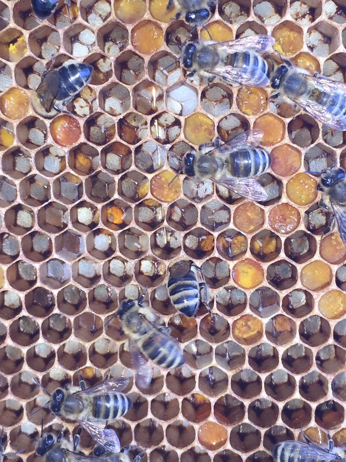 Ein paar Tage später waren sie bei der kurzen Kontrolle etwas laut, eine Woche später aber nicht mehr. Leider war weder Königin noch Brut zu entdecken. Eine weitere Woche später hatte ich ein echt gutes Gefühl, da das Volk ruhig und organisiert wirkte. Vereinzelt waren Pollensammlerinnen zu sehen. Und dann auch Stifte – in den Drohnenzellen, noch dazu viele in einer Zelle, zum Teil am Rand, zum Teil am Boden. Nur ganz wenige Arbeiterinnenzellen waren bestiftet, und auch hier waren alle möglichen Varianten zu sehen, zu viele Stifte, Stifte am Zellrand, und ganz vereinzelt auch mal ein Ei am Boden. Oh je, das sieht leider sehr nach Drohnenbrütigkeit wegen Weisellosigkeit aus… 😦 Ich nahm mir vor, noch ein paar Tage abzuwarten, da wohl junge Königinnen am Anfang schon mal solche Legemuster zeigen können. Sie müssen auch erst mal üben. In der Zwischenzeit machte ich mich schon mal auf die Suche nach einer geeignete Ersatzkönigin, falls meine Befürchtungen sich bestätigen würden…