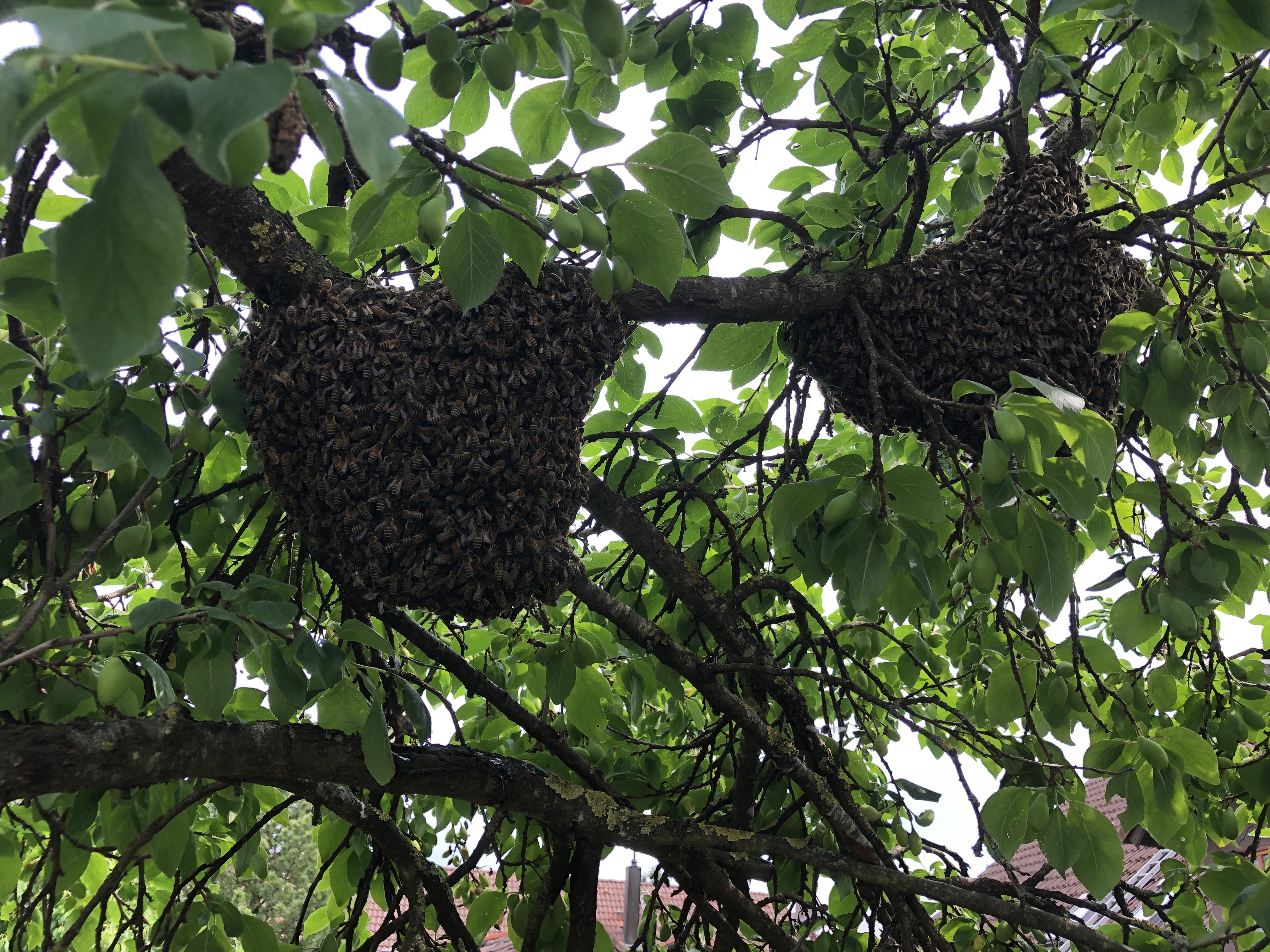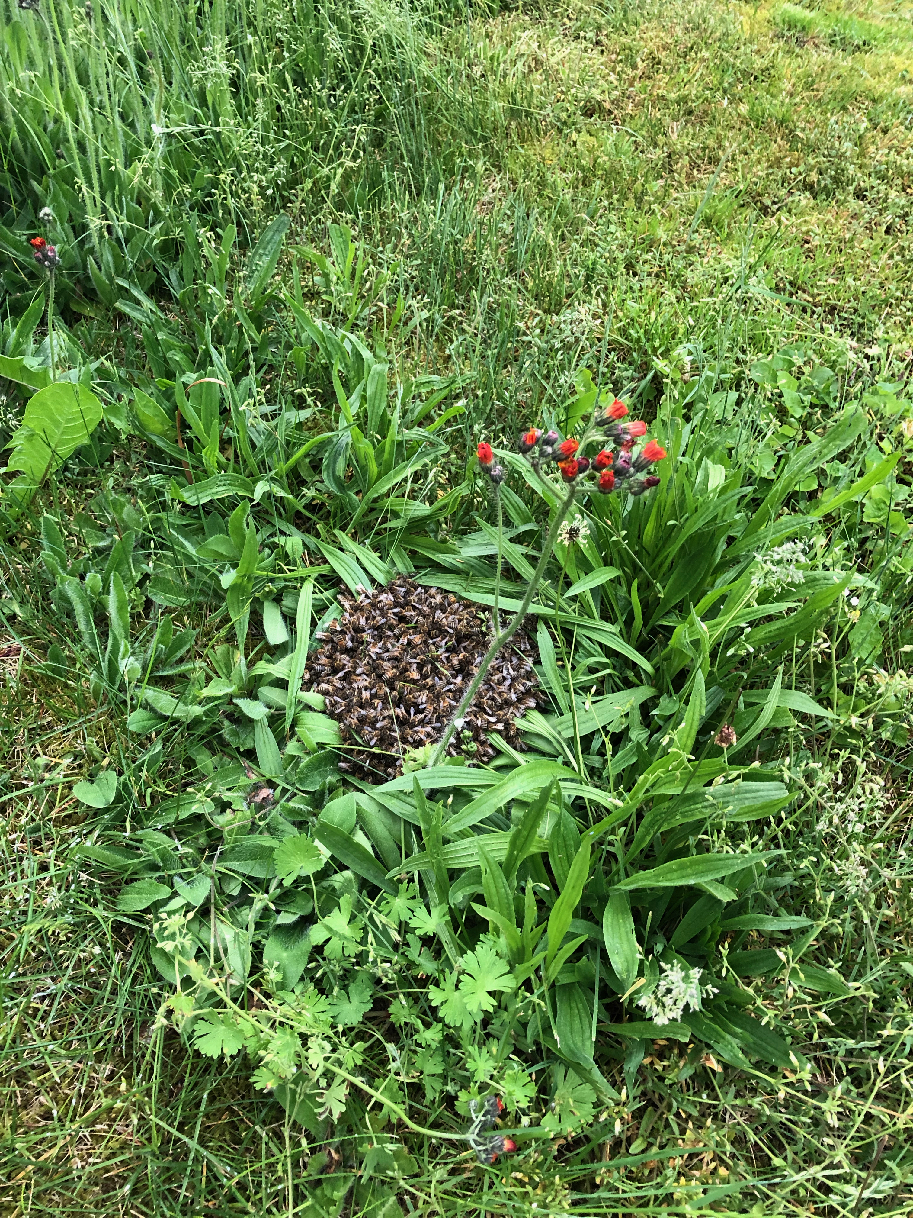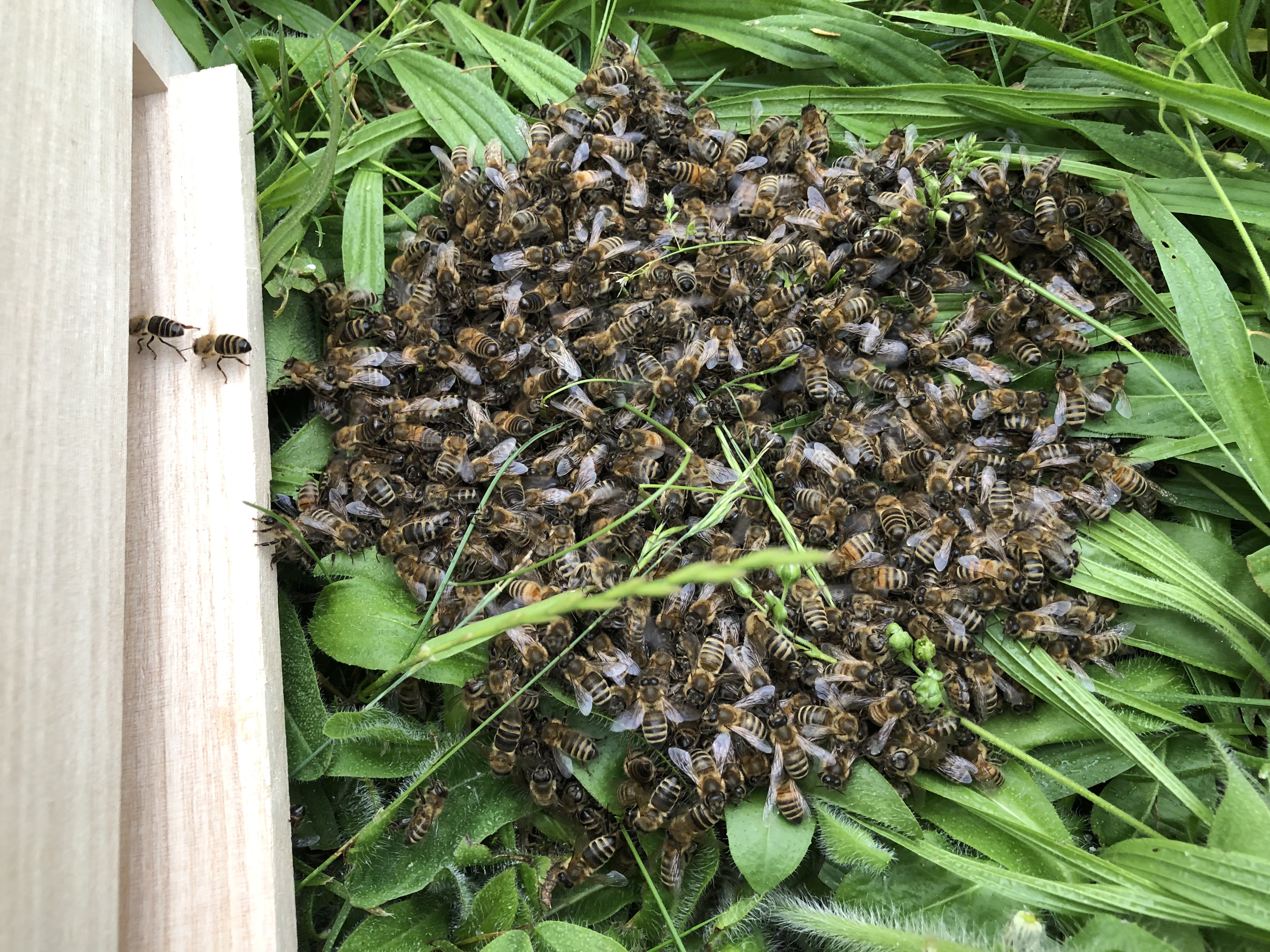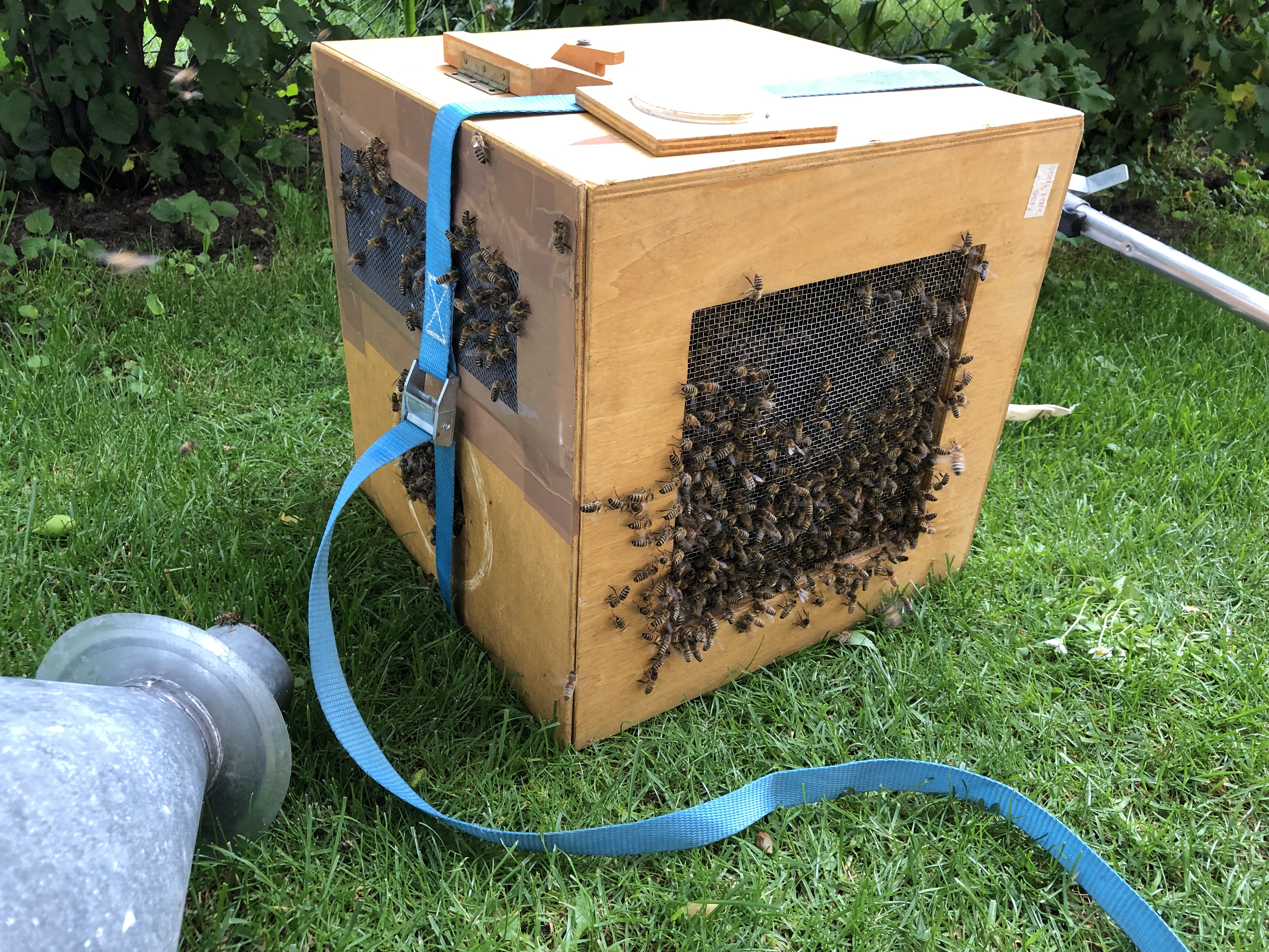 Am 9. Juni kam von einer Pädagogin der Montessorischule mittags der Anruf „Da hängt ein Bienenschwarm im Schulgarten!“. Ich wollte es ja erst gar nicht glauben, dass er „von uns“ sein könnte (die beiden Völker hatten am 17. bzw. 19. Mai geschwärmt). So spät noch Nachschwärme? Andererseits ist der nächste Imker ja auch nur einen Steinwurf entfernt, vielleicht war er ja doch nicht von uns. Das Wetter war noch dazu alles andere als Schwarmwetter, es war kalt regnete immer wieder. Das kam mir alles etwas seltsam vor. Das gar nicht mal so kleine Schwärmchen hing an einem der Gemüsehochbeete und war nicht so ganz leicht in die Kiste zu bewegen. Ich musste schon schmunzeln, weil ich beim letzten Schwarm gedacht hatte, dass er niedrig hing – die hier hingen eigentlich schon nicht mehr, die lagen! Aber auch kein Wunder bei dem Mistwetter…