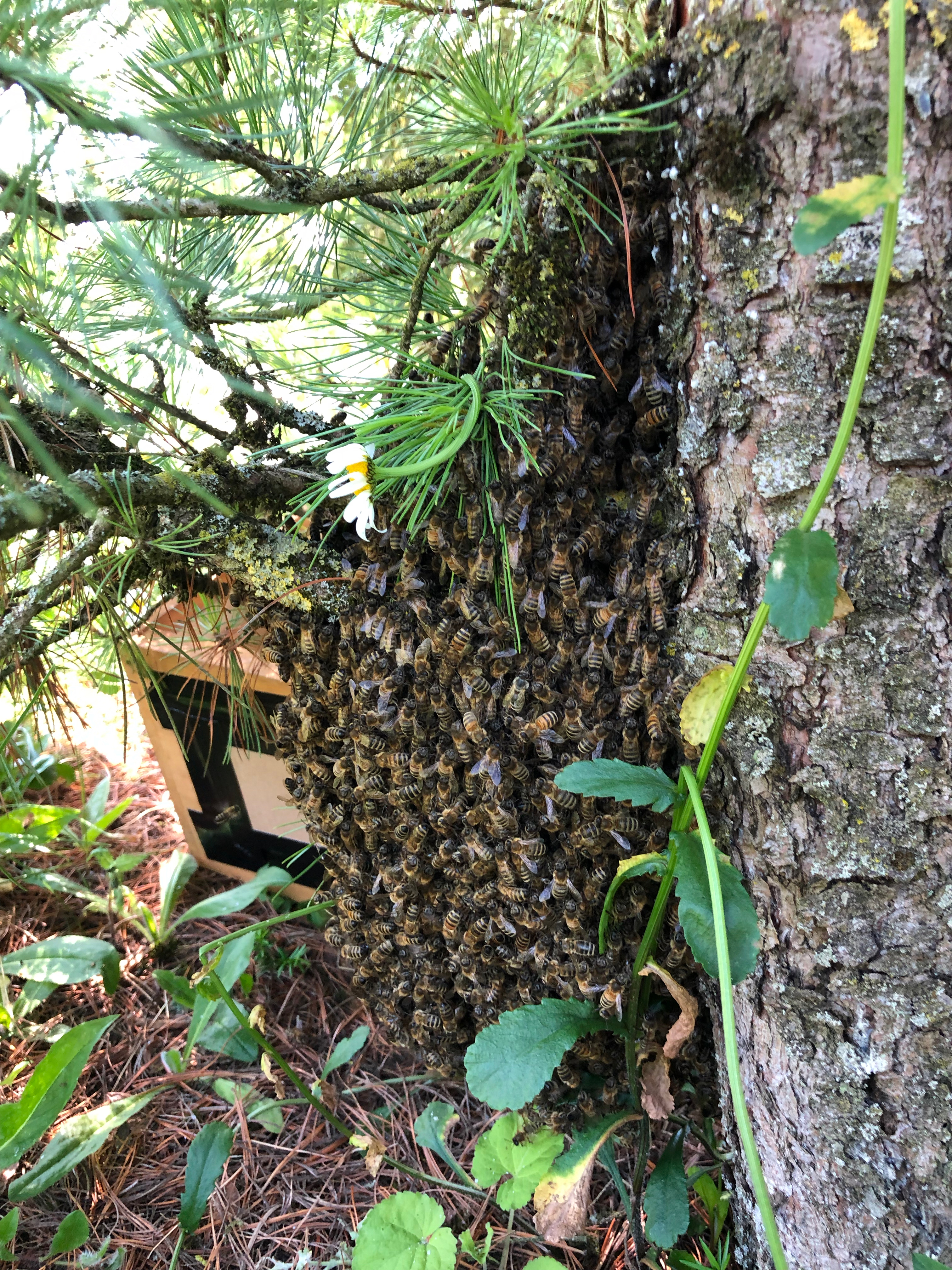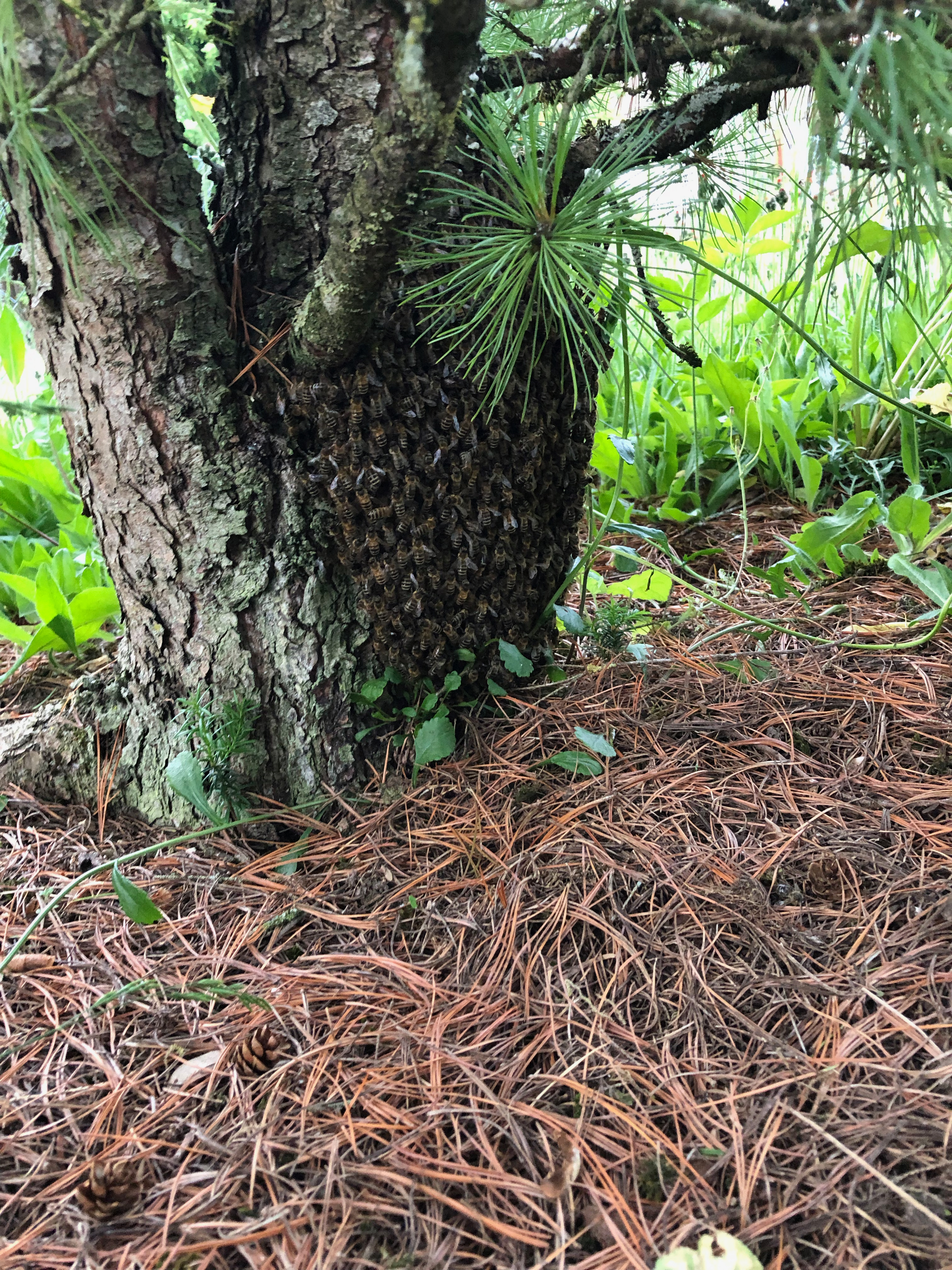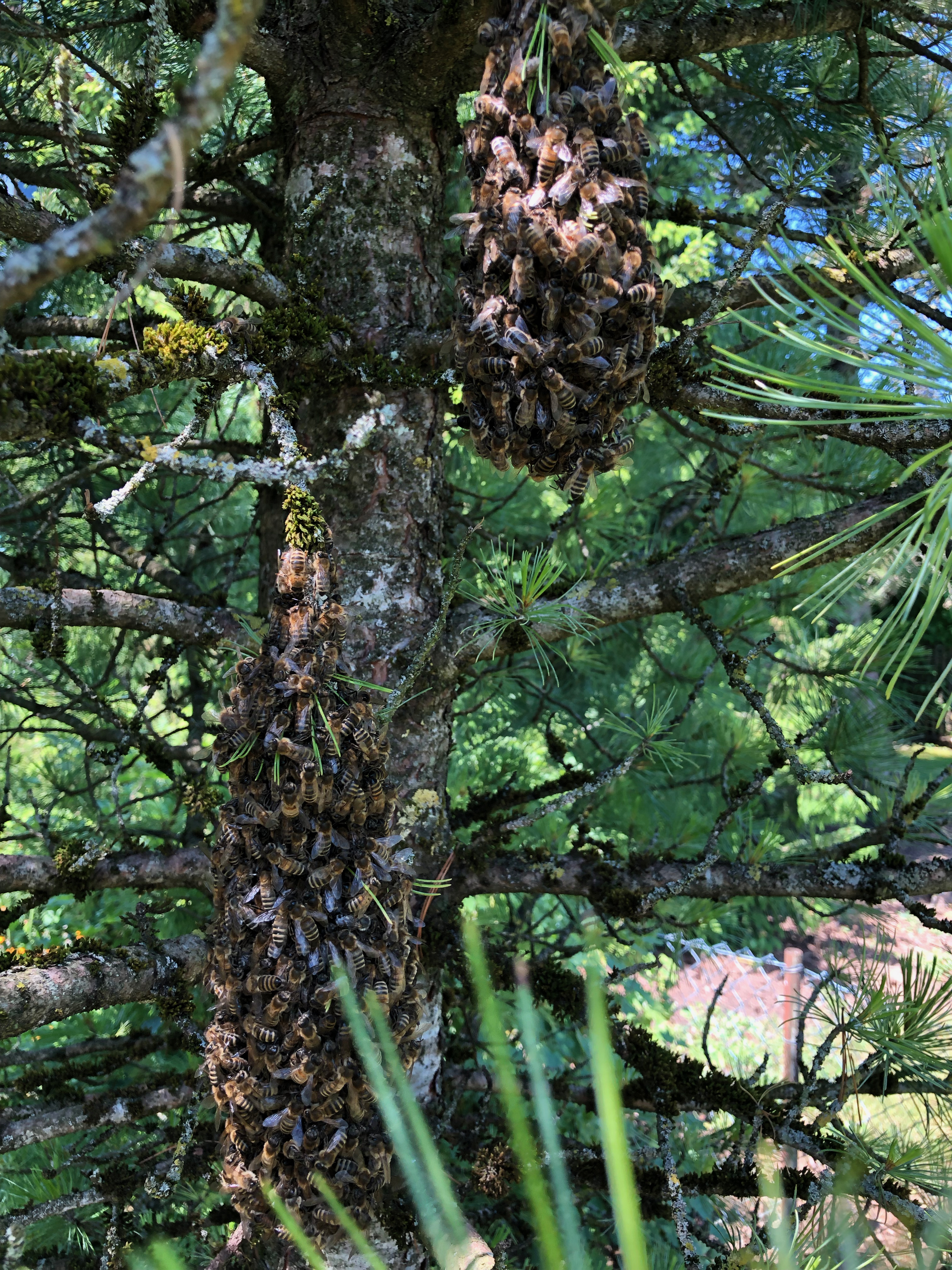 Am 9. Juni kam von einer Pädagogin der Montessorischule mittags der Anruf „Da hängt ein Bienenschwarm im Schulgarten!“. Ich wollte es ja erst gar nicht glauben, dass er „von uns“ sein könnte (die beiden Völker hatten am 17. bzw. 19. Mai geschwärmt). So spät noch Nachschwärme? Andererseits ist der nächste Imker ja auch nur einen Steinwurf entfernt, vielleicht war er ja doch nicht von uns. Das Wetter war noch dazu alles andere als Schwarmwetter, es war kalt regnete immer wieder. Das kam mir alles etwas seltsam vor. Das gar nicht mal so kleine Schwärmchen hing an einem der Gemüsehochbeete und war nicht so ganz leicht in die Kiste zu bewegen. Ich musste schon schmunzeln, weil ich beim letzten Schwarm gedacht hatte, dass er niedrig hing – die hier hingen eigentlich schon nicht mehr, die lagen! Aber auch kein Wunder bei dem Mistwetter…