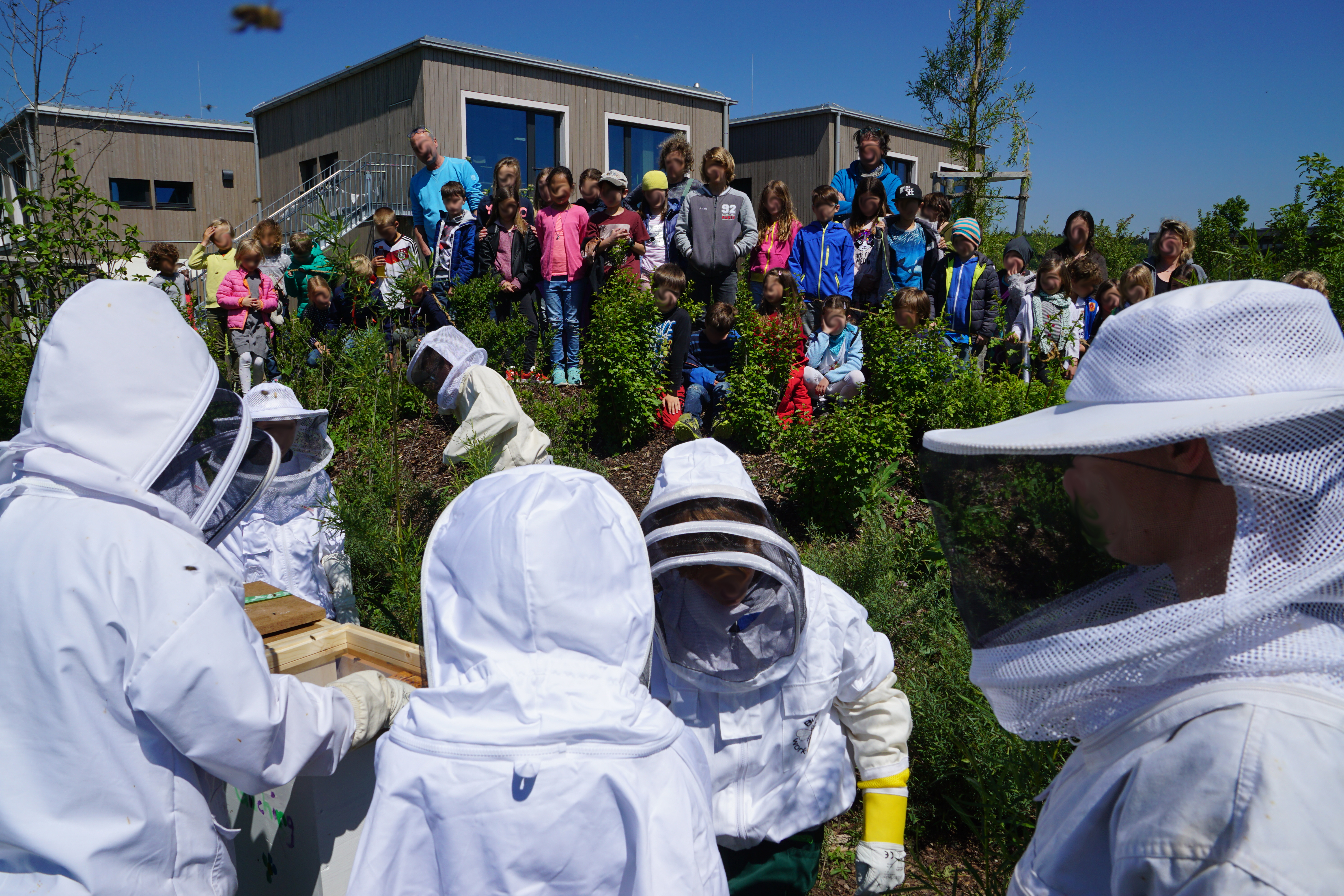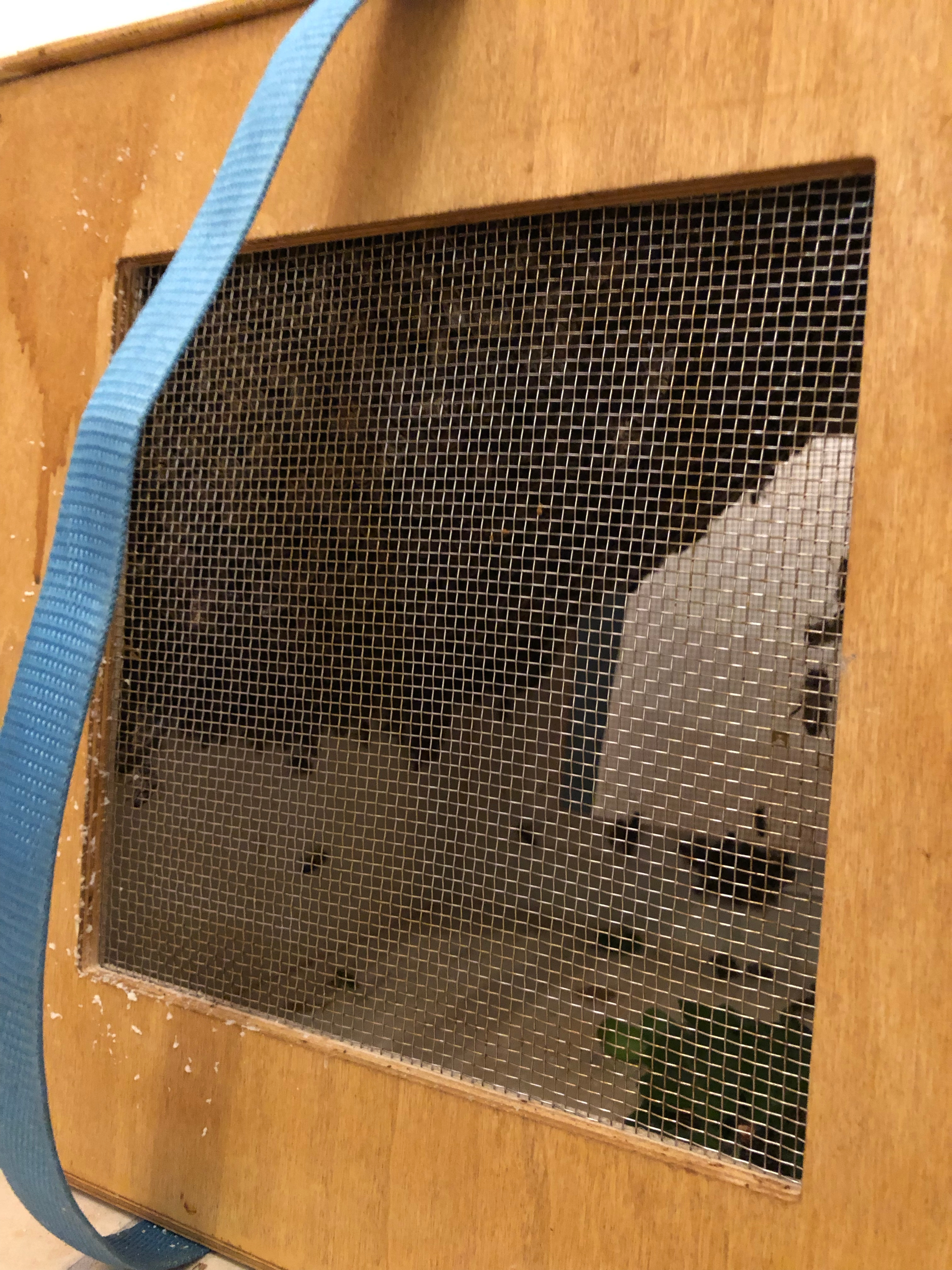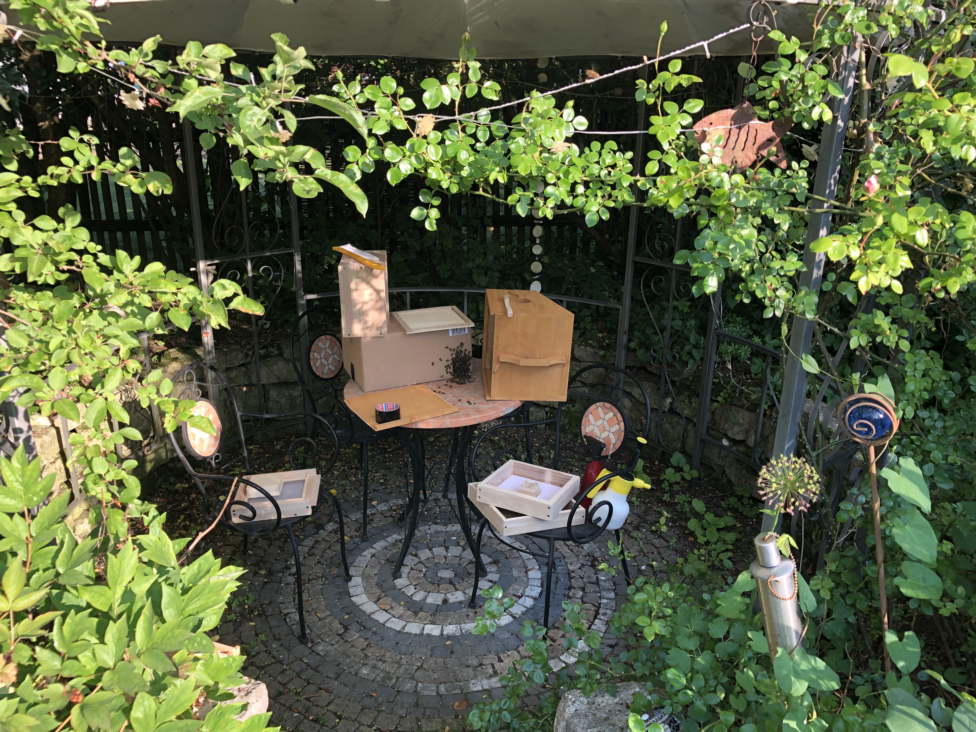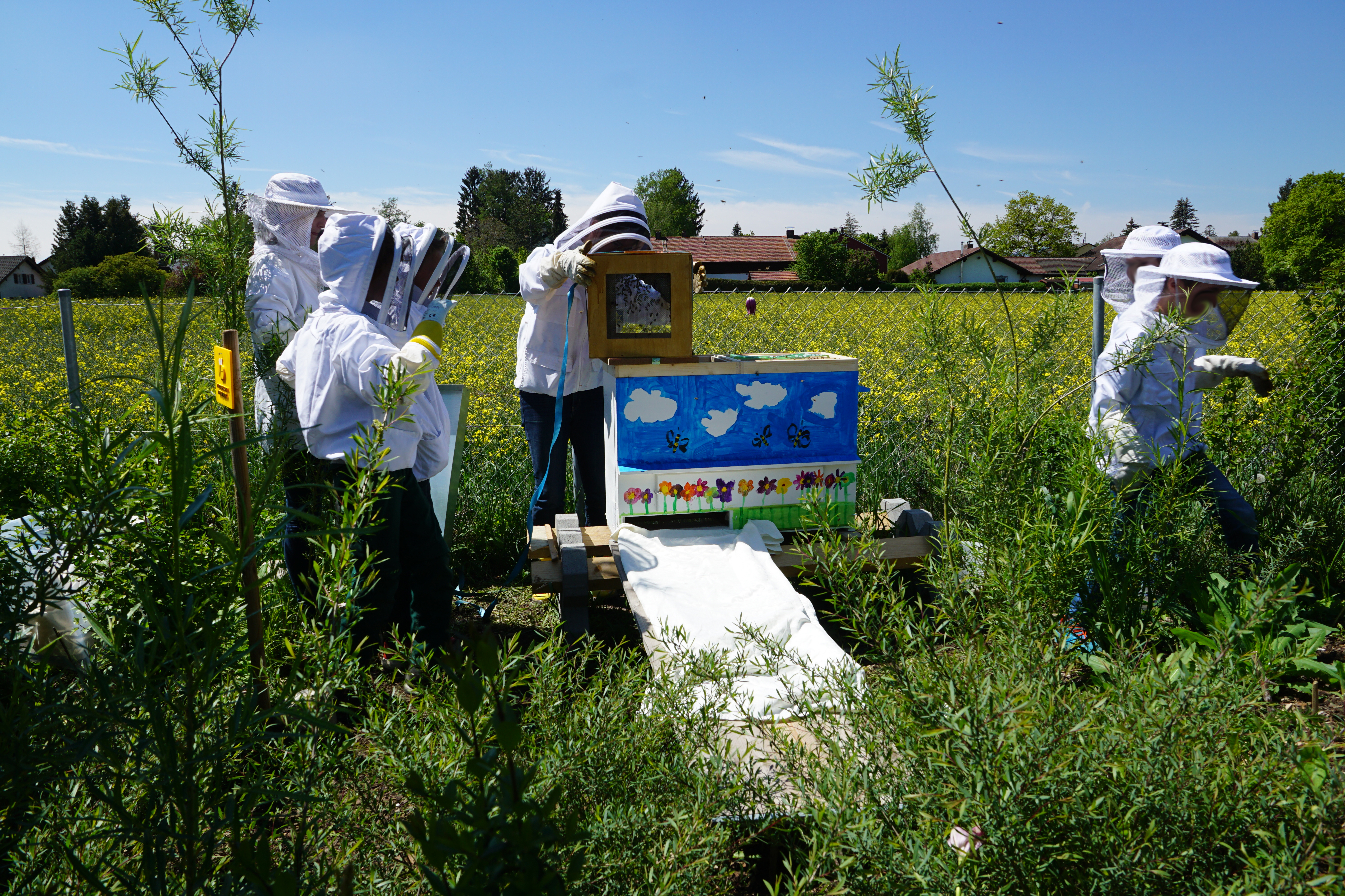 Am 9. Juni kam von einer Pädagogin der Montessorischule mittags der Anruf „Da hängt ein Bienenschwarm im Schulgarten!“. Ich wollte es ja erst gar nicht glauben, dass er „von uns“ sein könnte (die beiden Völker hatten am 17. bzw. 19. Mai geschwärmt). So spät noch Nachschwärme? Andererseits ist der nächste Imker ja auch nur einen Steinwurf entfernt, vielleicht war er ja doch nicht von uns. Das Wetter war noch dazu alles andere als Schwarmwetter, es war kalt regnete immer wieder. Das kam mir alles etwas seltsam vor. Das gar nicht mal so kleine Schwärmchen hing an einem der Gemüsehochbeete und war nicht so ganz leicht in die Kiste zu bewegen. Ich musste schon schmunzeln, weil ich beim letzten Schwarm gedacht hatte, dass er niedrig hing – die hier hingen eigentlich schon nicht mehr, die lagen! Aber auch kein Wunder bei dem Mistwetter…