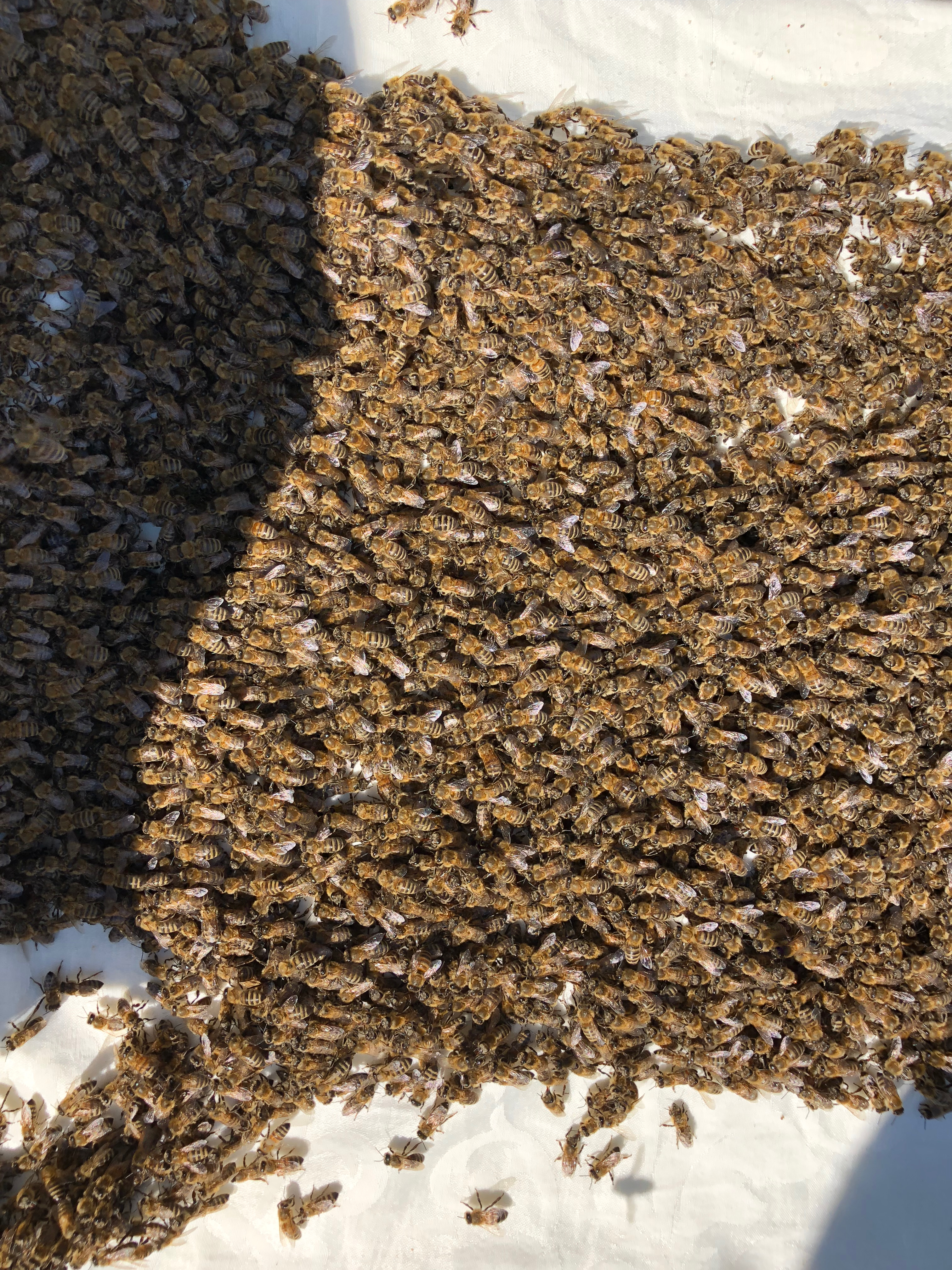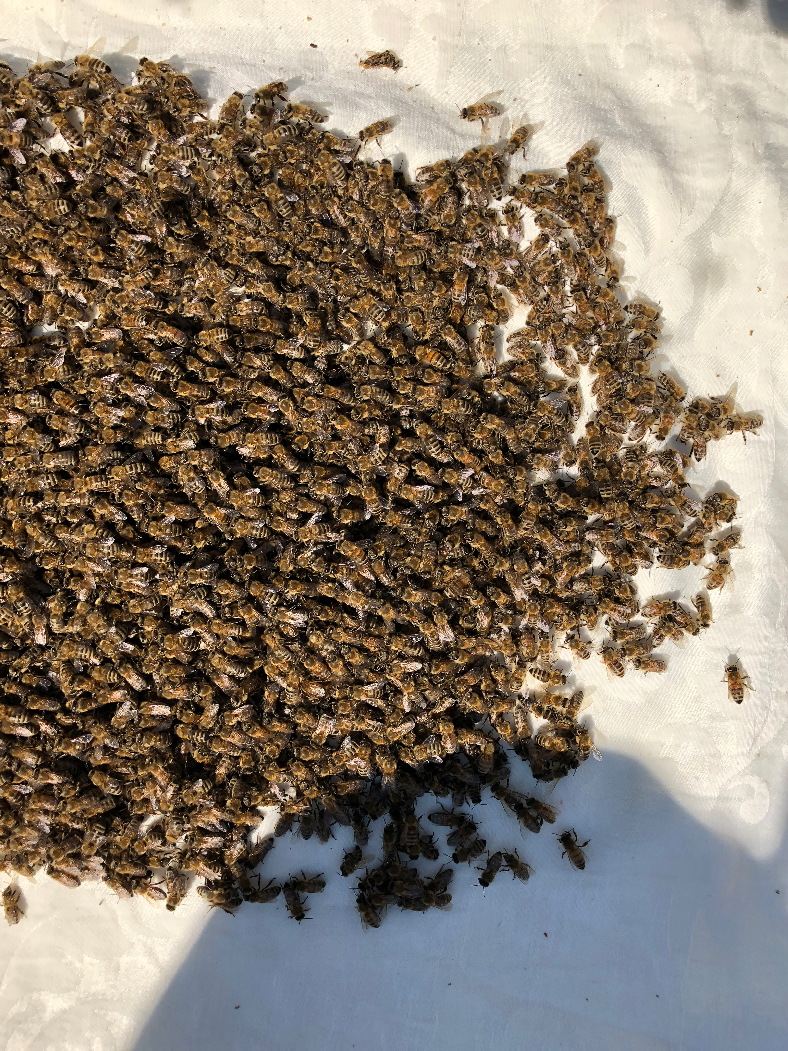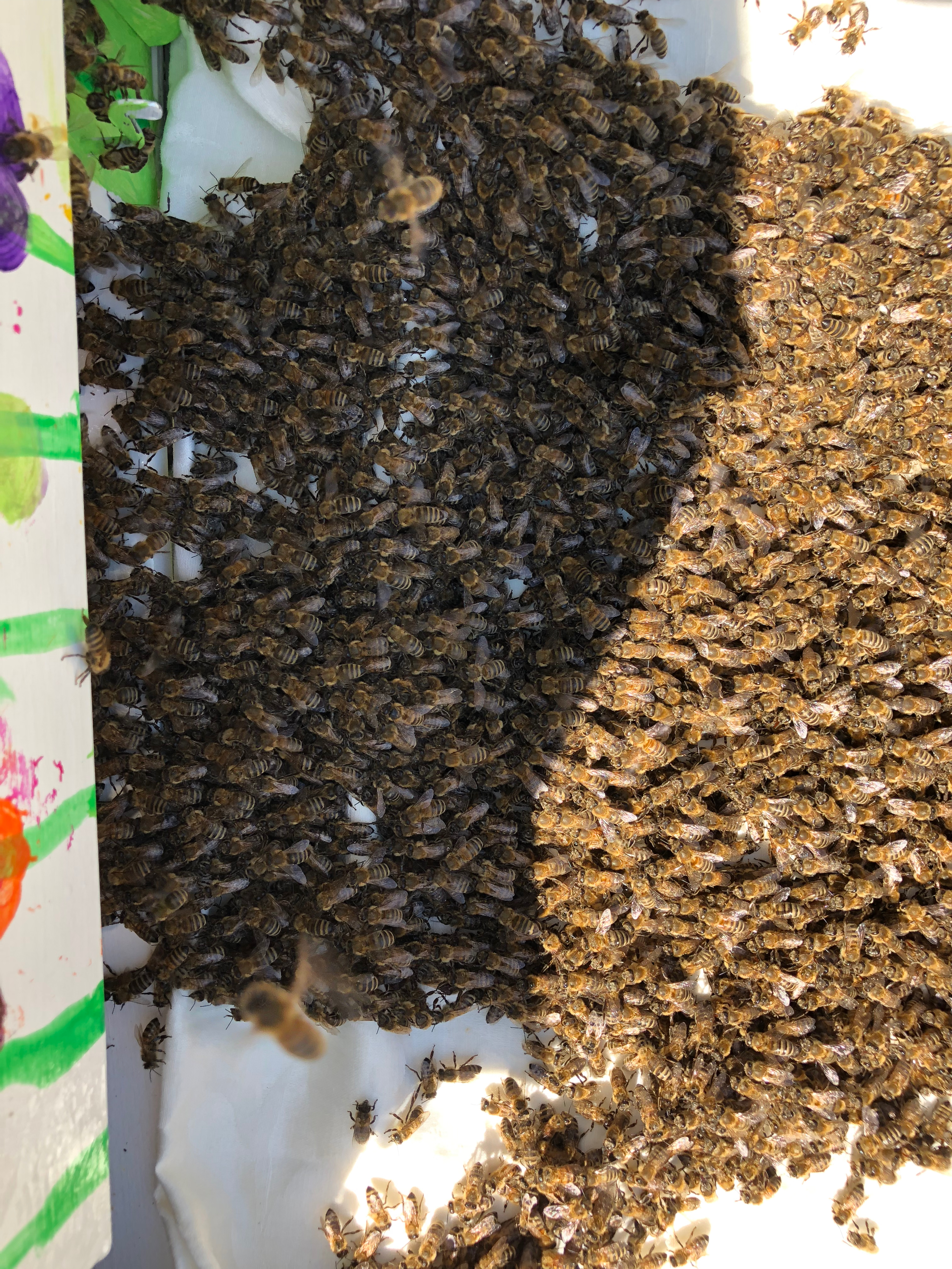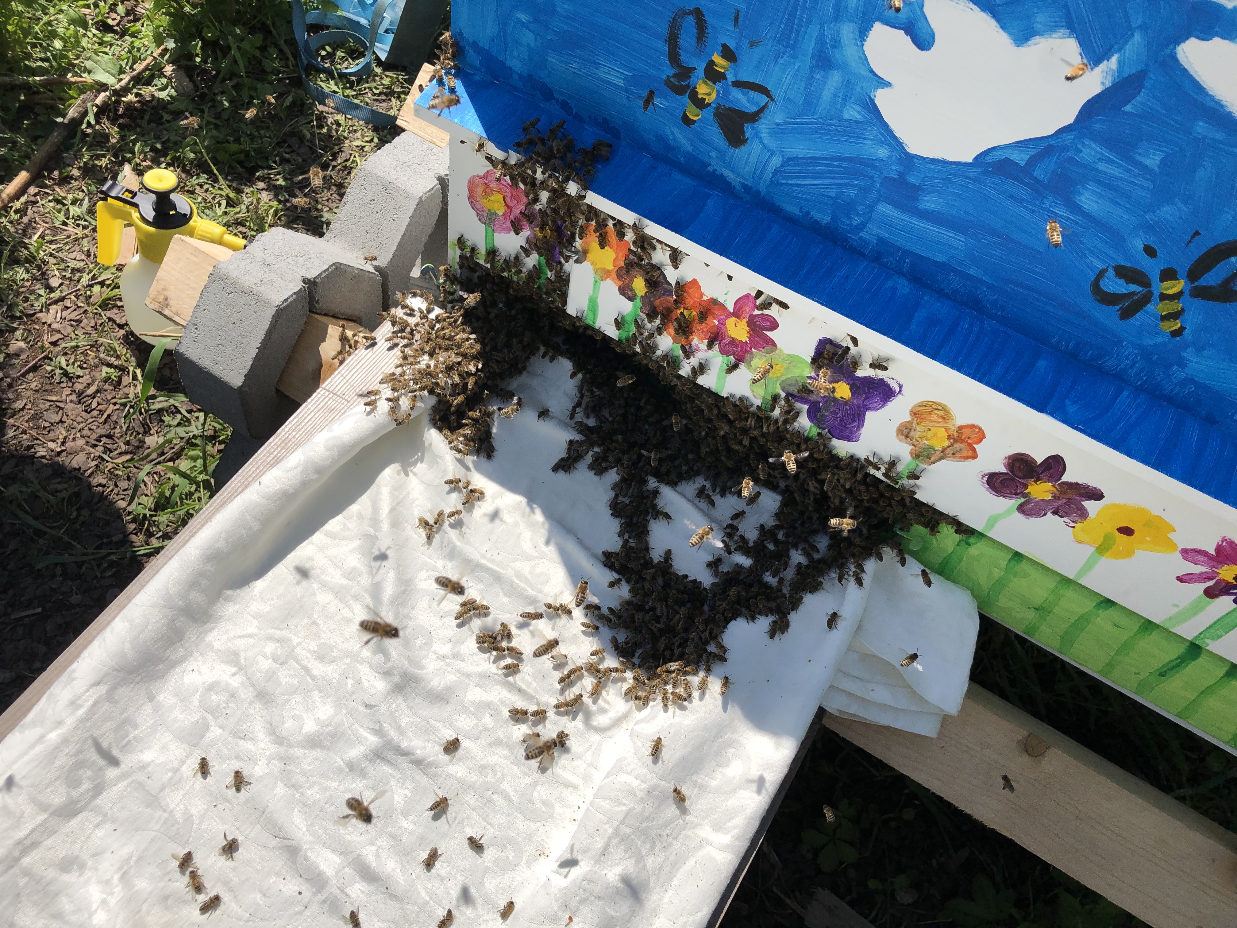 Sie waren schon ein wenig „angepisst“, dass ich sie da jetzt noch herumschieben wollte. Irgendwie ging es aber dann doch – sehr langsam und mit Hilfe von Schaufel und Besen, nachdem ich vorsichtig das „Unkraut“ aus dem Schwarm entfernt hatte. 😉