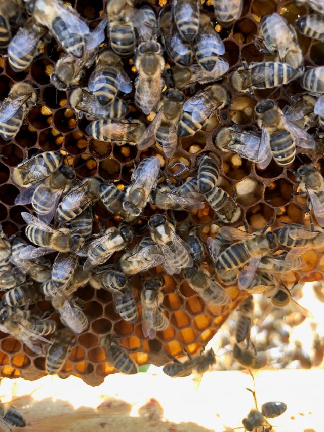 Es muss für das Volk ein immenser Stress gewesen sein, die Wespen ständig abzuwehren, und die Verluste an Arbeiterinnen waren auf Dauer sicherlich auch eine deutliche Schwächung des Volkes. Vermutlich hat darunter auch das Hygieneverhalten der Bienen gelitten – anders kann ich mir die Milbenplage nicht erklären. Aufgrund des Schwarms hatten wir ja ohnehin eine brutfreie Zeit, in der die Milben natürlich reduziert werden. Und bei allen anderen Völkern war die zweifache Behandlung erfolgreich gewesen. Auch bei den direkten Nachbarn. Ich hatte beide Schulvölker auch extra schon nur mit Invertzuckersirup gefüttert, um nicht noch mehr Wespen durch den verführerischen Honigduft meiner normalen Futtermischung anzulocken.
