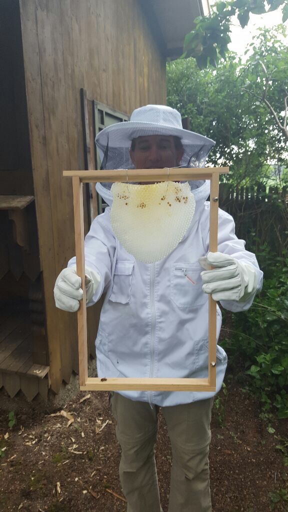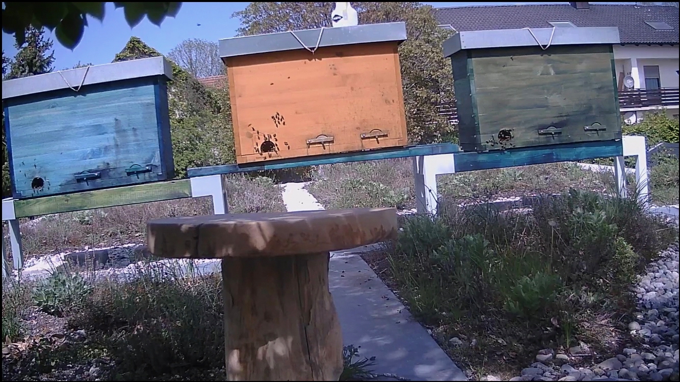 Bei der letzten Durchsicht beim blauen Volk gab es ein paar interessante Beobachtungen. Da dieses Volk bislang nicht schwärmen wollte, aber gebrütet und gebaut hat wie die Weltmeister, habe ich mir zum Testen mal von Markus die Honigräume für die Janisch-ERB ausgeliehen. Bei jeder Durchsicht musste ich Wildbau unterhalb der normalen Rähmchen unter dem Brutnest entfernen. Die Kiste quillt auch schier über vor Bienen: