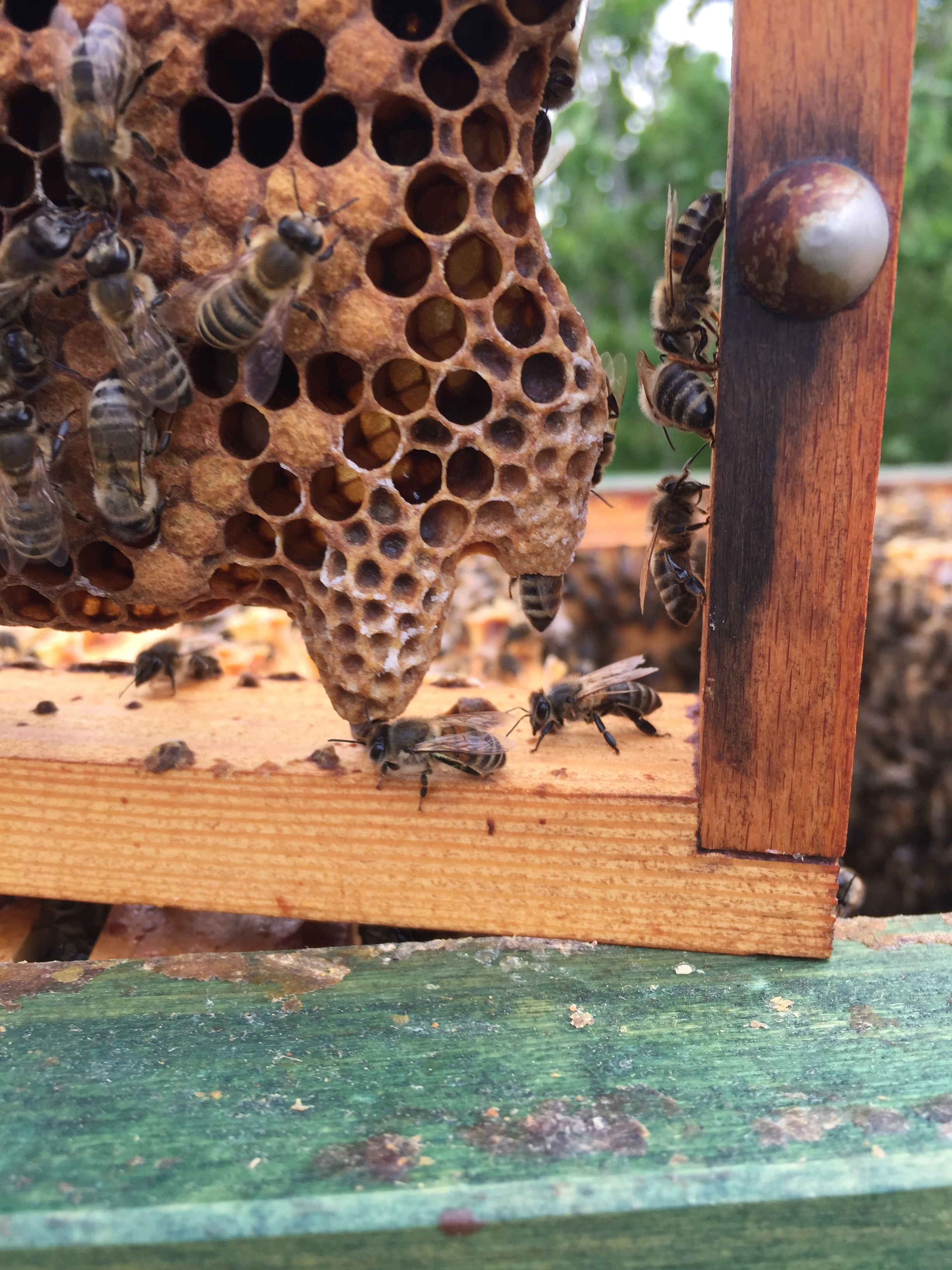 Das sieht in meinen Augen sehr nach einer Nachschaffungszelle aus! (Oben habe ich sie leider vor dem Foto kaputt gemacht). Auf der Nachbarwabe spazierte Königin Blandina I. ganz gemütlich herum, und Stifte waren auch vorhanden!